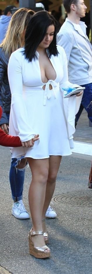 Ariel Winter lleva un vestido blanco sexy con un gran escote para Santa en The Grove en Los Ángeles, 18/12/16. Ariel Winter Workman es una actriz (Dog Years (2017)), cantante, modelo de Los Ángeles (EE.UU.). Edad: 18 (28 de enero de 1998).