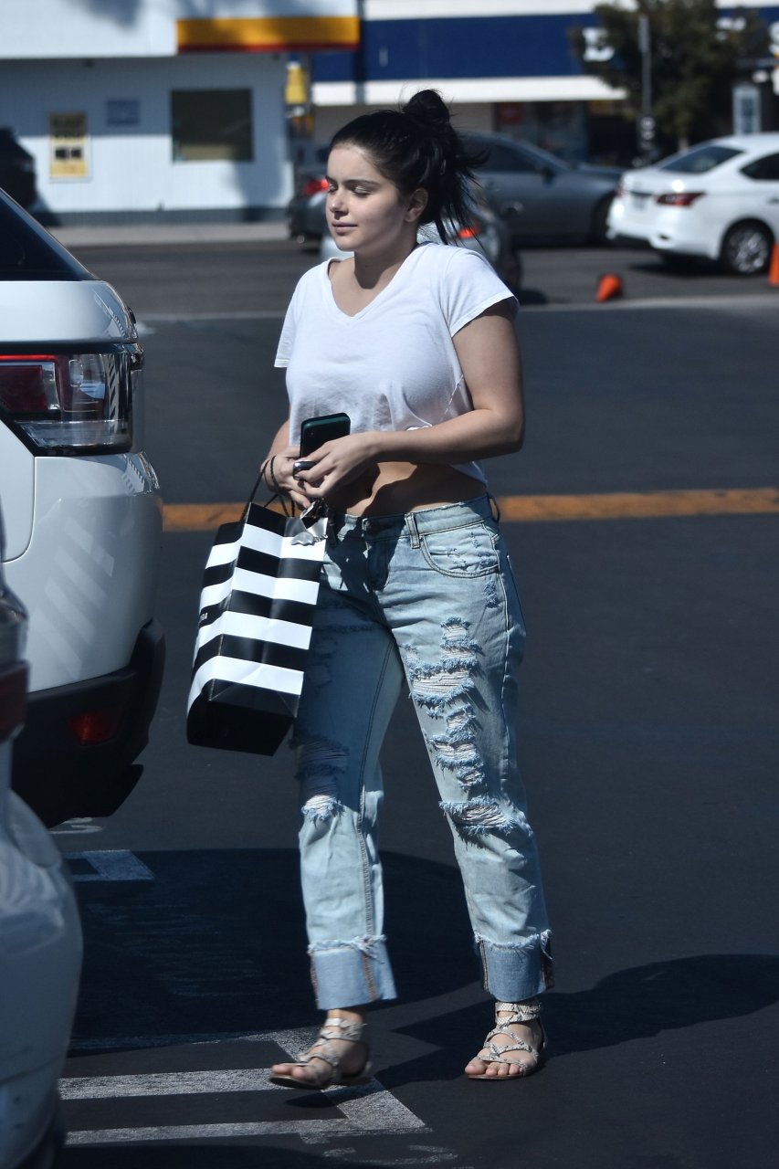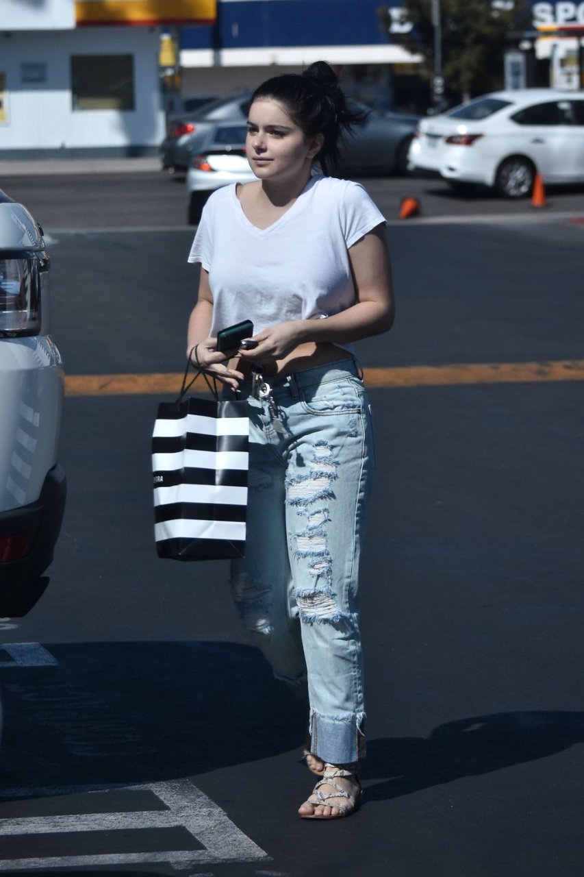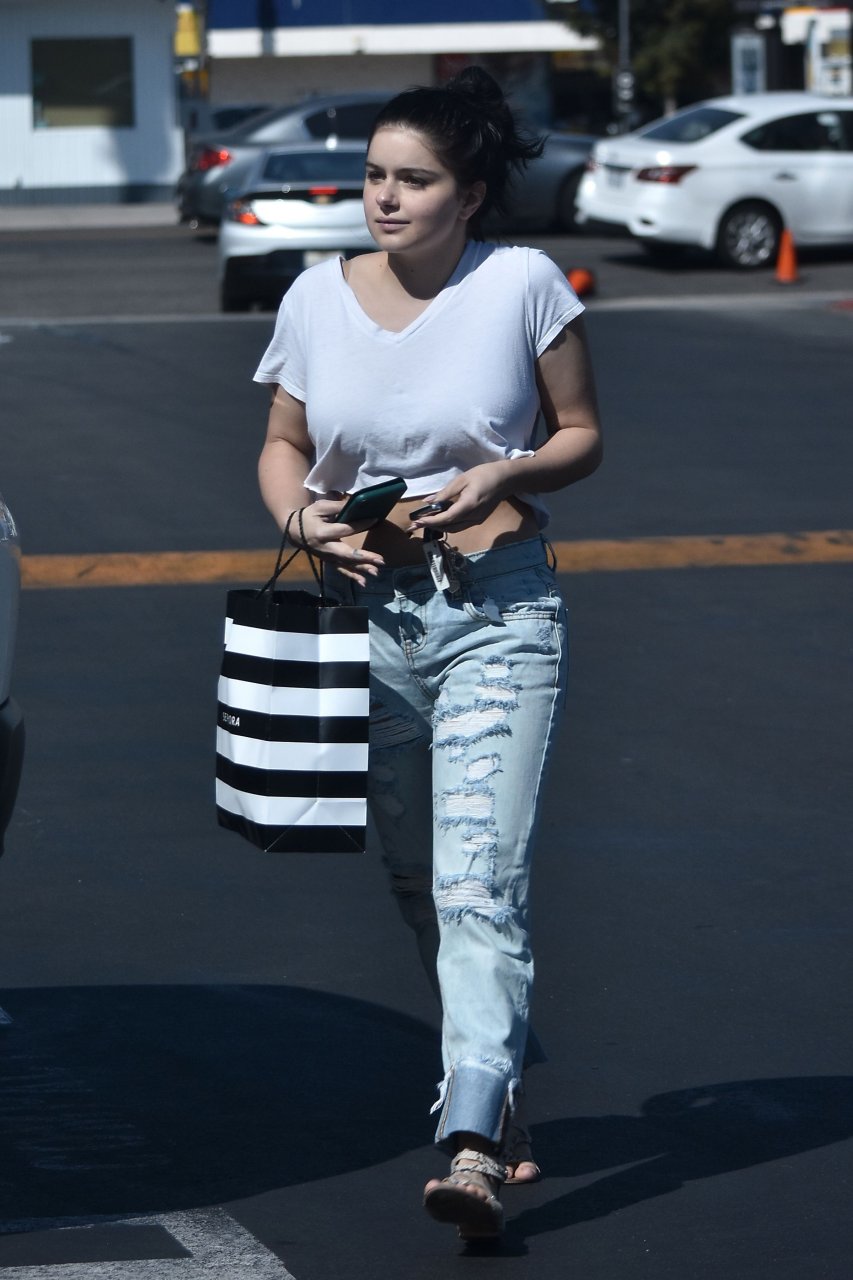 Ariel Winter muestra su abdomen en una camiseta blanca corta y jeans bajos mientras hace algunas compras en Sephora en Los Ángeles, 10/05/2018. La actriz de 20 años de “Modern Family” fue vista sin maquillaje, con el cabello recogido en un moño alto, mostrando su vientre plano mientras caminaba hacia su auto después de hacer algunas compras en Sephora.