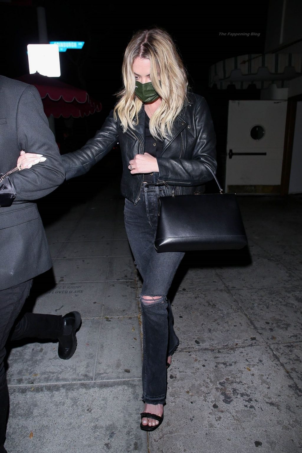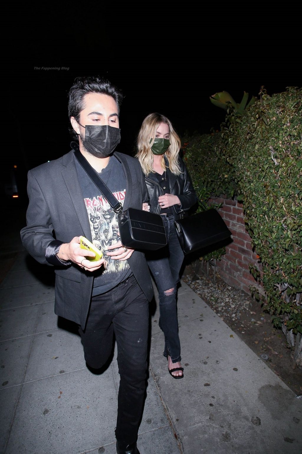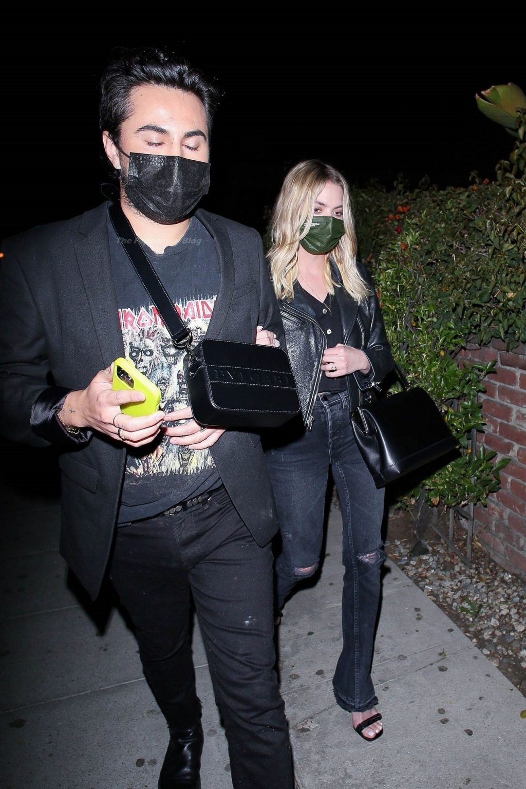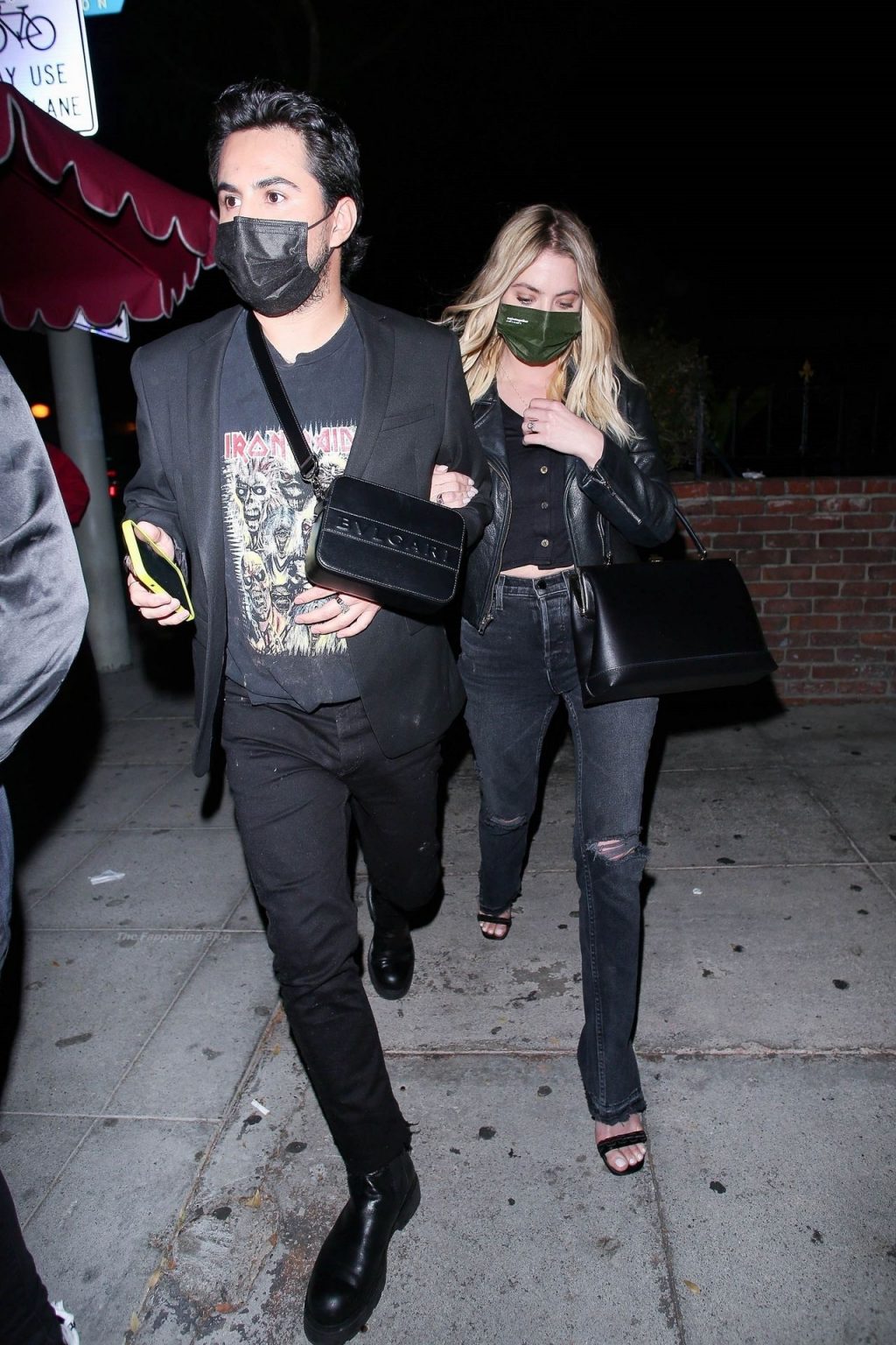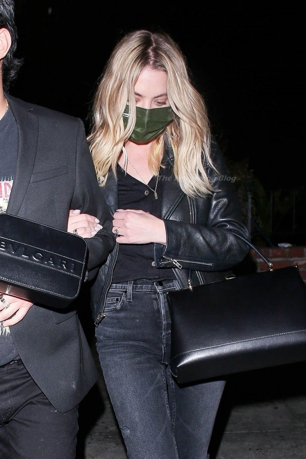 La estrella de The Fappening Ashley Benson mantiene la cabeza baja mientras se agarra a una amiga al salir de una noche en Delilah en West Hollywood, 04/04/2021.