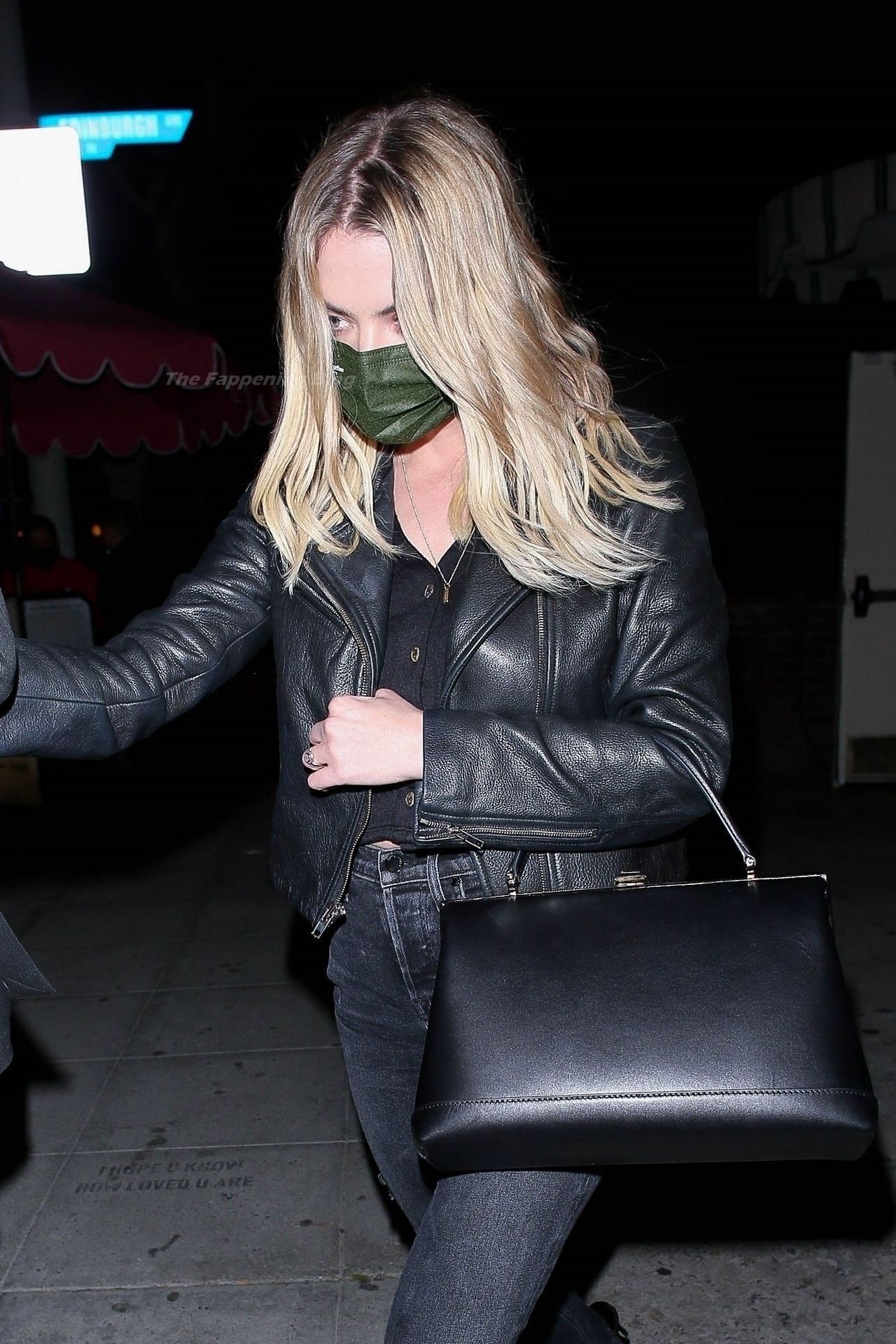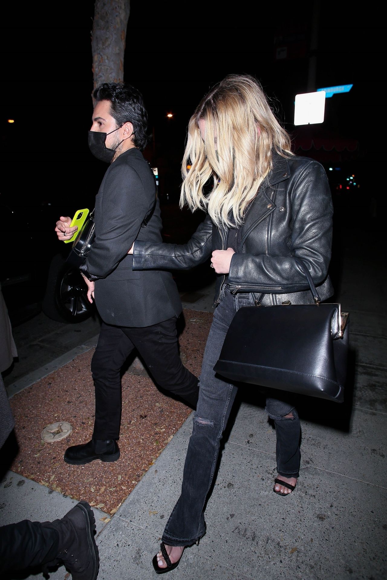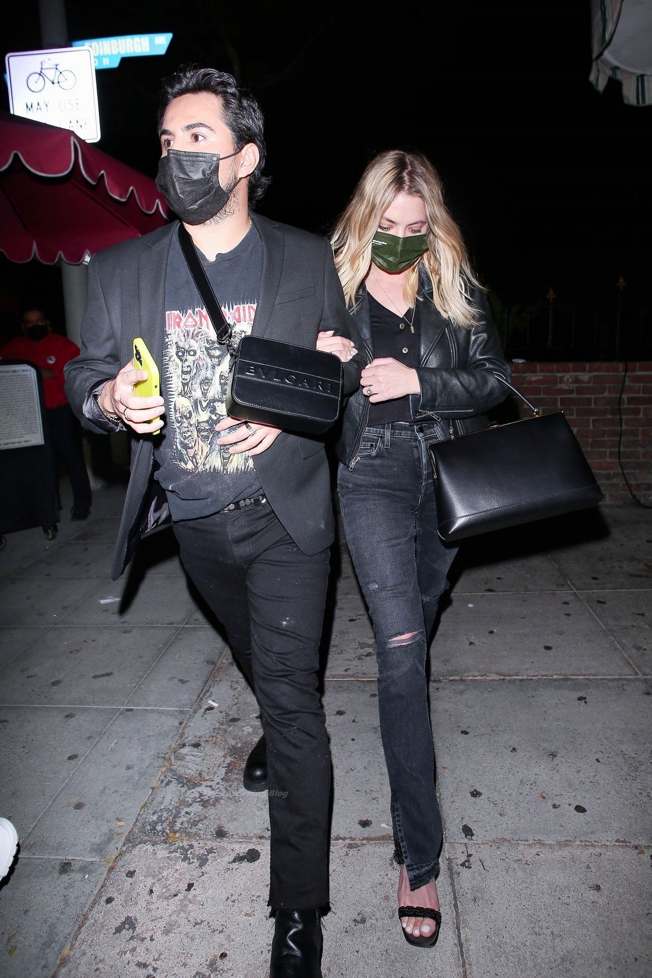 La estrella de The Fappening Ashley Benson mantiene la cabeza baja mientras se agarra a una amiga al salir de una noche en Delilah en West Hollywood, 04/04/2021.