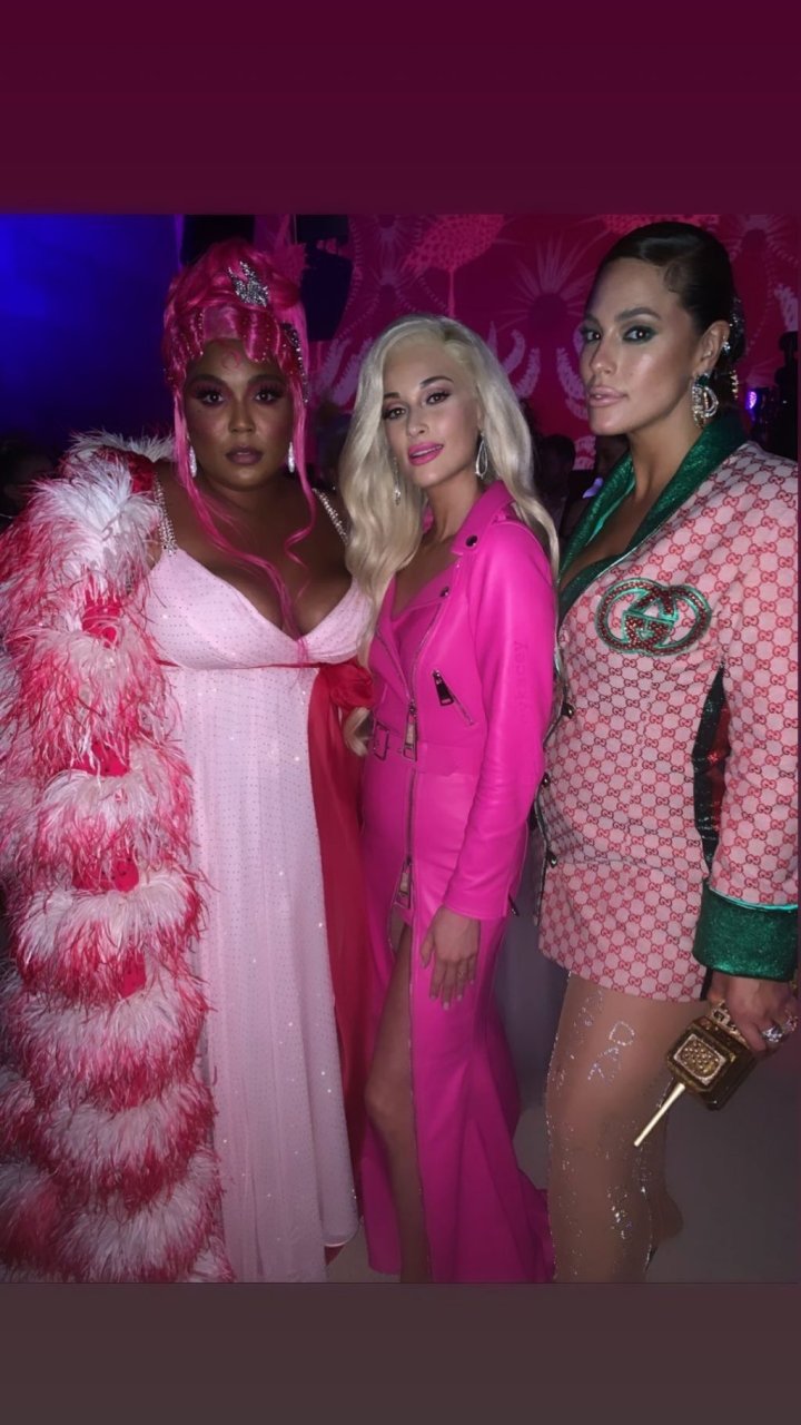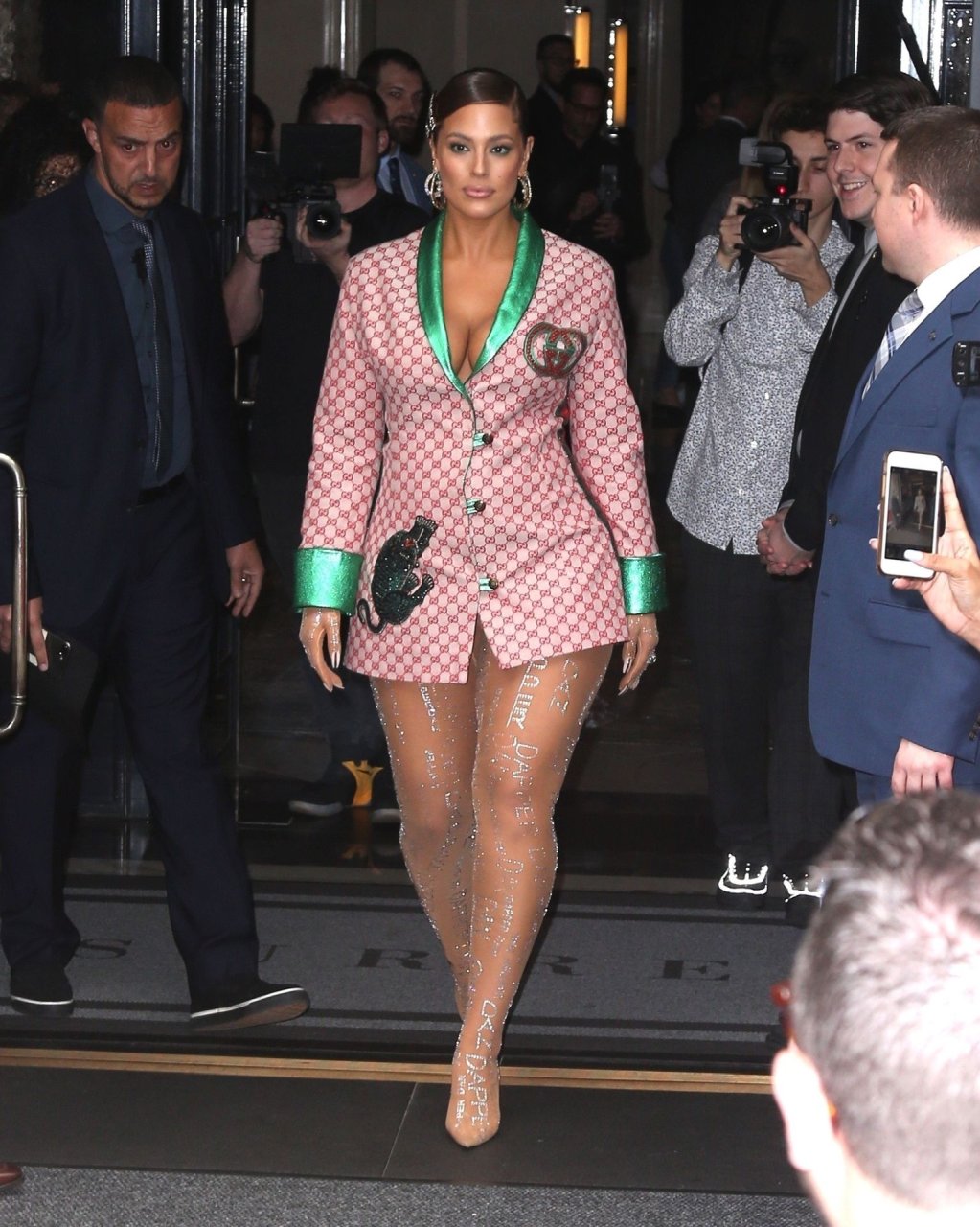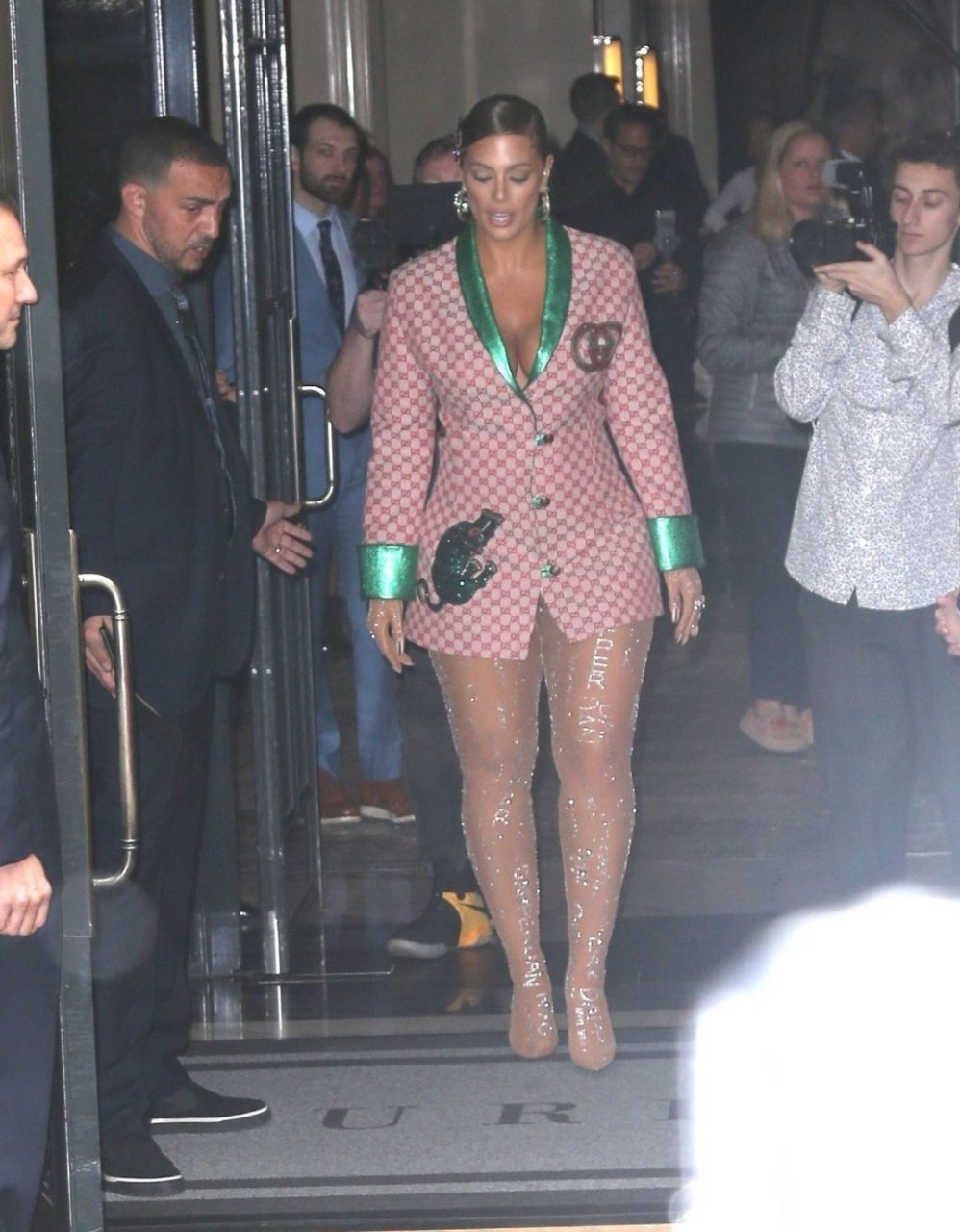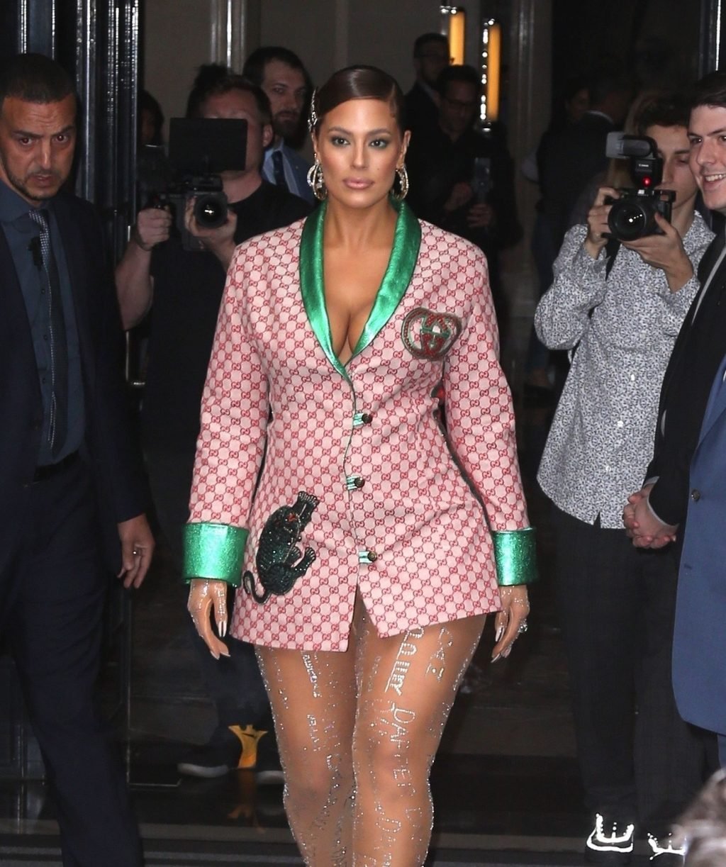 La modelo estadounidense de talla grande de 31 años eligió un blazer con detalles de satén y rayas. Añadió medias con pedrería y muchas decoraciones a su hermoso atuendo.
