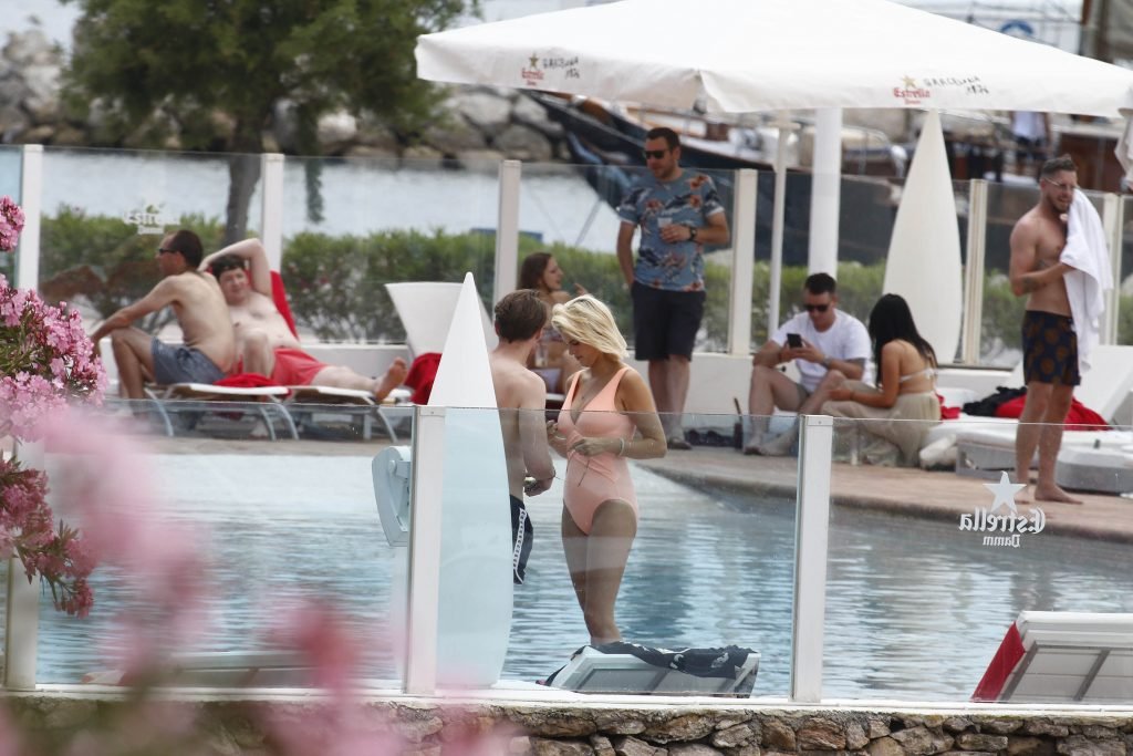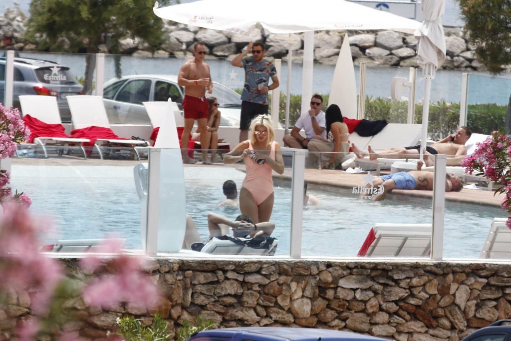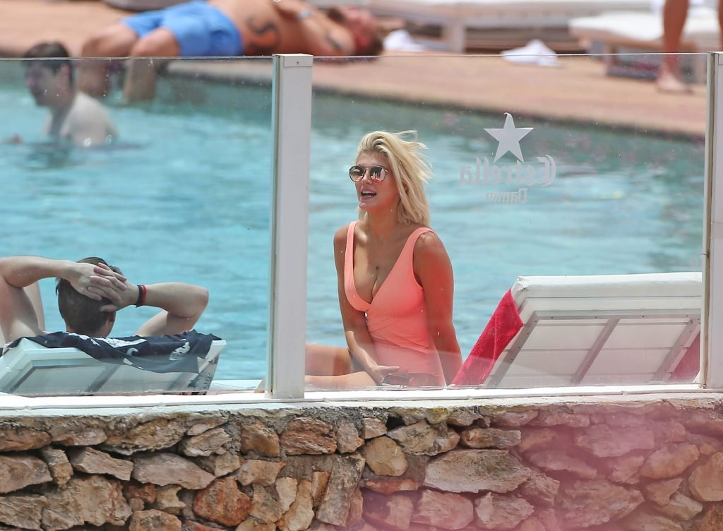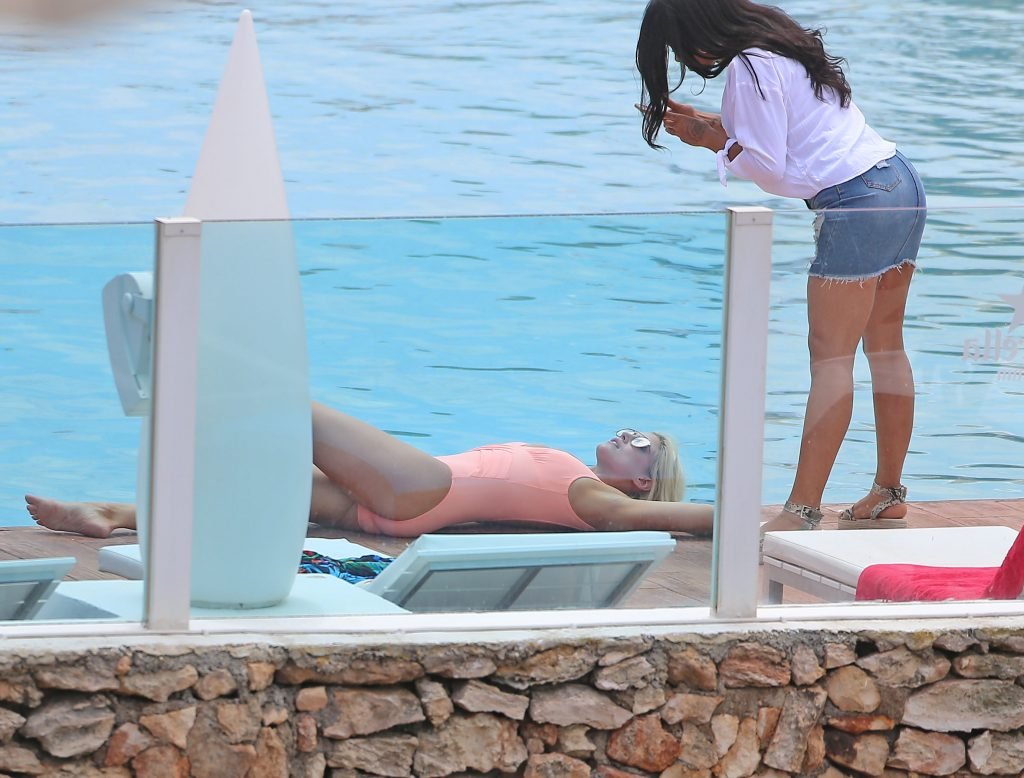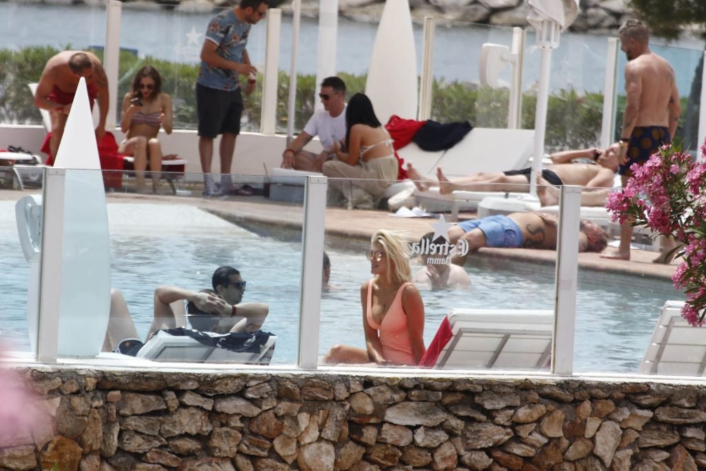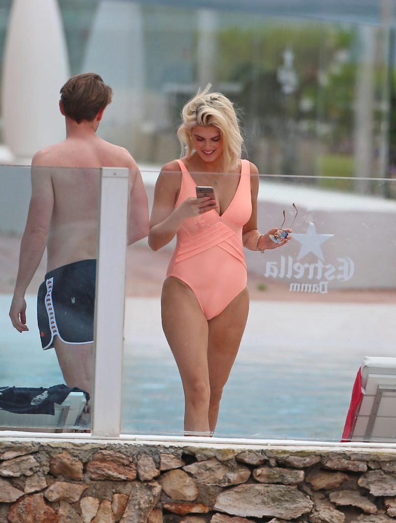 Model y estrella de Gran Hermano Ashley James luce un traje de baño color durazno junto a la piscina durante sus vacaciones en Ibiza, España, 06/06/2018. Habló con amigos y se tomó algunas selfies.