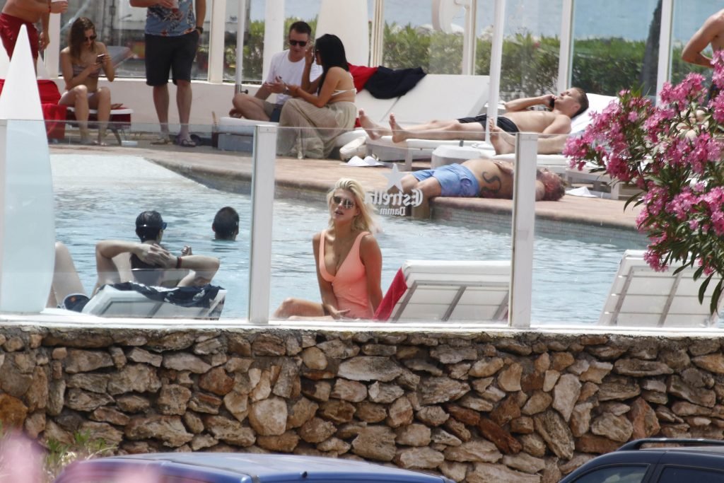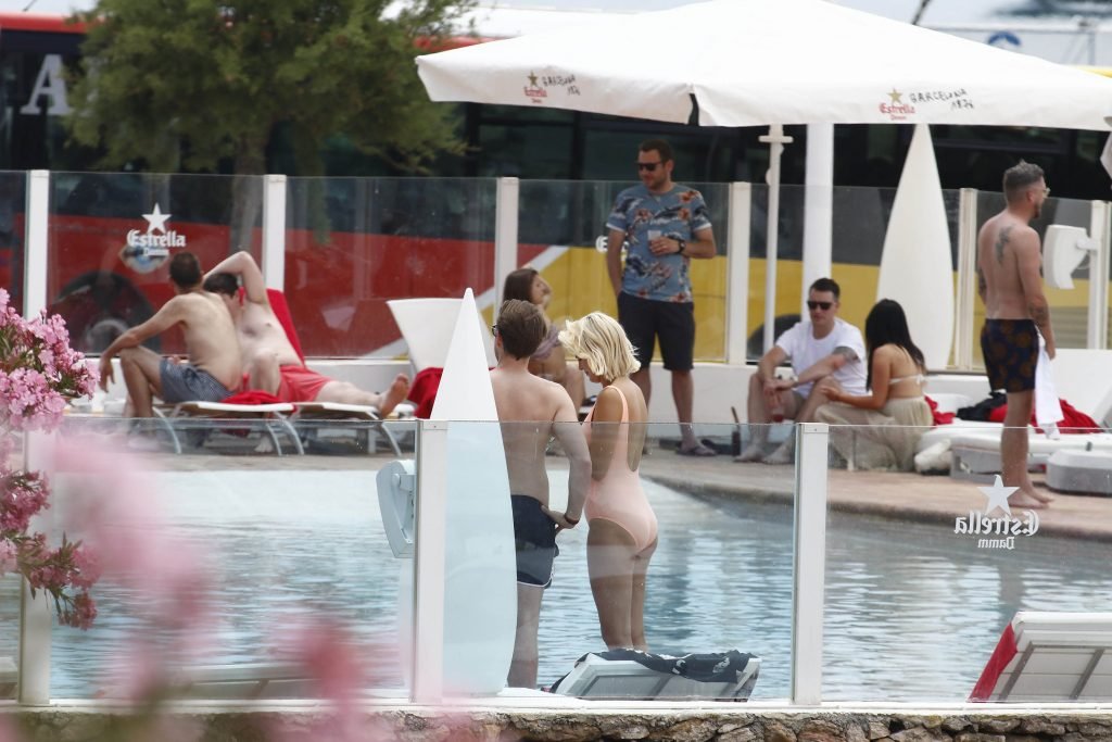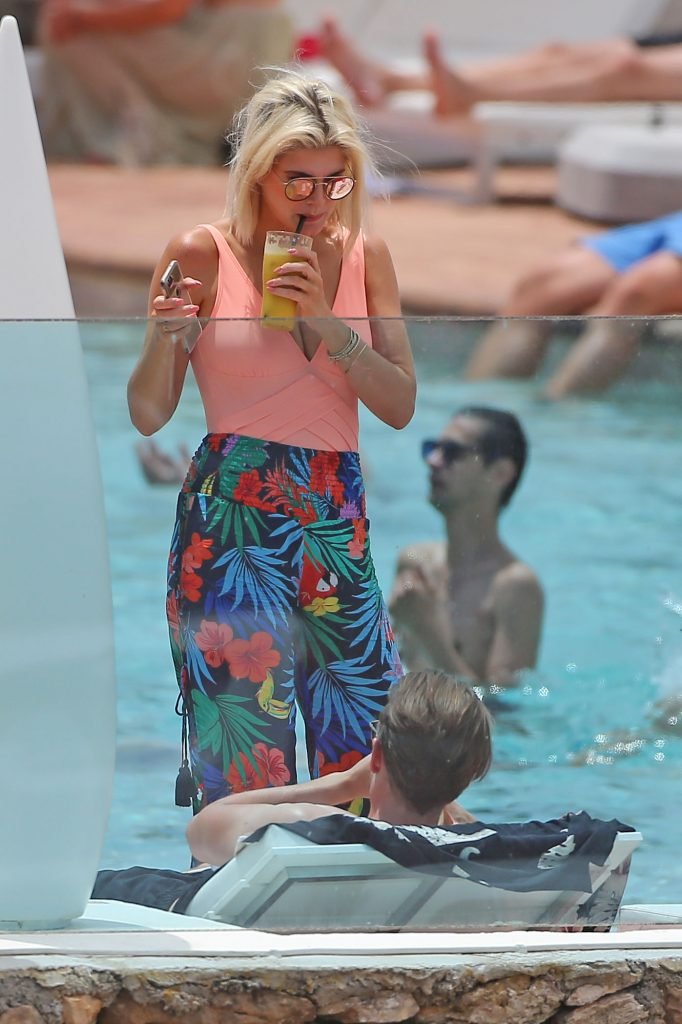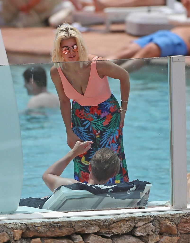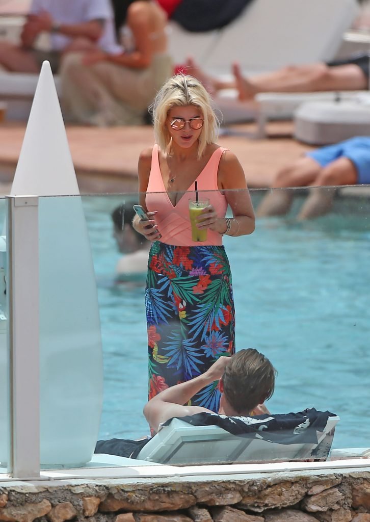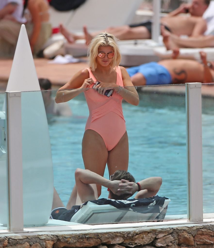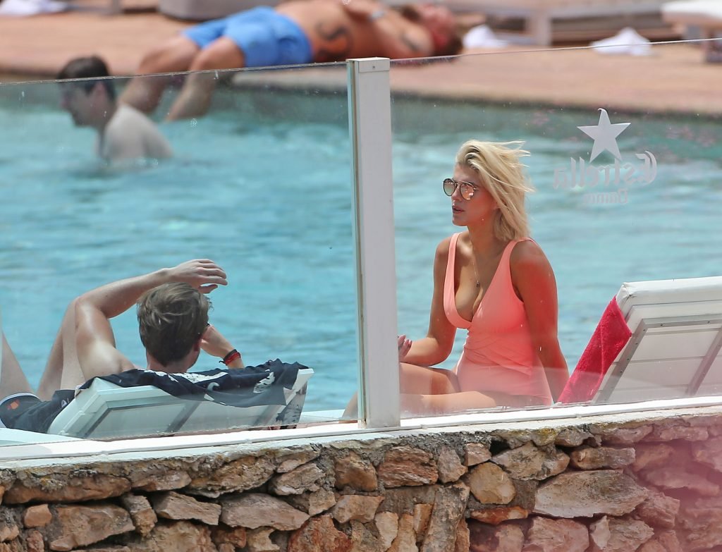 Model y estrella de Gran Hermano Ashley James luce un traje de baño color durazno junto a la piscina durante sus vacaciones en Ibiza, España, 06/06/2018. Habló con amigos y se tomó algunas selfies.