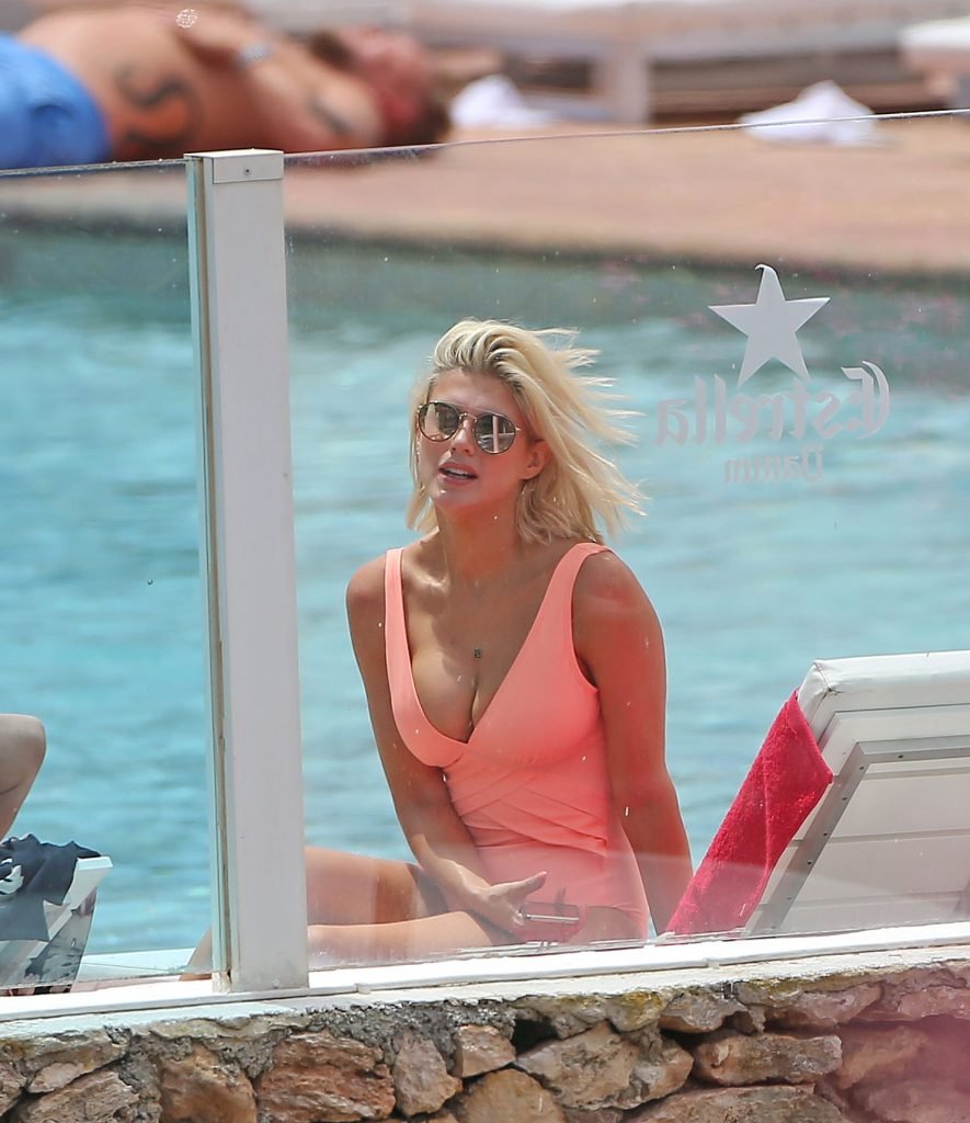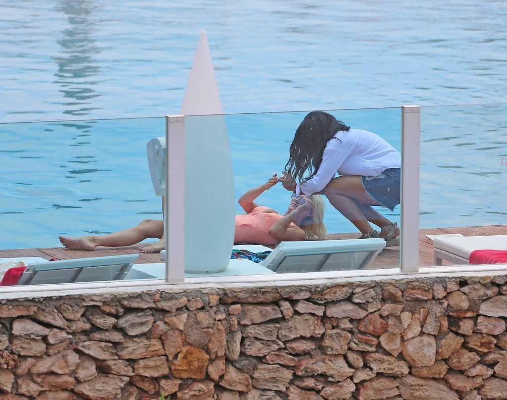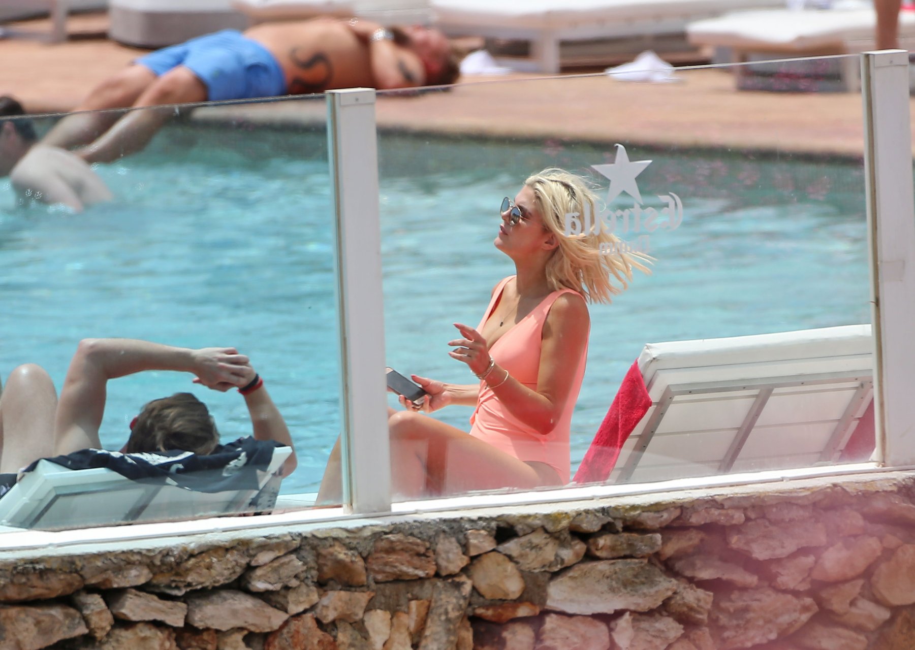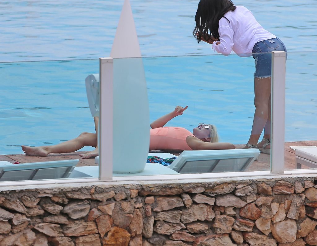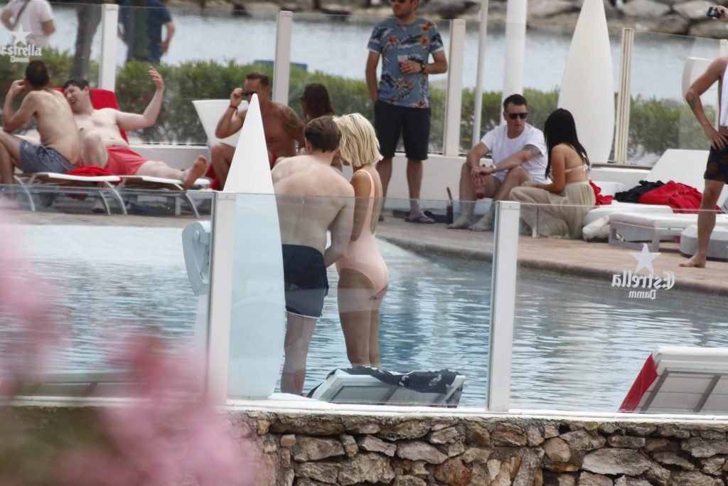 Model y estrella de Gran Hermano Ashley James luce un traje de baño color durazno junto a la piscina durante sus vacaciones en Ibiza, España, 06/06/2018. Habló con amigos y se tomó algunas selfies.