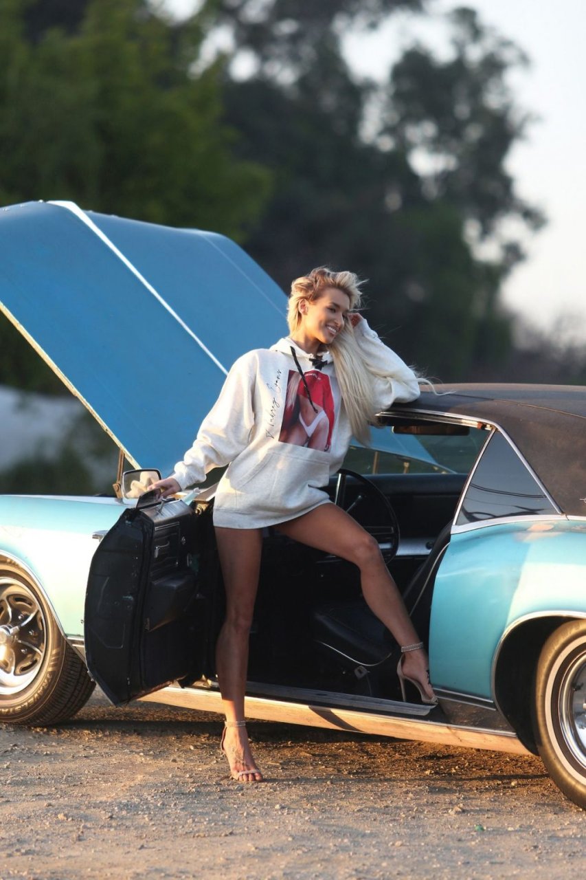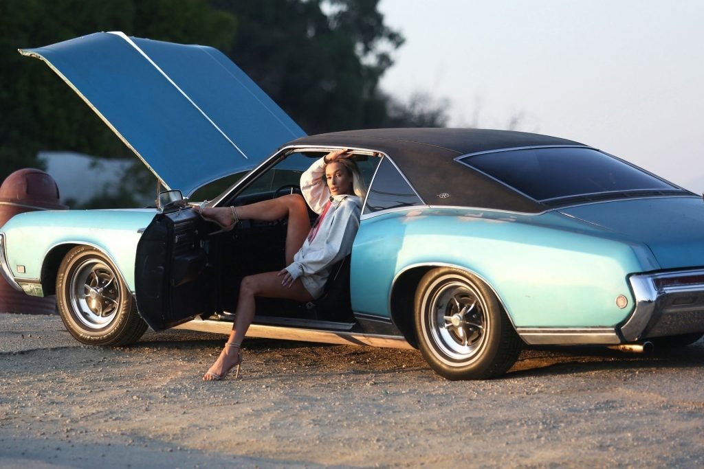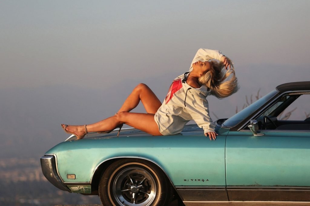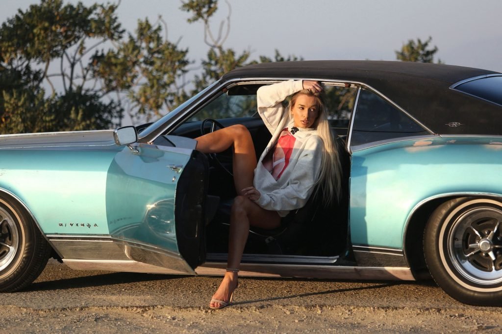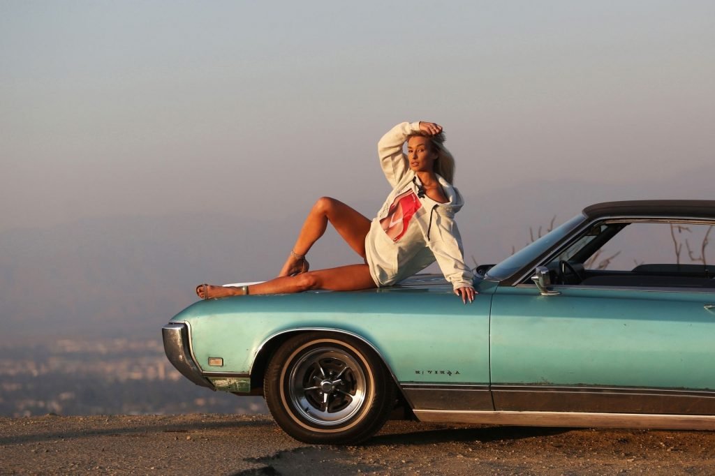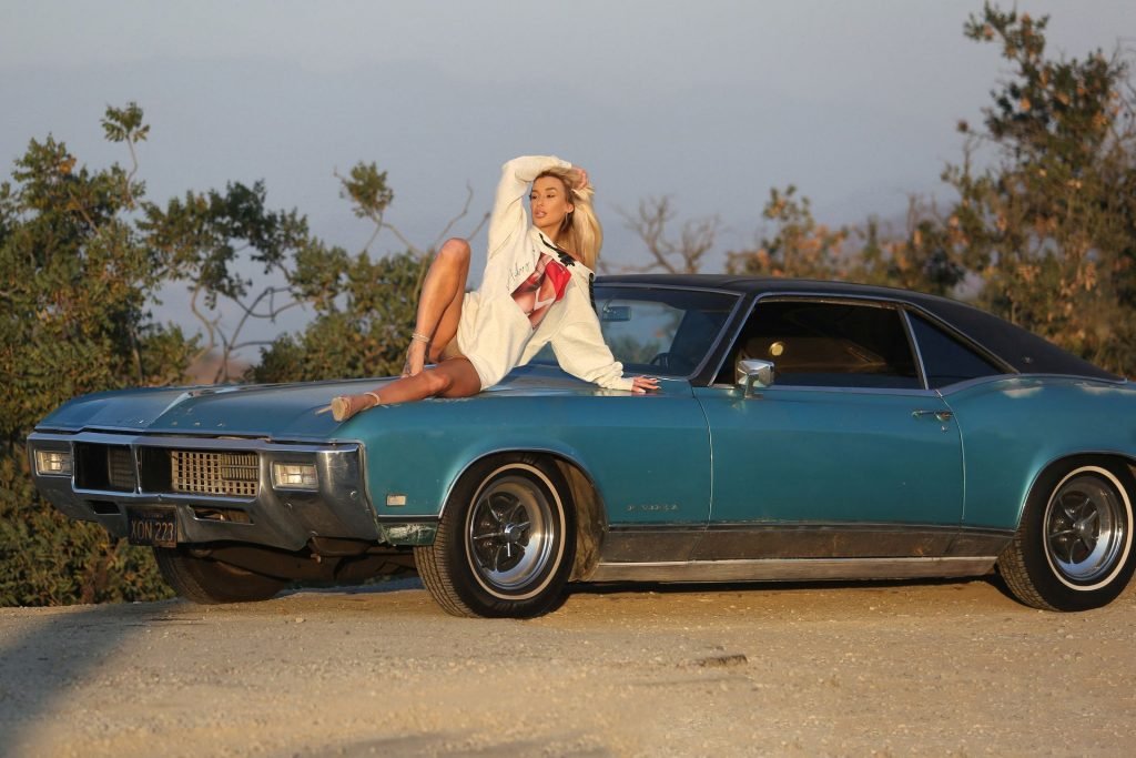 Playmate de Playboy Aubrey Evans realiza acrobacias en una nueva sesión de fotos al aire libre para 138 Water con un Buick Riviera vintage de 1968 en Mulholland Drive en Los Ángeles, 28/10/2019.