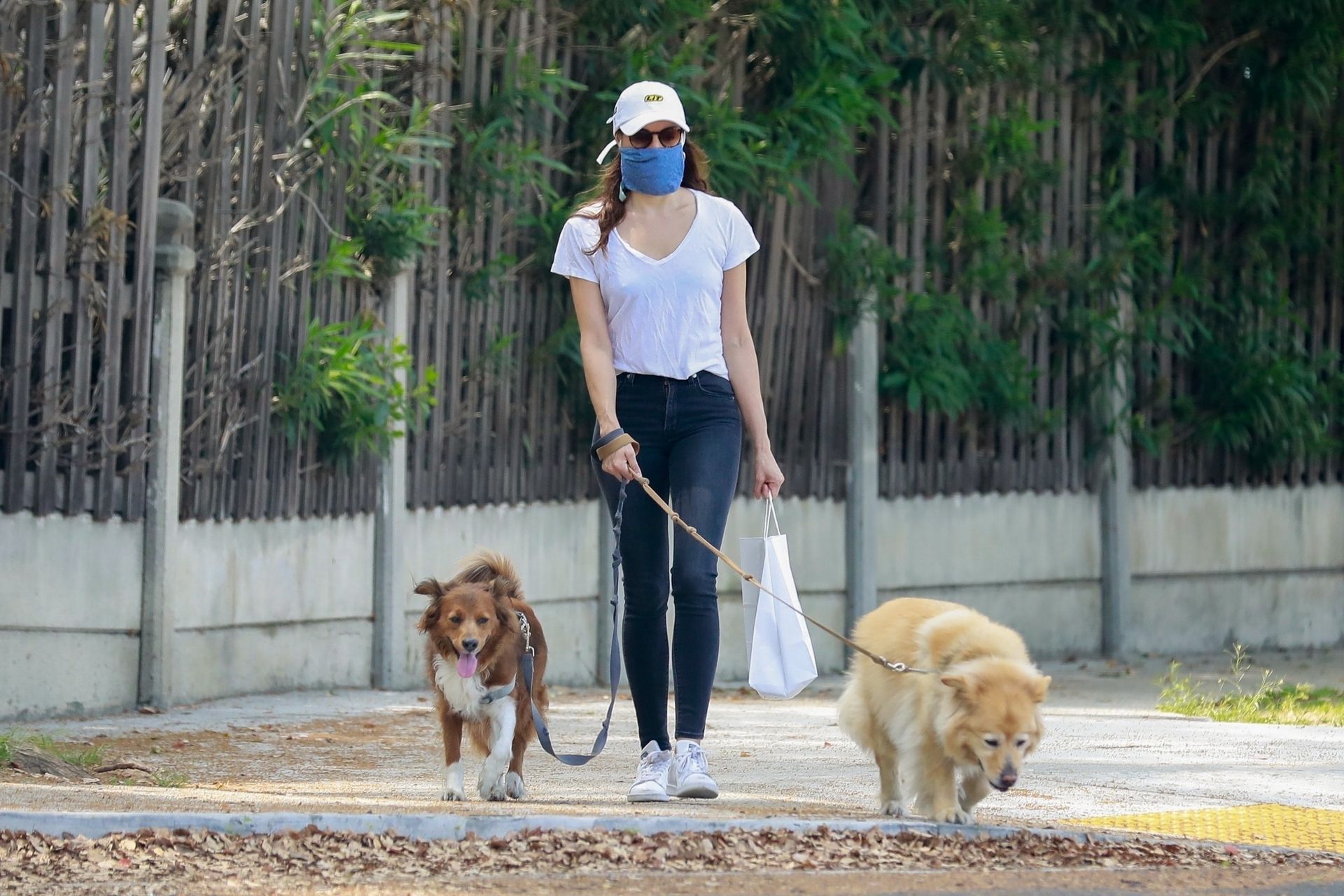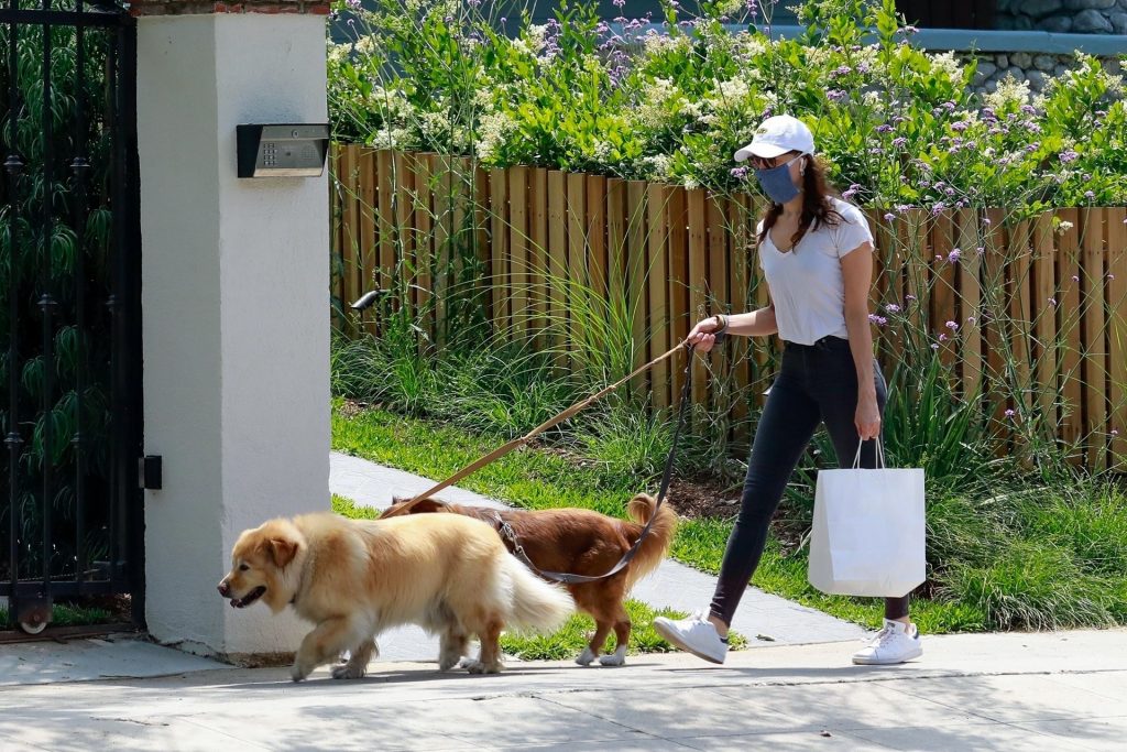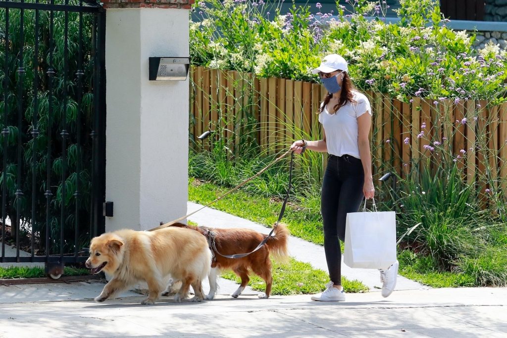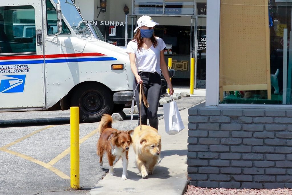 Actriz Aubrey Plaza lleva a sus perros a pasear por la calle hasta la tienda de mascotas en Los Feliz, 09/05/2020. Aubrey compró algunos artículos para sus perros y regresó caminando a casa.