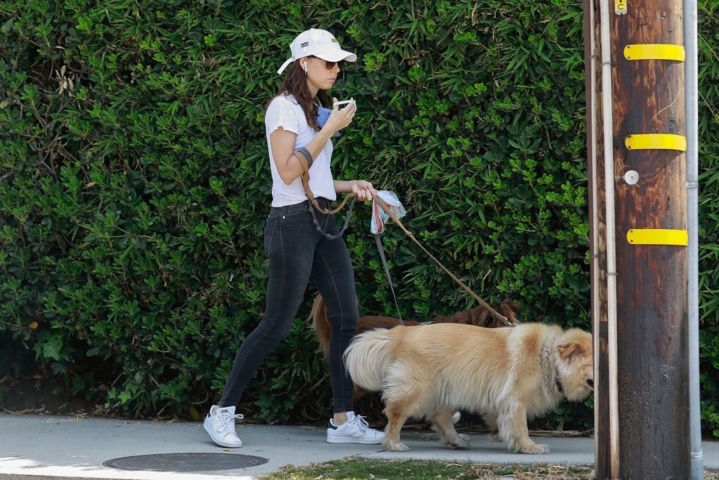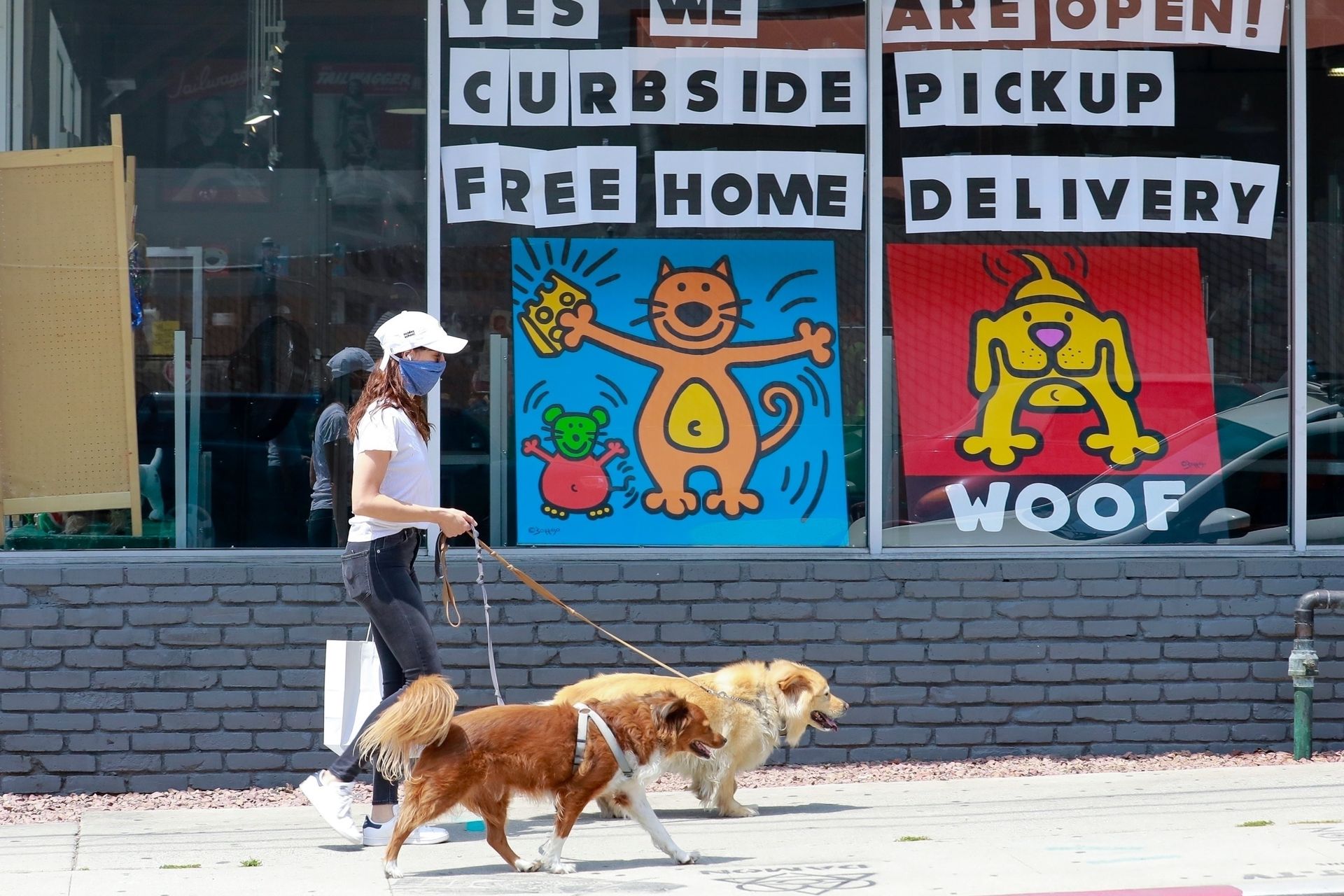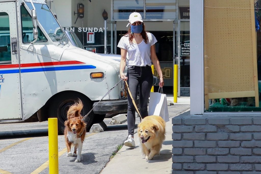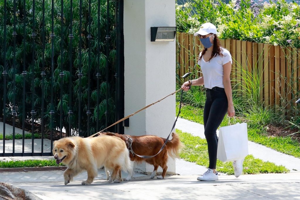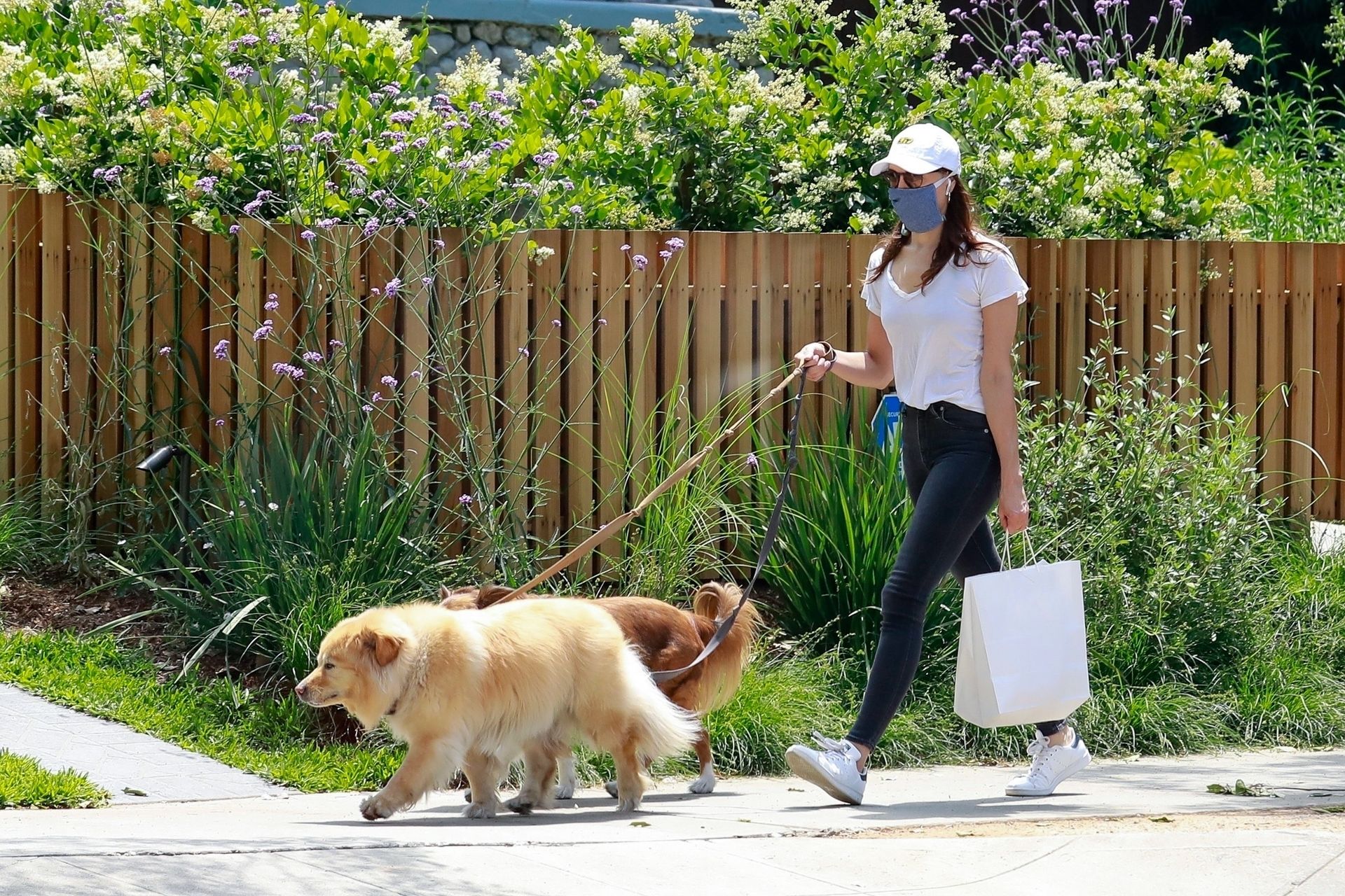 Actriz Aubrey Plaza lleva a sus perros a pasear por la calle hasta la tienda de mascotas en Los Feliz, 09/05/2020. Aubrey compró algunos artículos para sus perros y regresó caminando a casa.