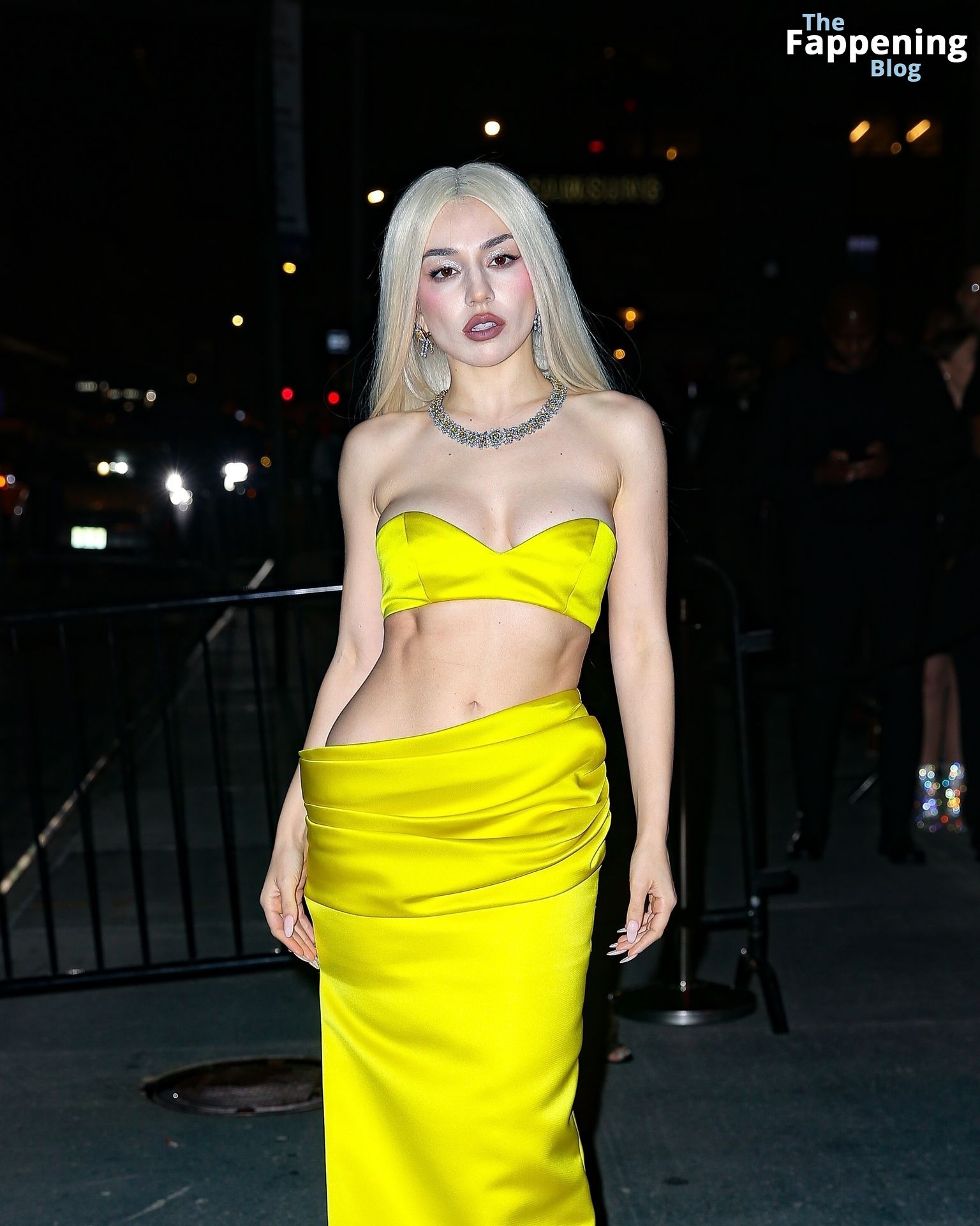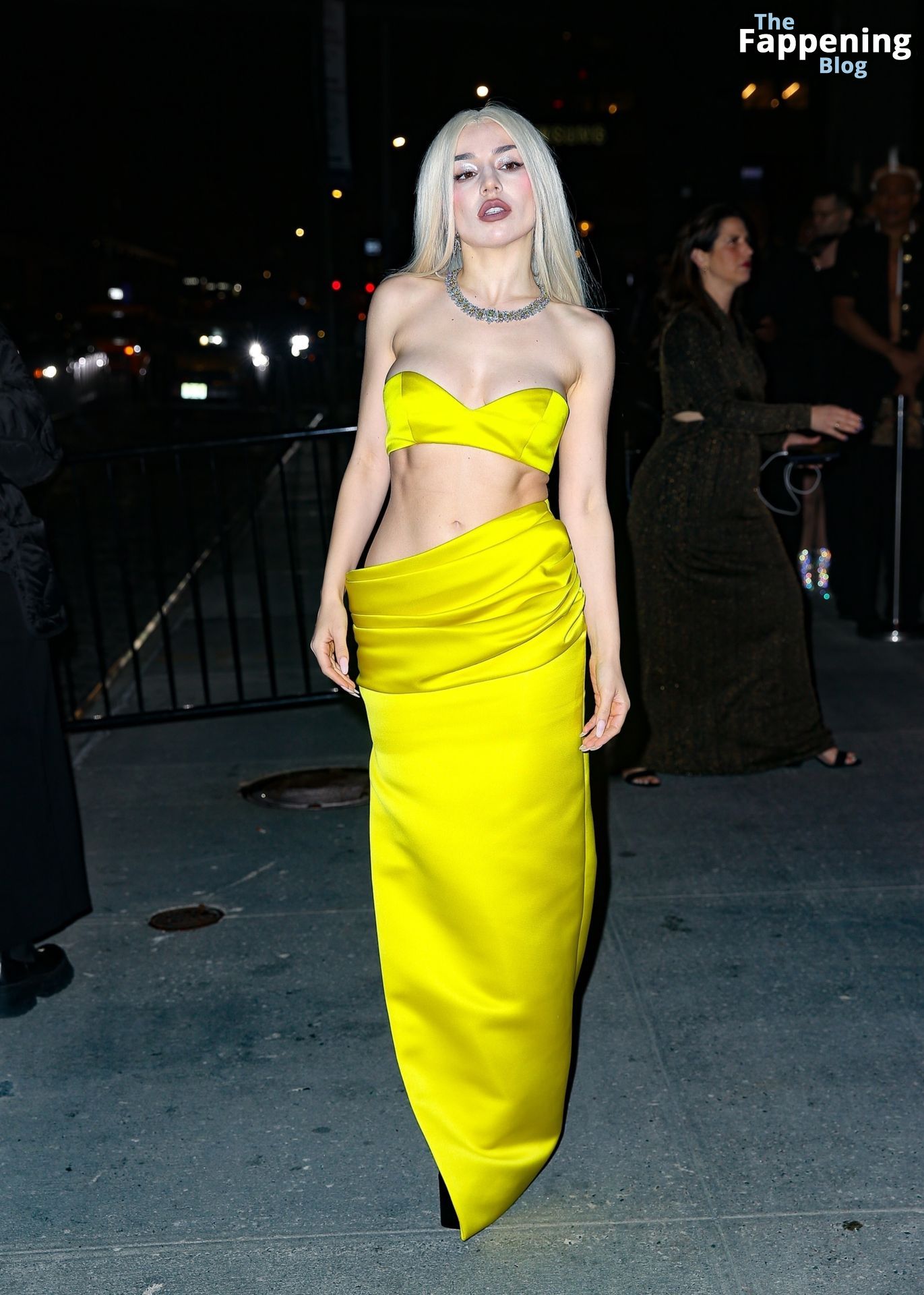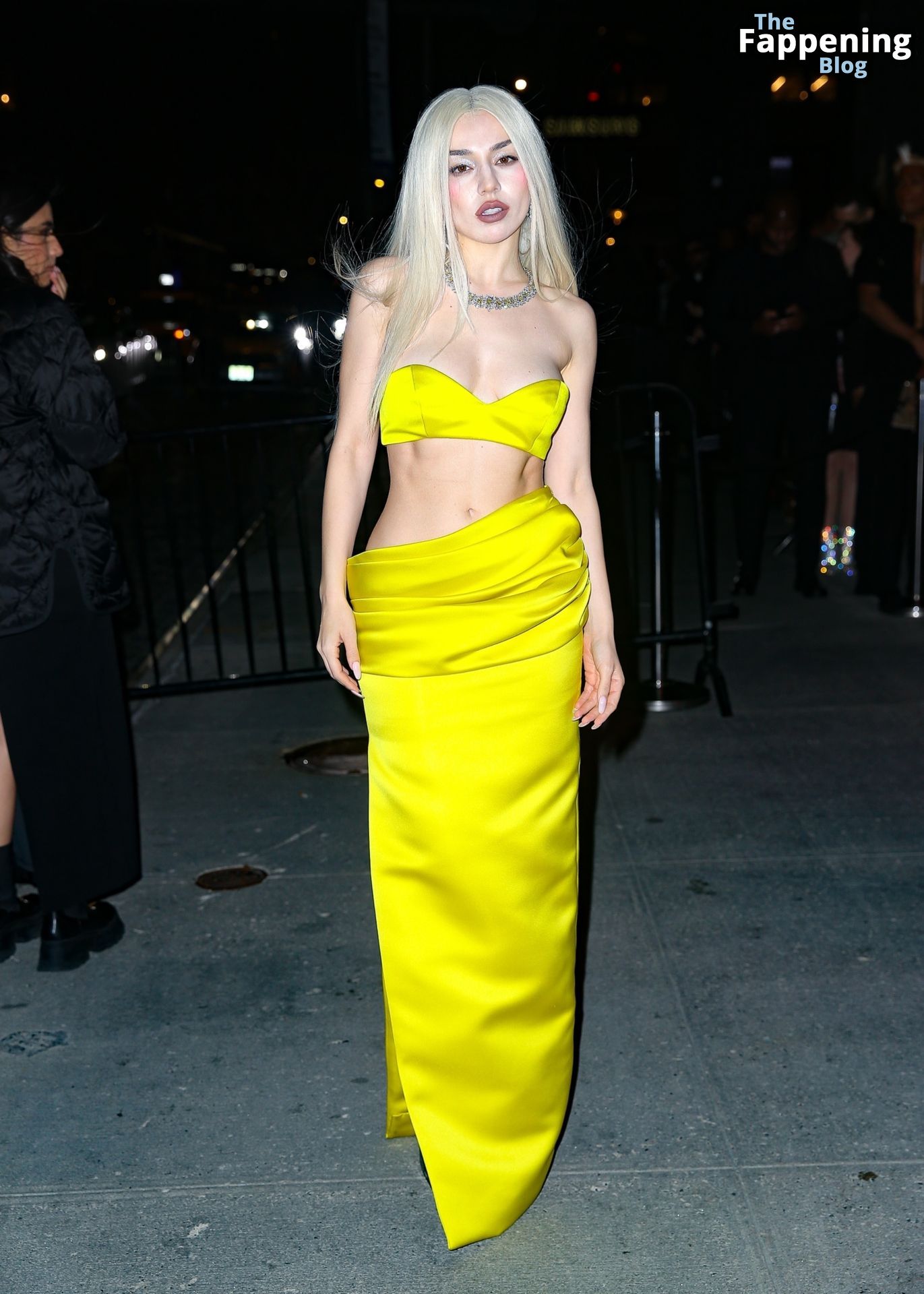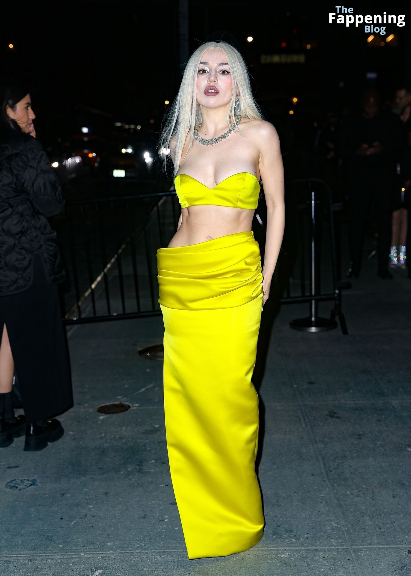 No subestimes la declaración de moda caliente de Ava Max: un vestido amarillo sin sujetador que muestra toda su belleza mientras llega a una fiesta del Met Gala en NYC.