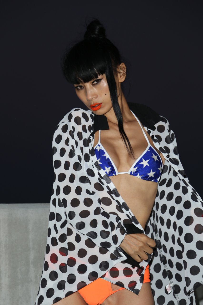 Bai Ling muestra su cintura pequeña con un bikini azul-naranja en el estacionamiento del Teatro ArcLight en Los Ángeles, 10/08/2016. Bai Ling es una actriz chino-estadounidense. Edad: 49 (10 de octubre de 1966).