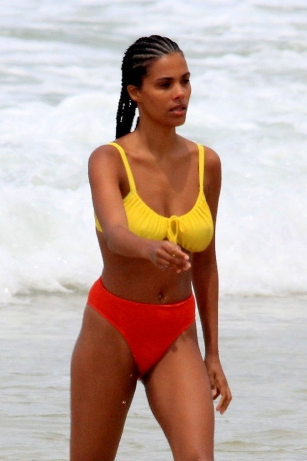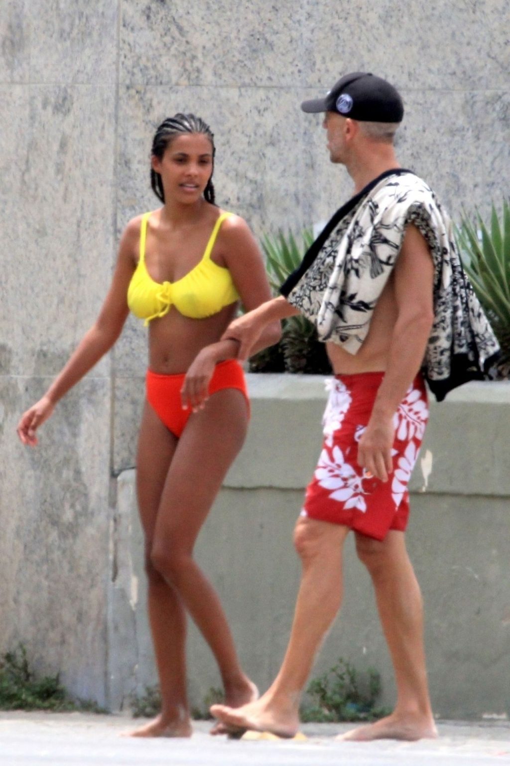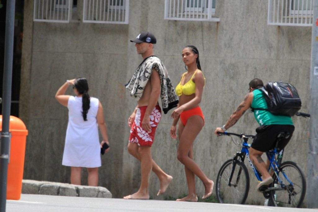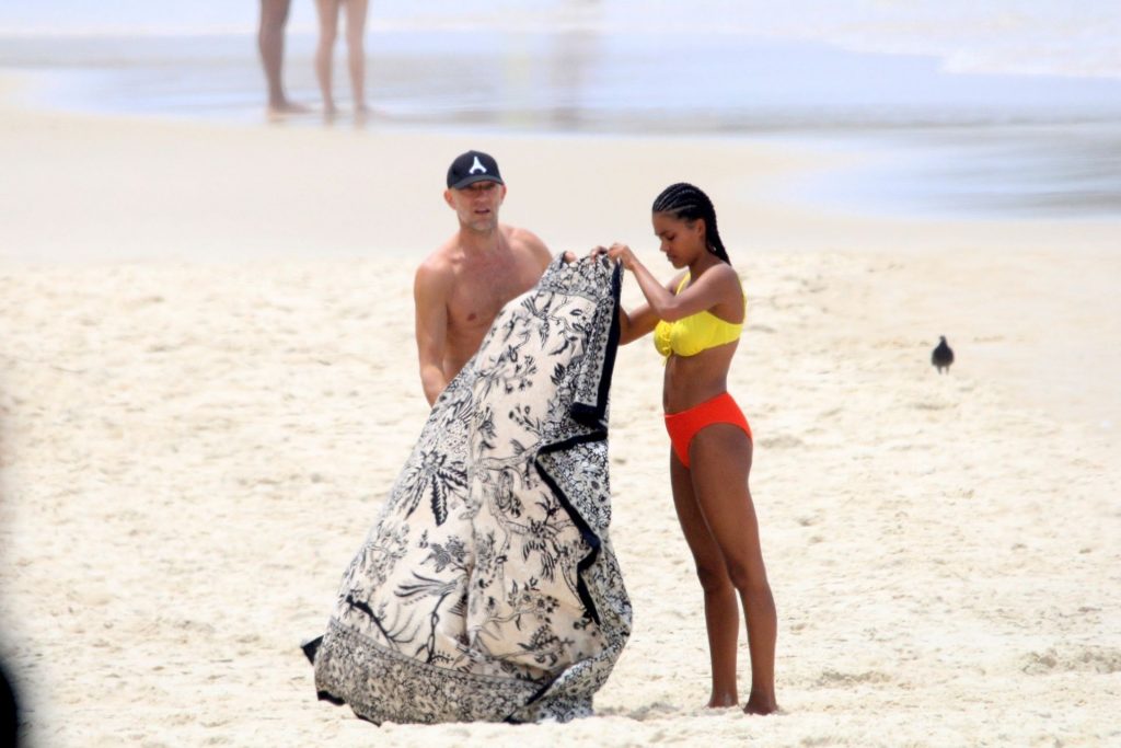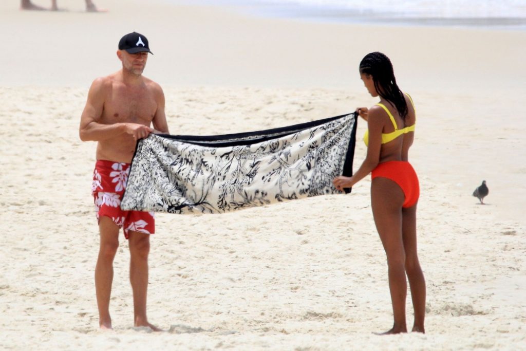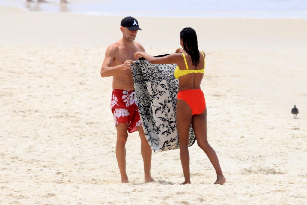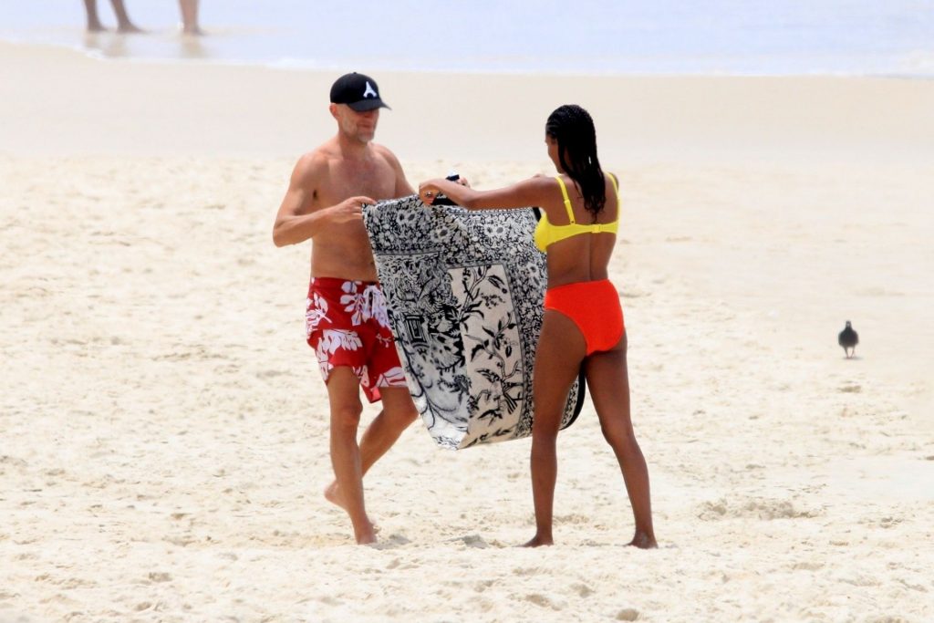 El actor francés Vincent Cassel y su esposa Tina Kunakey disfrutan de la compañía mutua bajo el sol de Río de Janeiro, 01/02/2020. Tina, con un top de bikini amarillo, se da un chapuzón en el agua antes de volver a la arena para recostarse con su esposo Vincent.