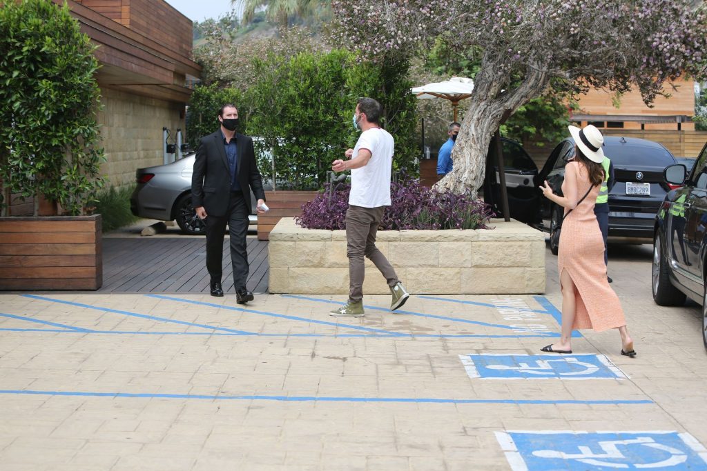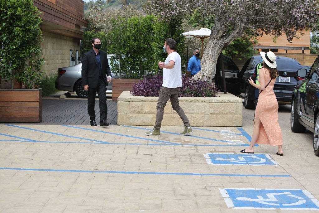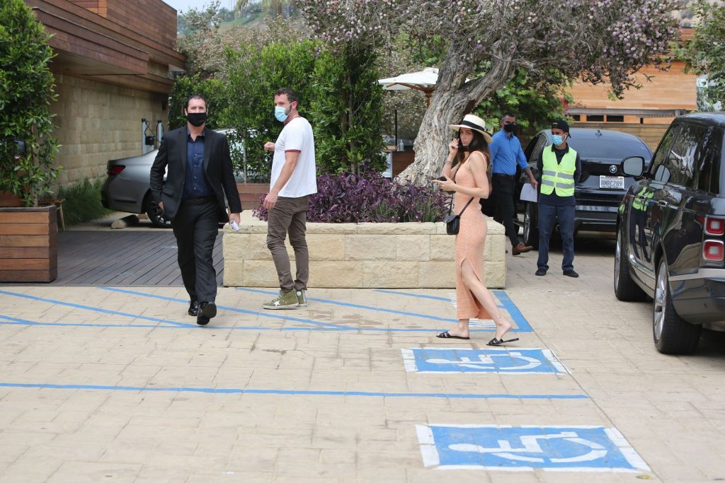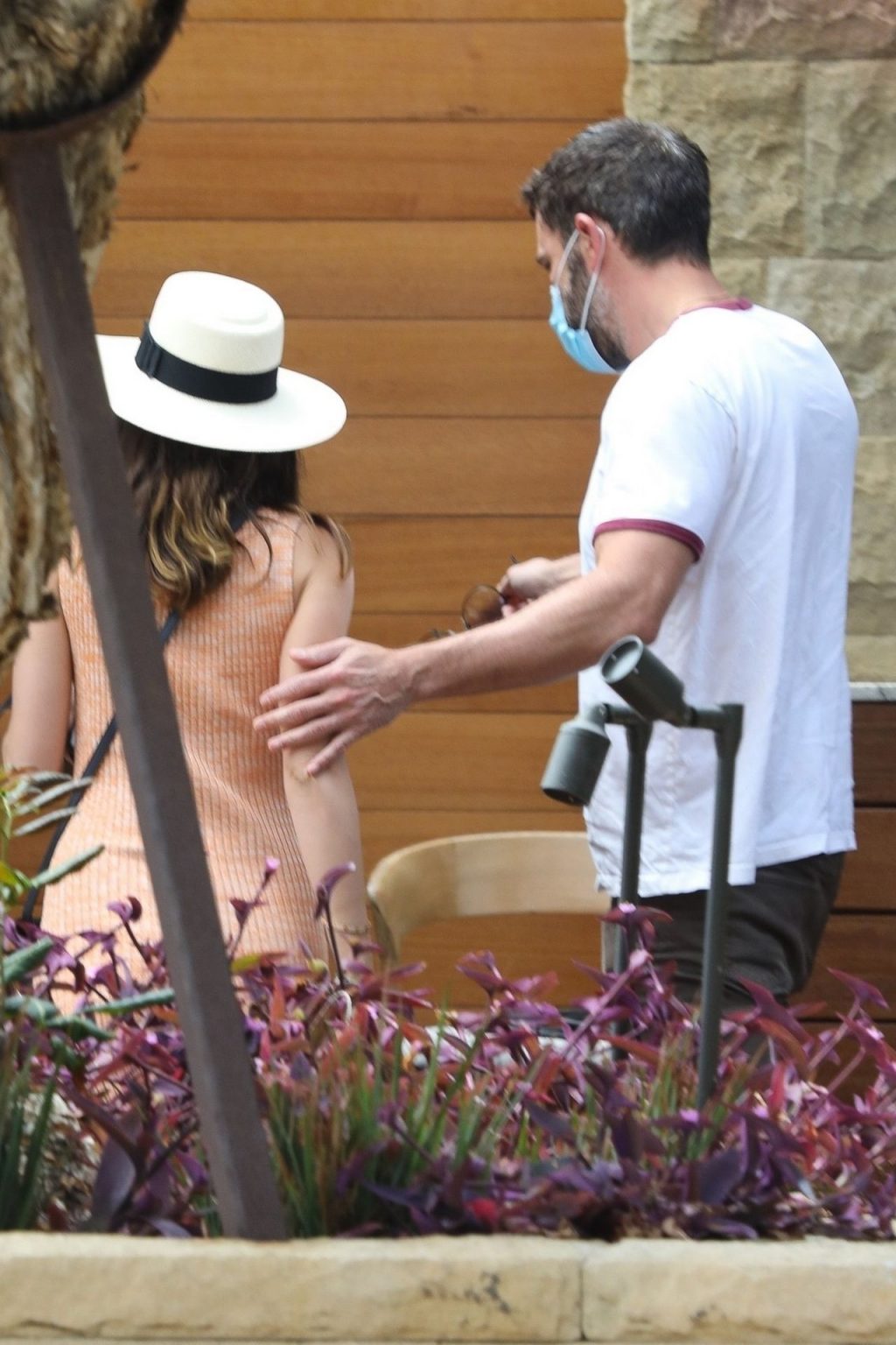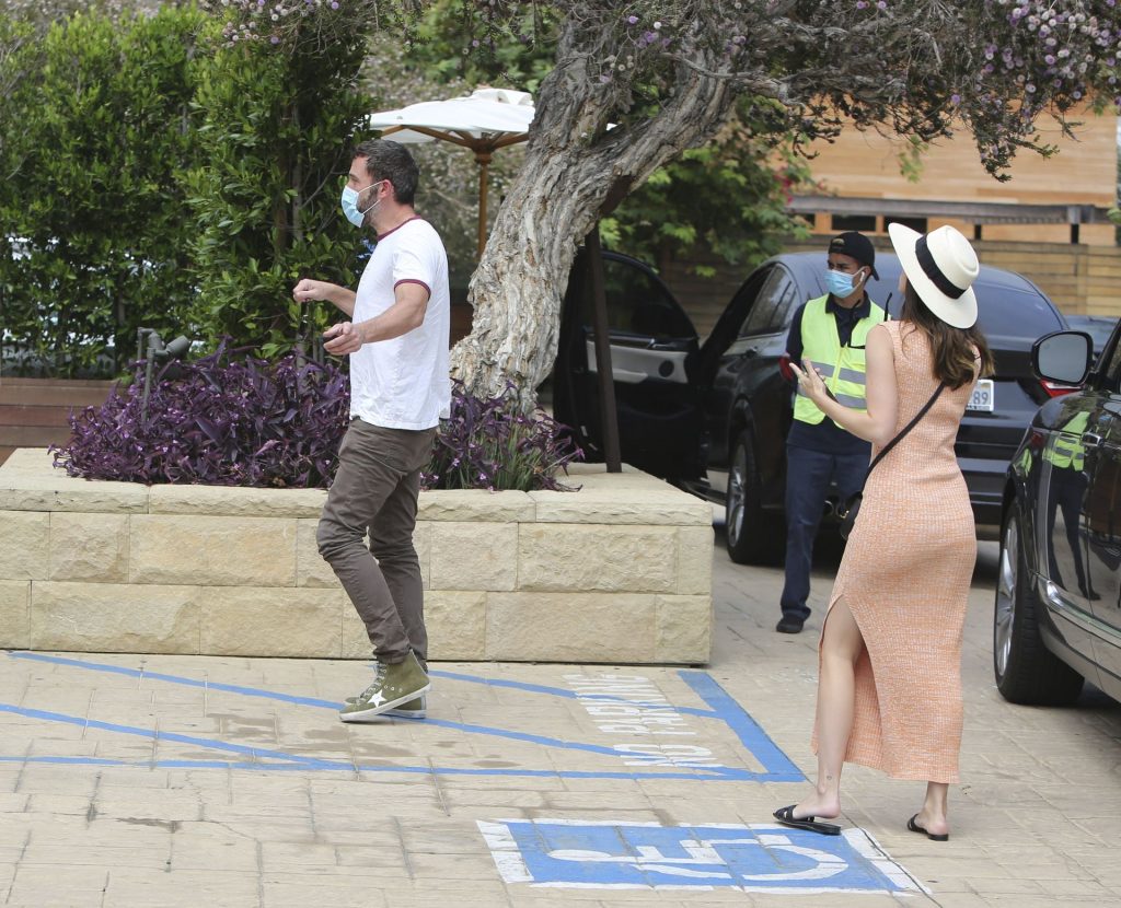 Ben Affleck lleva a su novia Ana de Armas a Nobu Malibu para un almuerzo temprano el sábado (julio de 2020). La actriz cubano-española casi parecía DESNUDA con su vestido melocotón acanalado, complementado con un bolso cruzado de Saint Laurent y sandalias YSL. Ben llevaba unas zapatillas altas Golden Goose de $550. ¡Oye, estos dos son de alta moda!