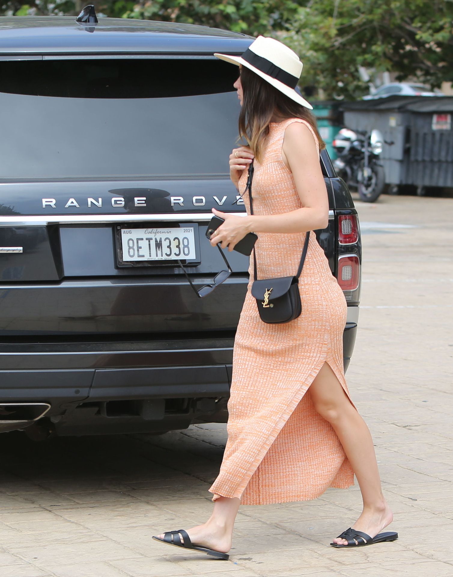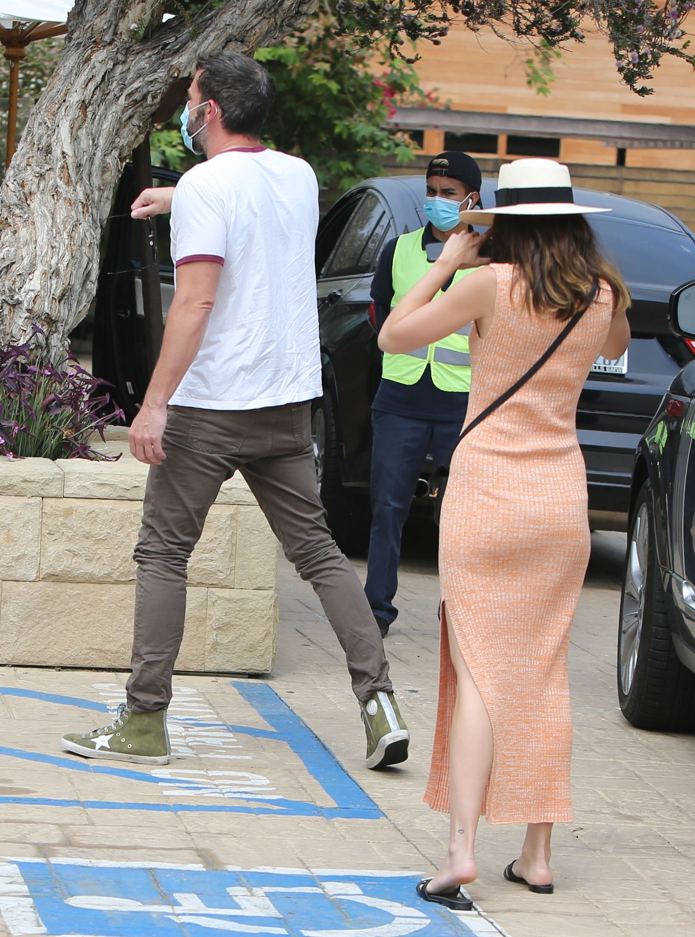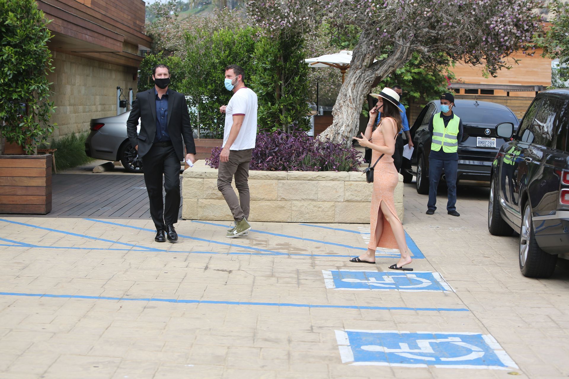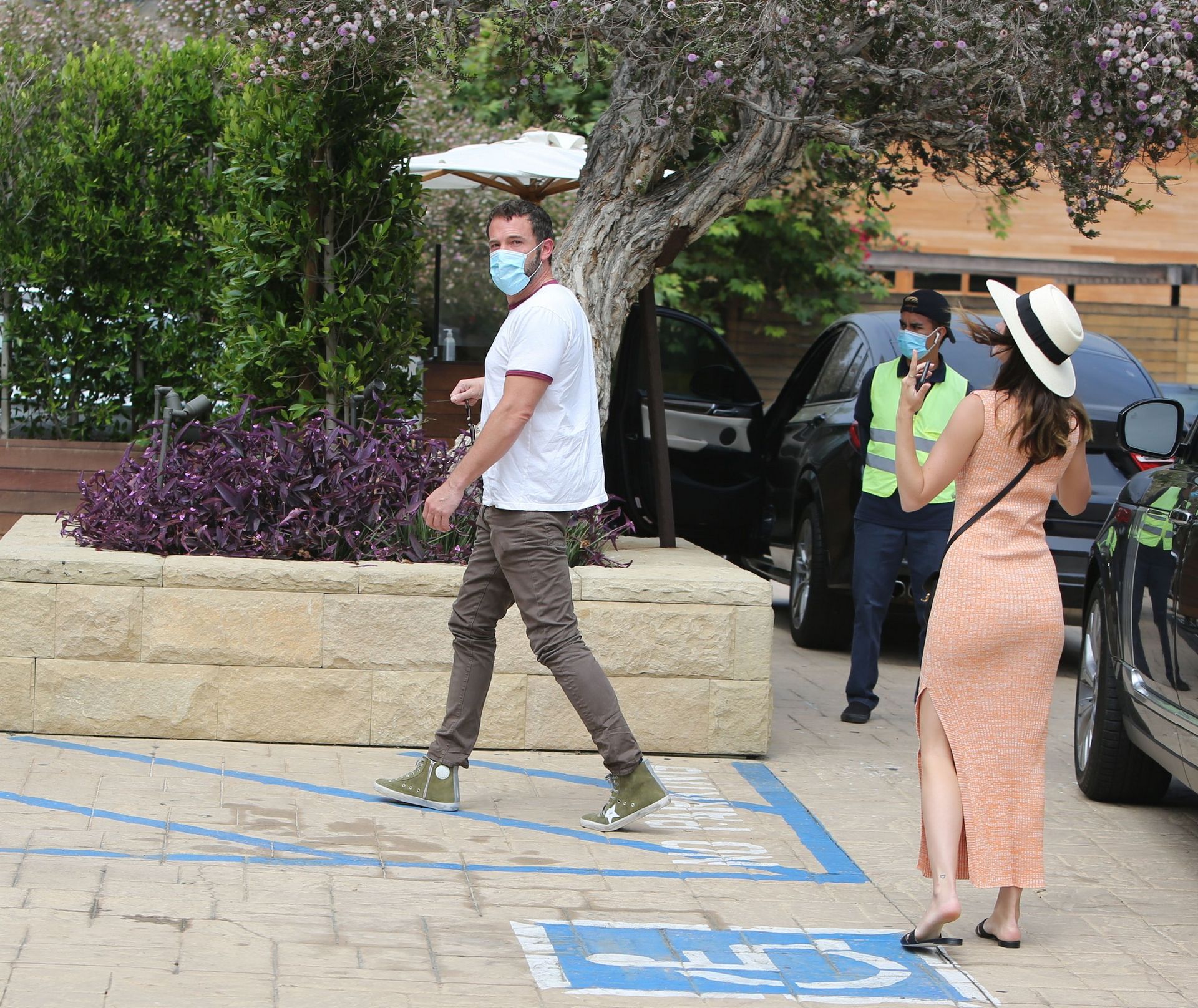 Ben Affleck lleva a su novia Ana de Armas a Nobu Malibu para un almuerzo temprano el sábado (julio de 2020). La actriz cubano-española casi parecía DESNUDA con su vestido melocotón acanalado, complementado con un bolso cruzado de Saint Laurent y sandalias YSL. Ben llevaba unas zapatillas altas Golden Goose de $550. ¡Oye, estos dos son de alta moda!