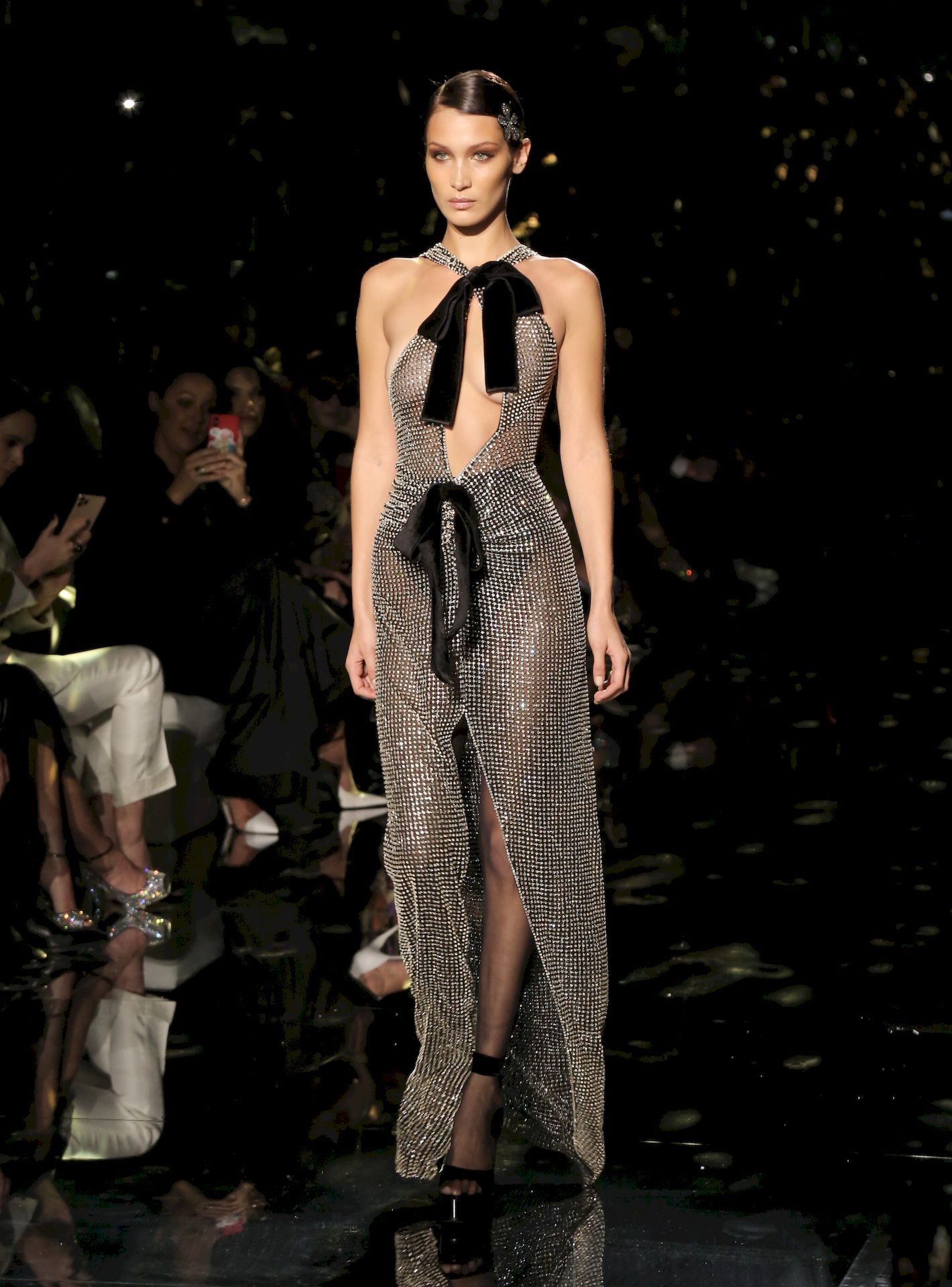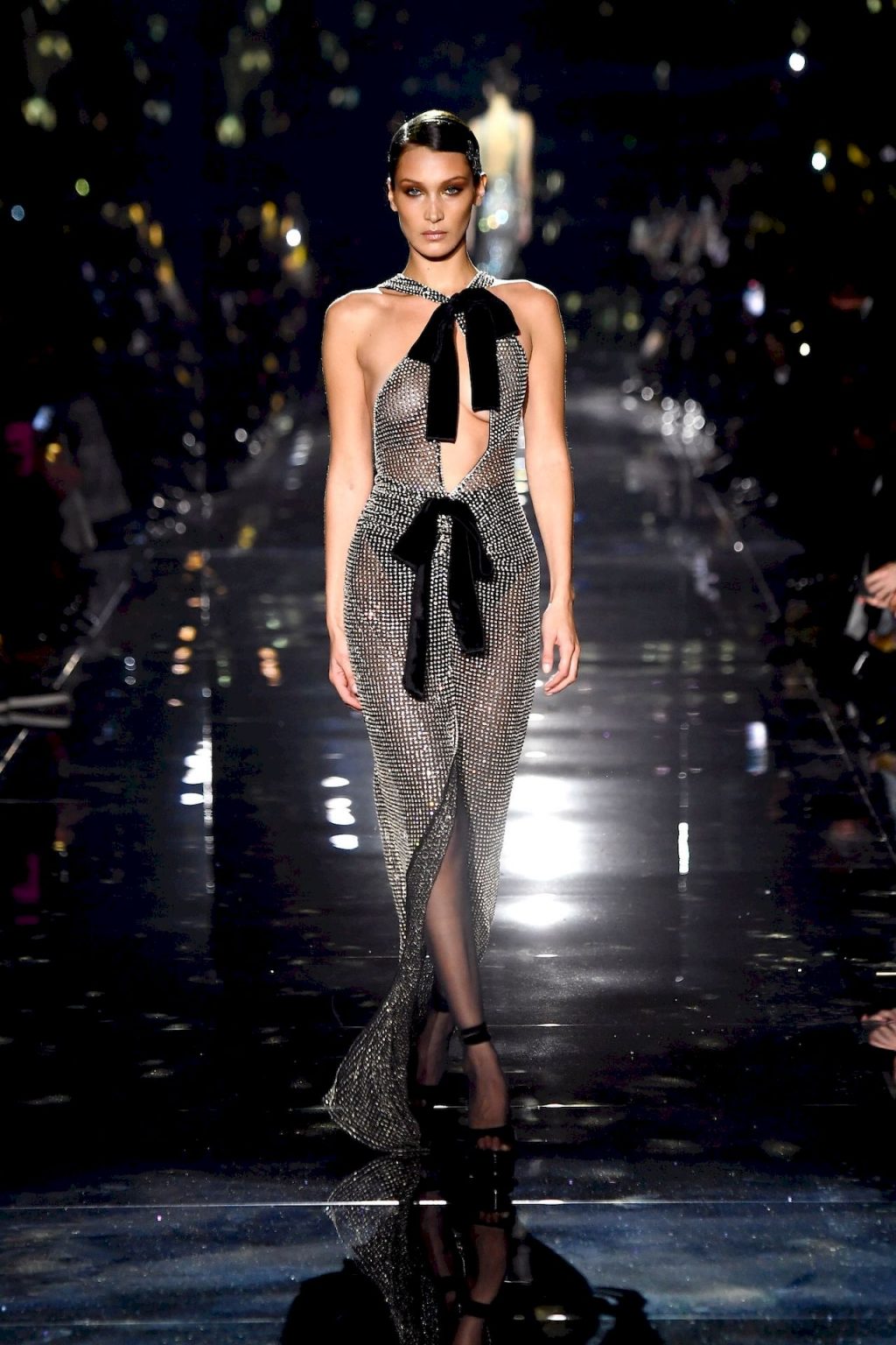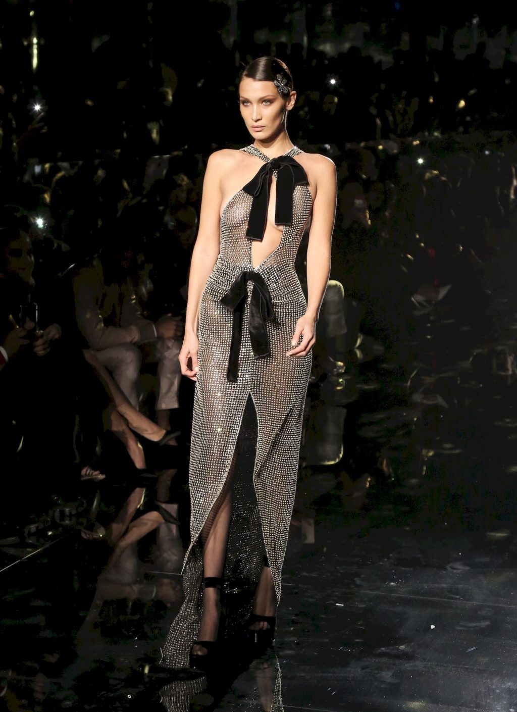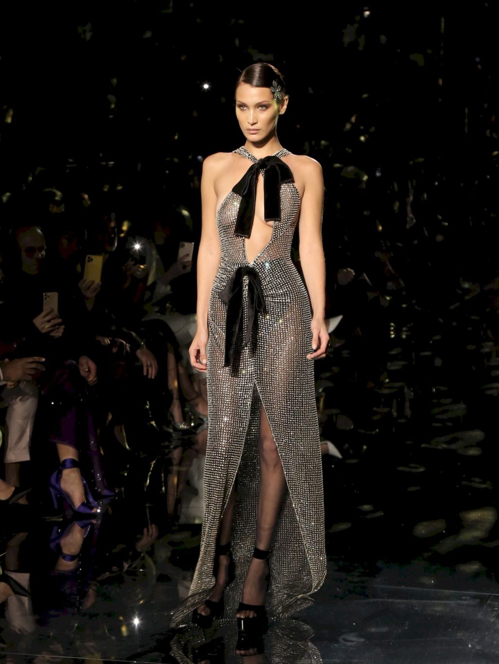 Model Bella Hadid camina por la pasarela con un vestido transparente, mostrando sus tetas desnudas para todos los invitados del desfile de moda en Hollywood, 02/07/2020.