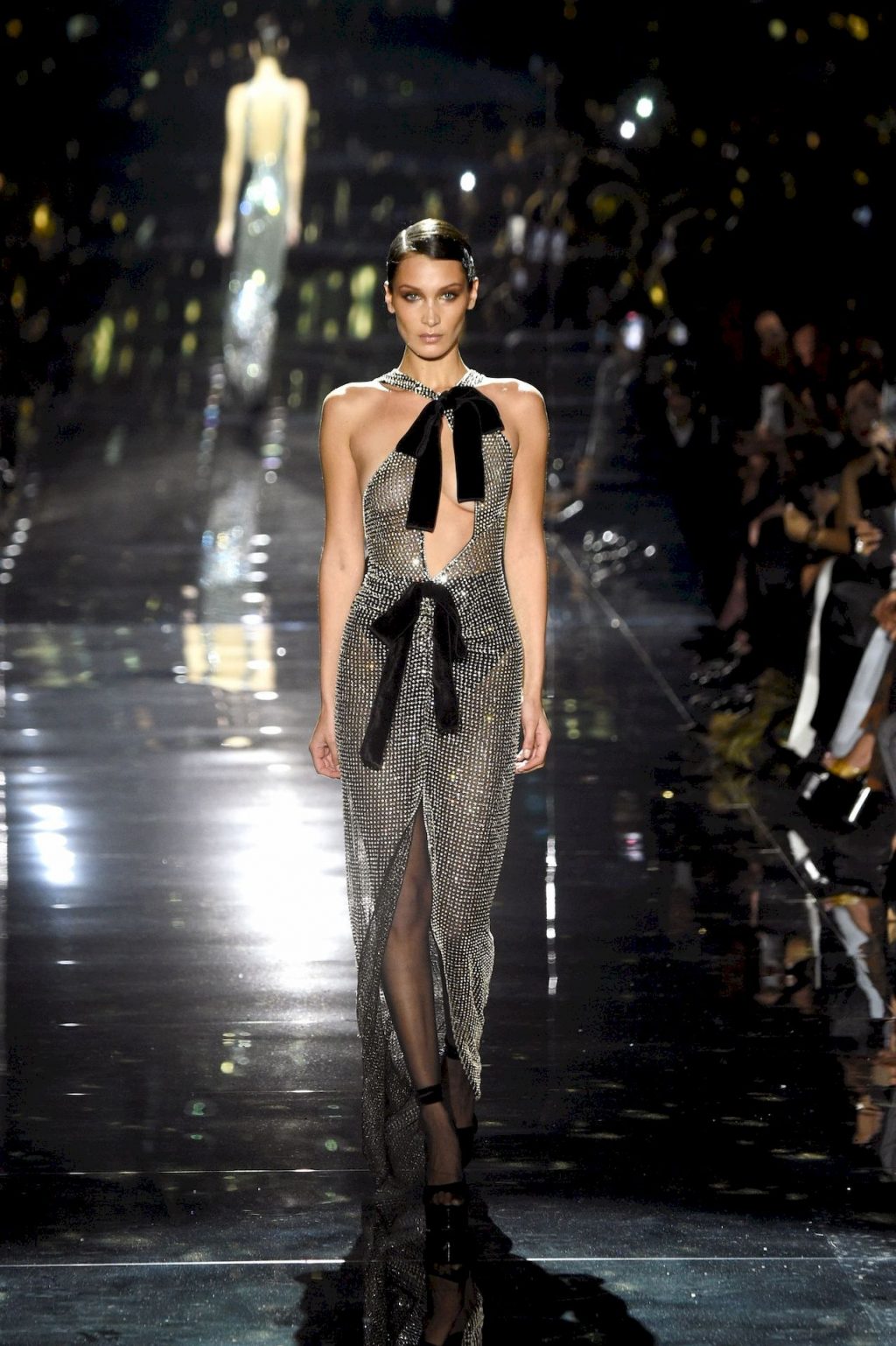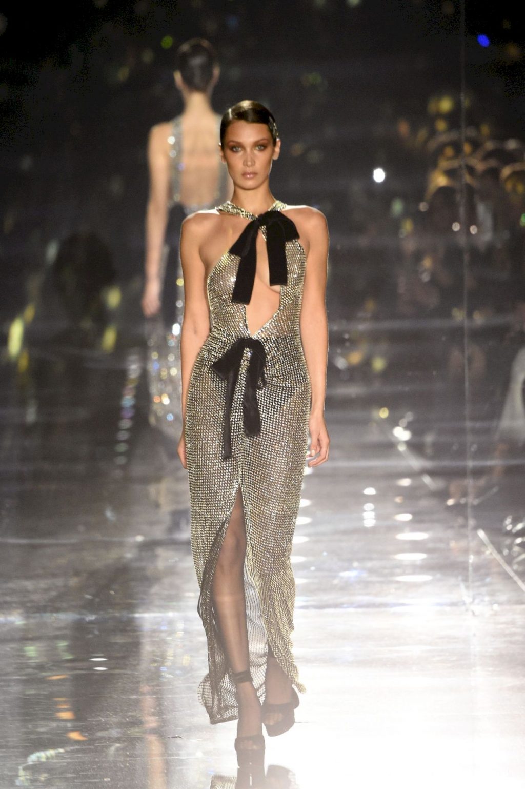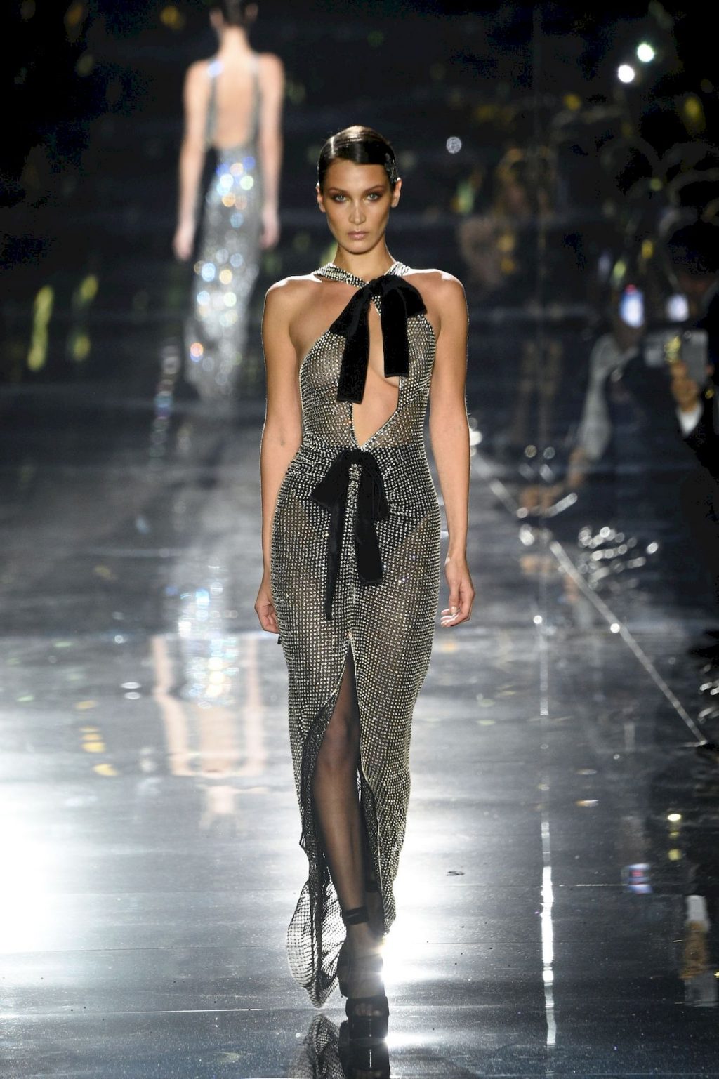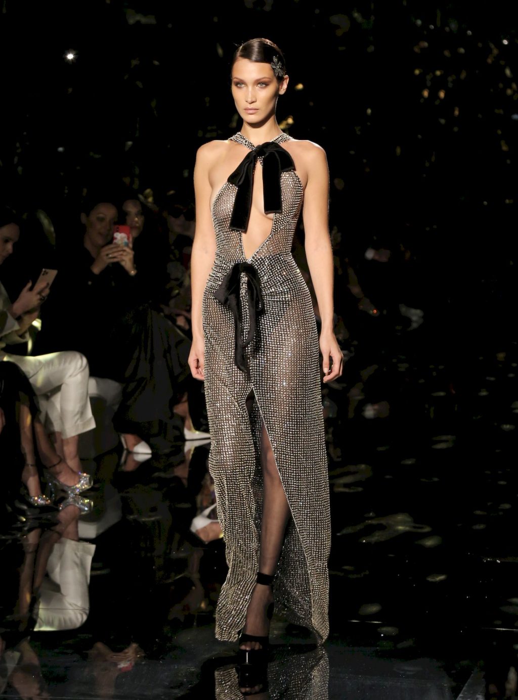 Model Bella Hadid camina por la pasarela con un vestido transparente, mostrando sus tetas desnudas para todos los invitados del desfile de moda en Hollywood, 02/07/2020.