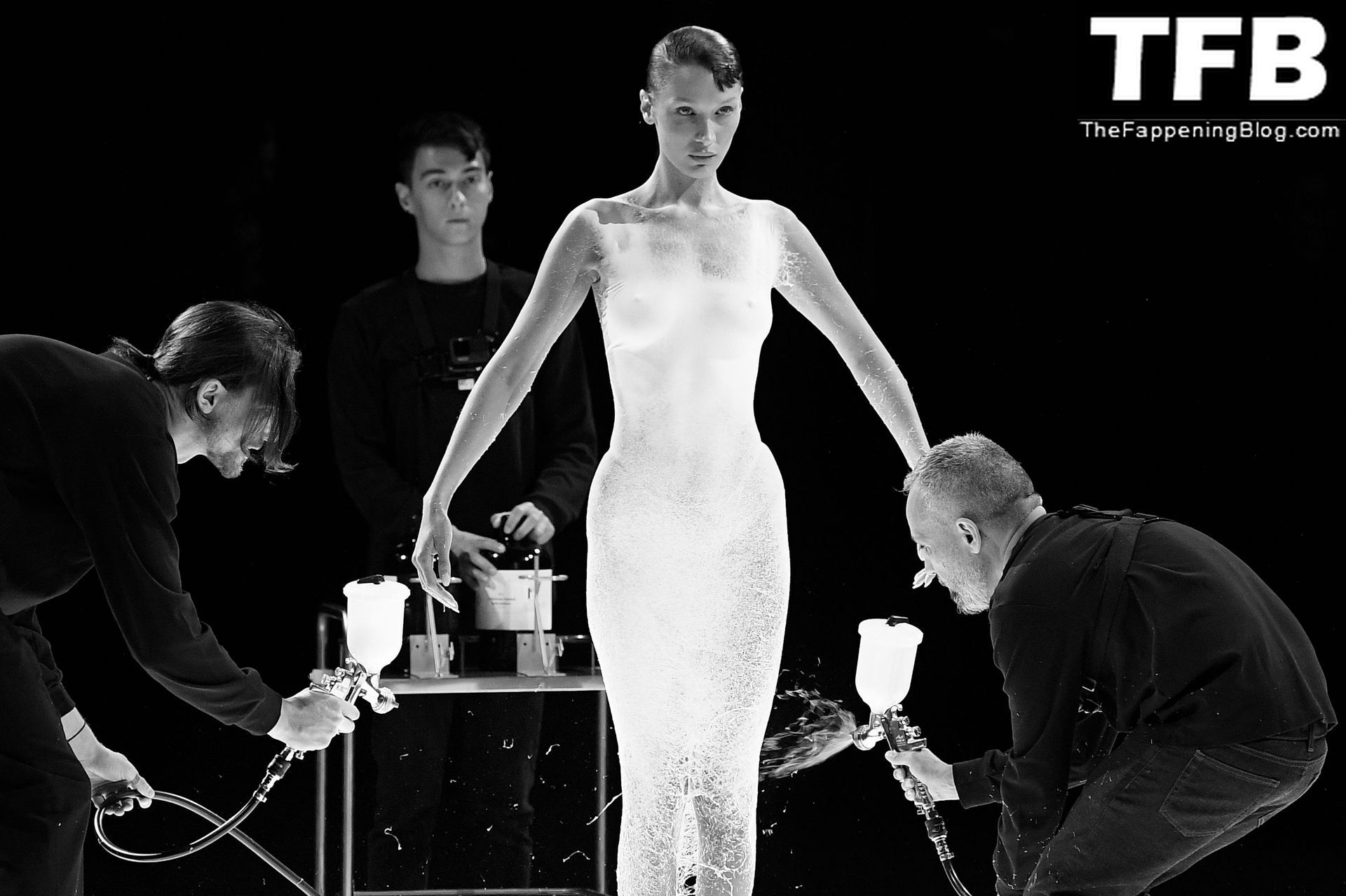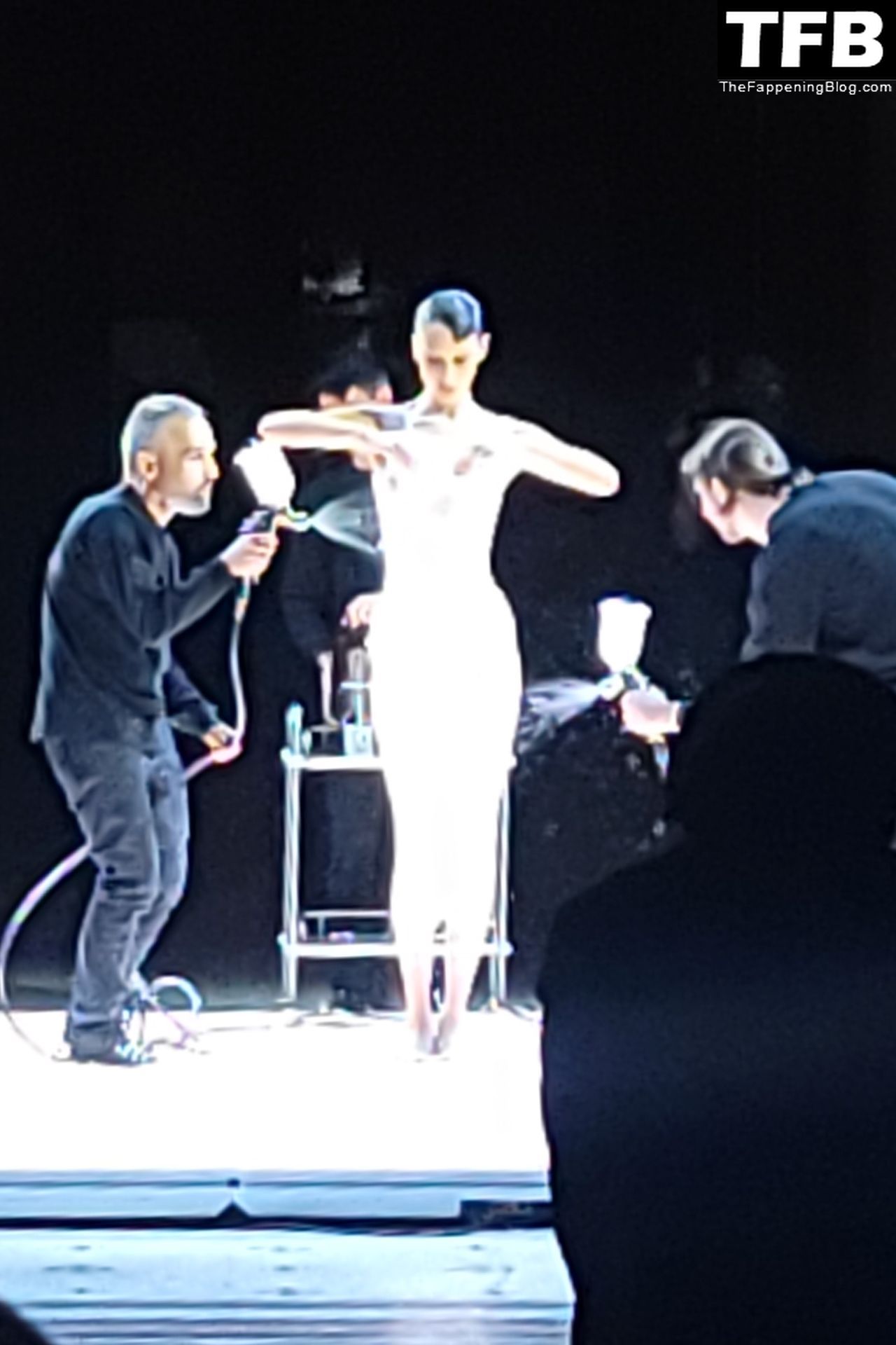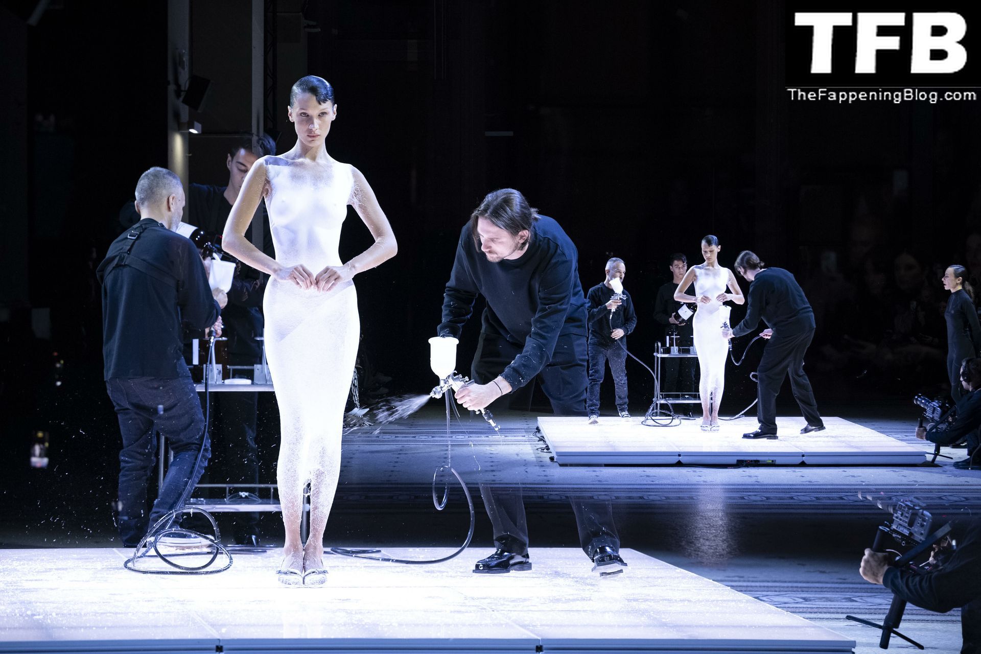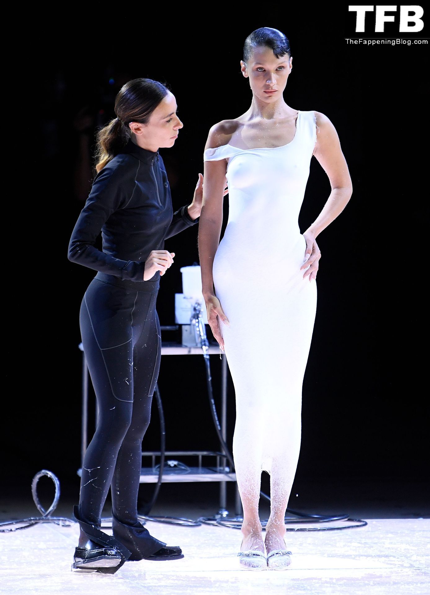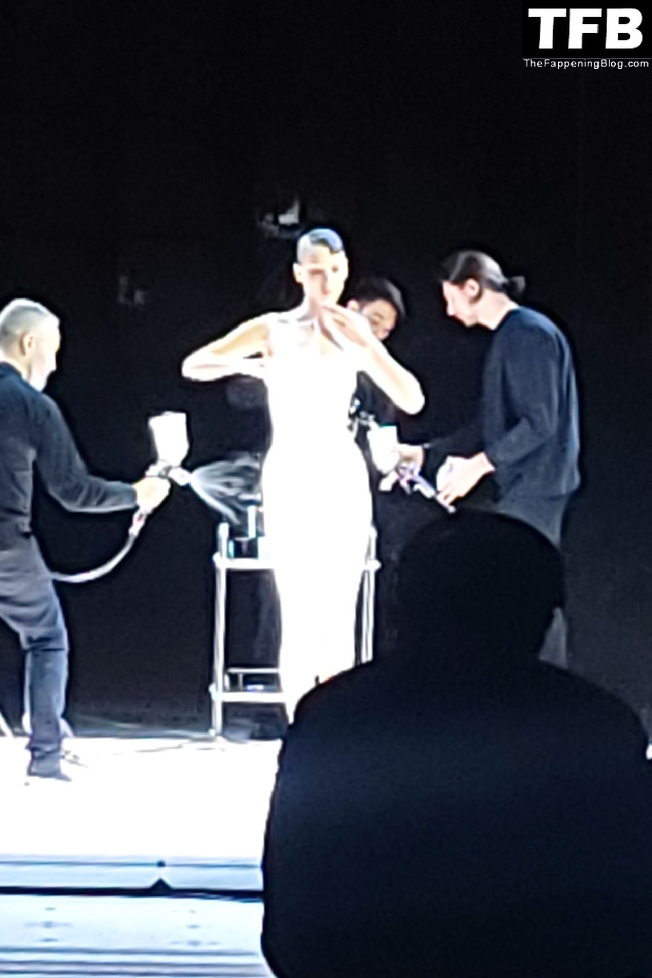 Bella Hadid aparece en el desfile de moda de Coperni durante la Semana de la Moda de París, 30/09/2022. La modelo recibe un vestido pintado con spray en medio del desfile.
