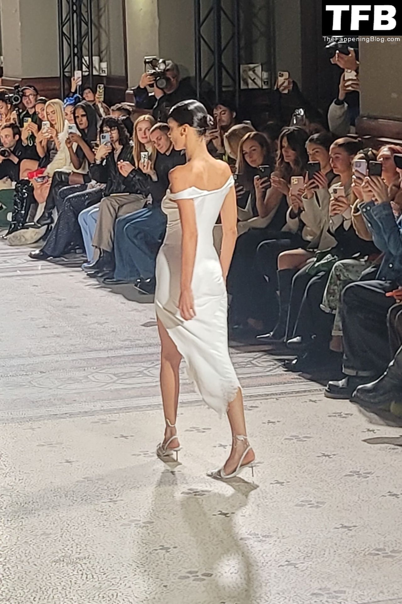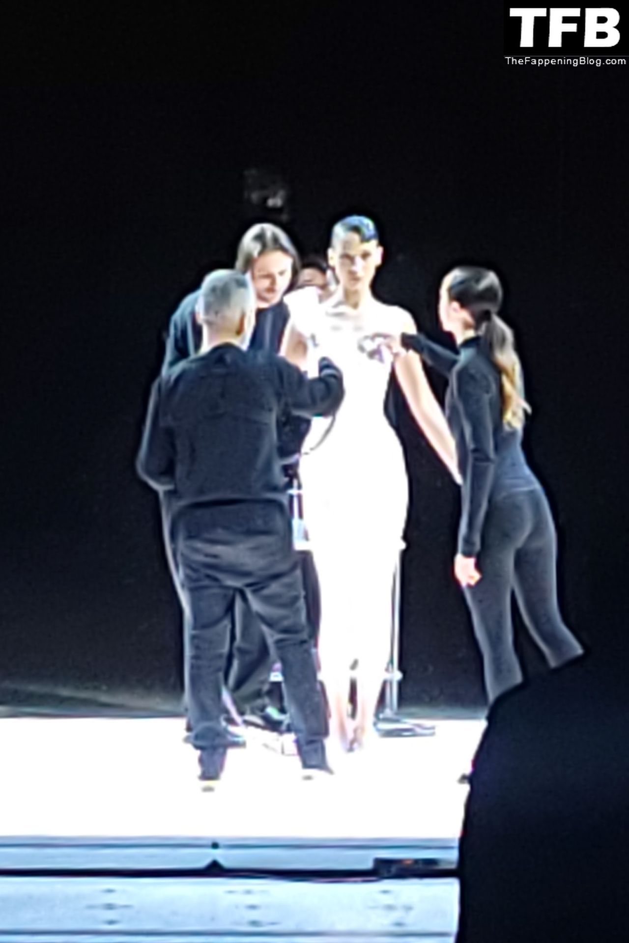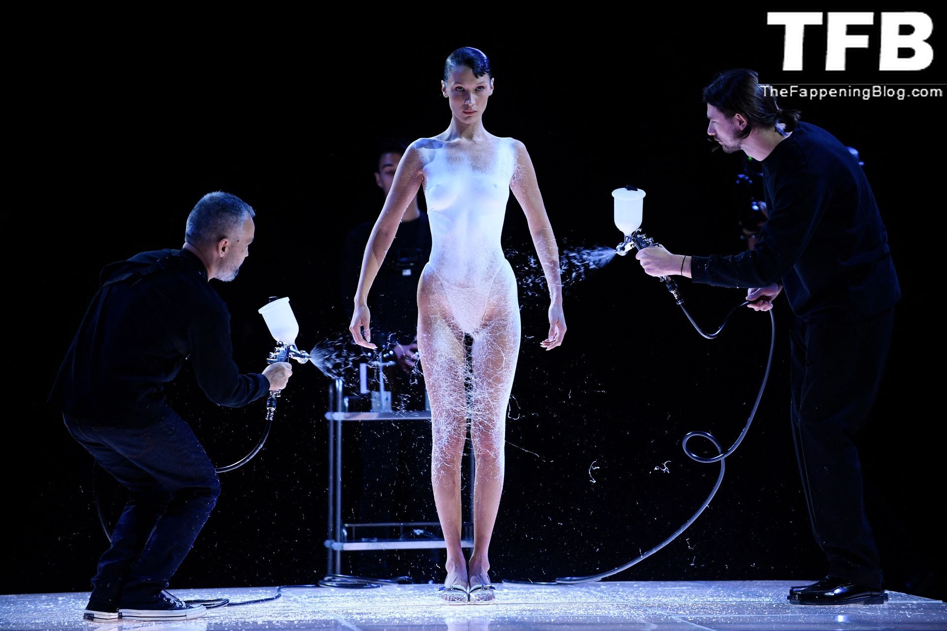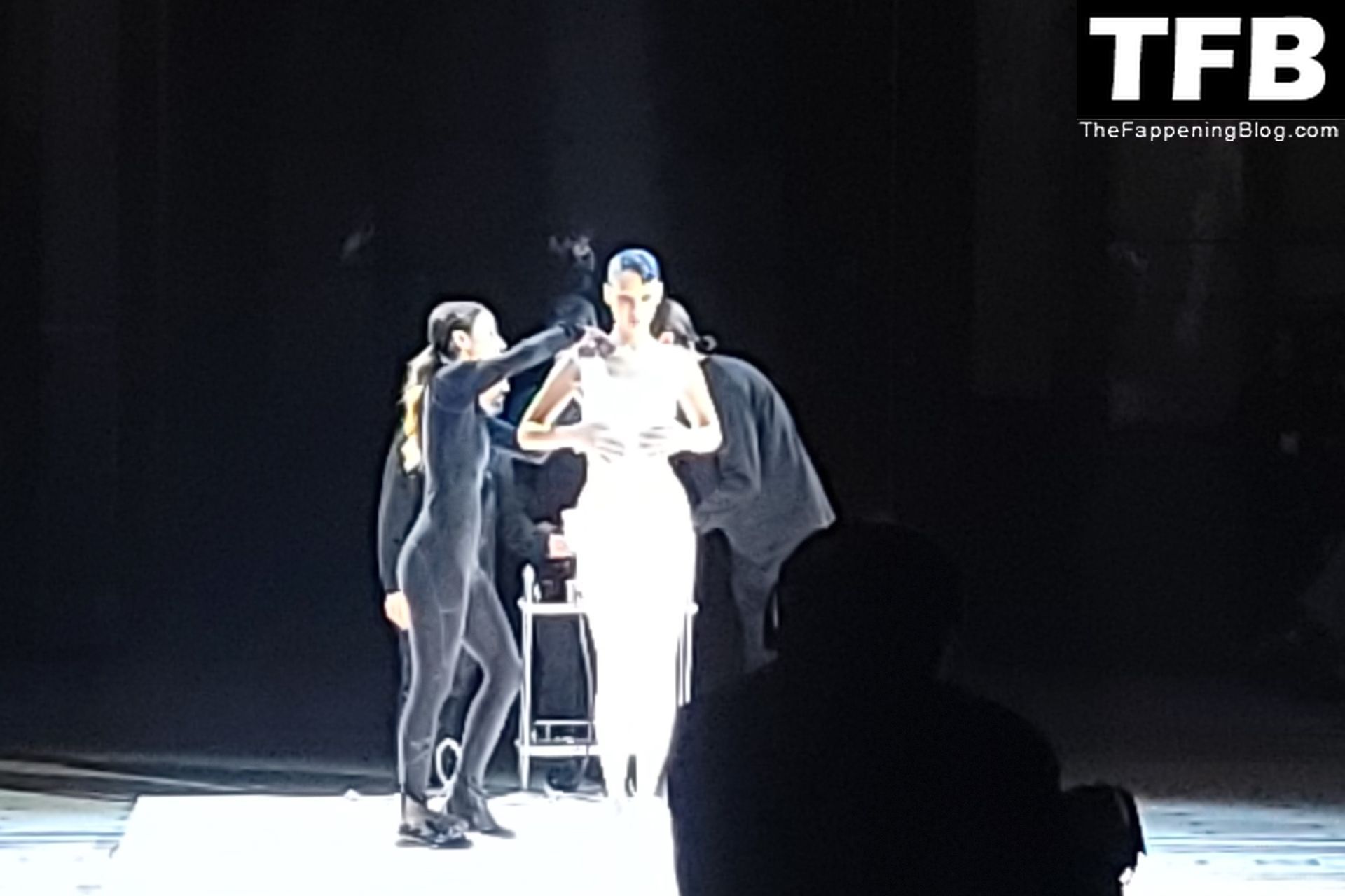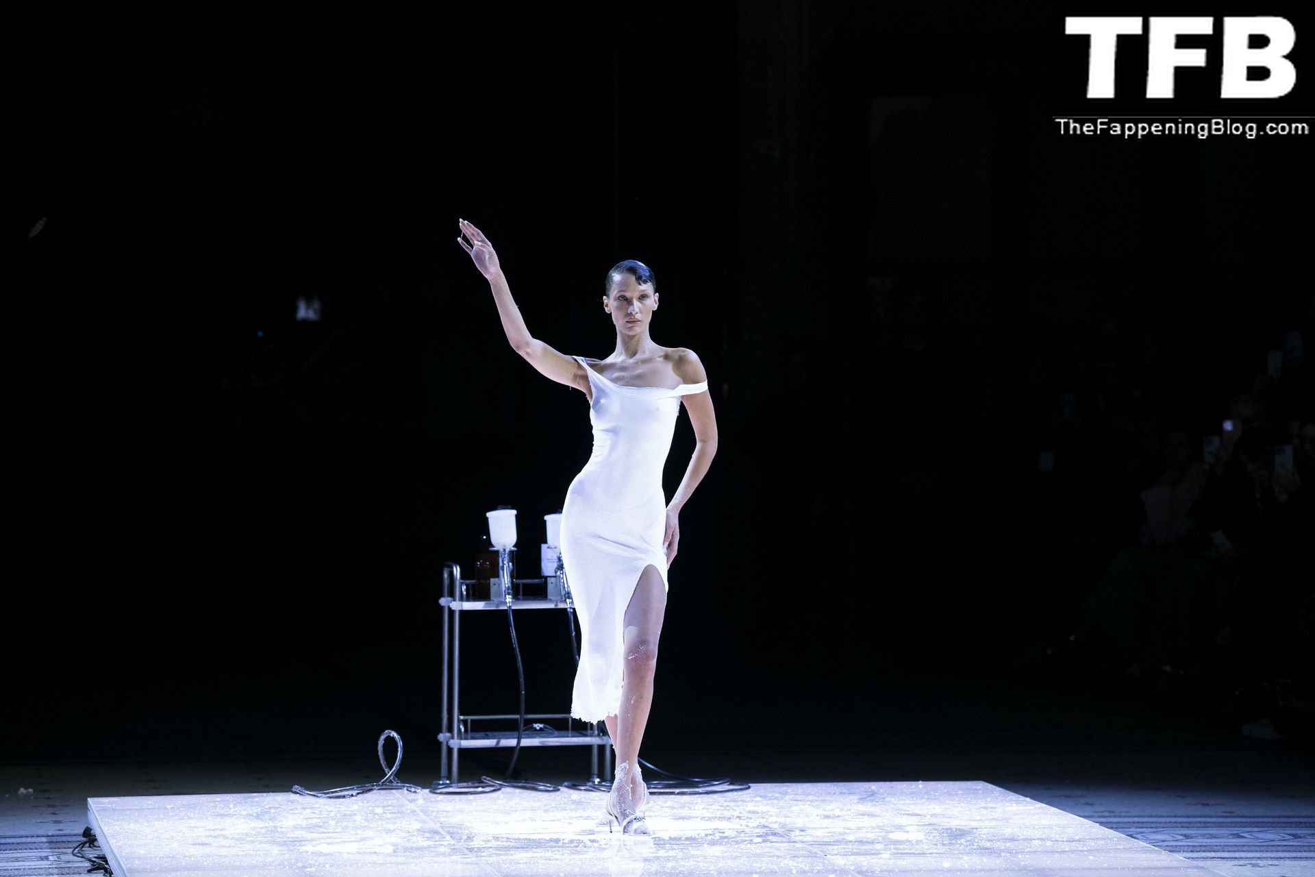 Bella Hadid aparece en el desfile de moda de Coperni durante la Semana de la Moda de París, 30/09/2022. La modelo recibe un vestido pintado con spray en medio del desfile.