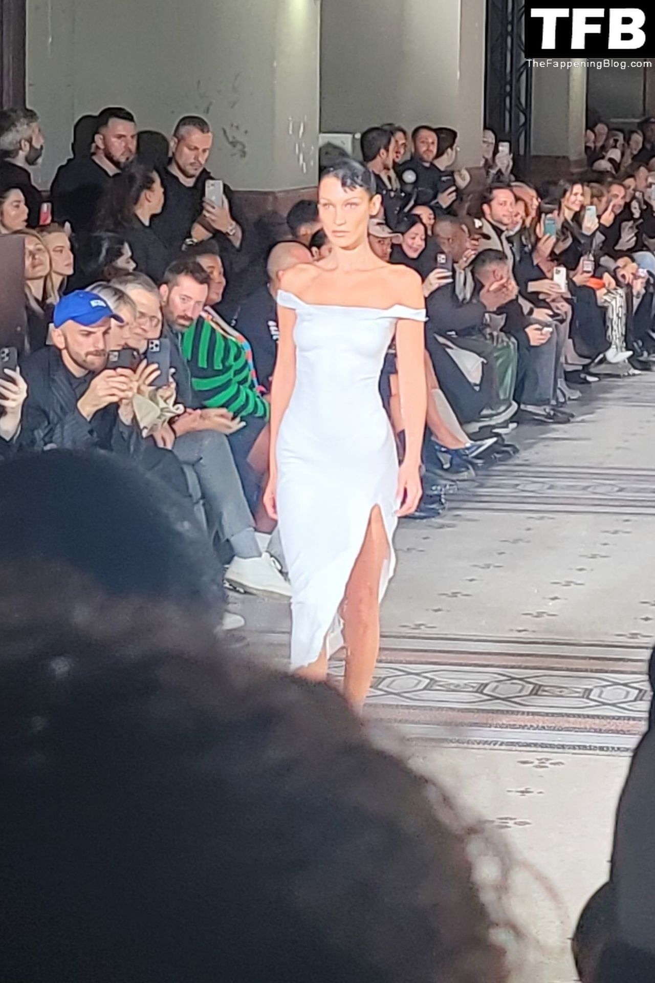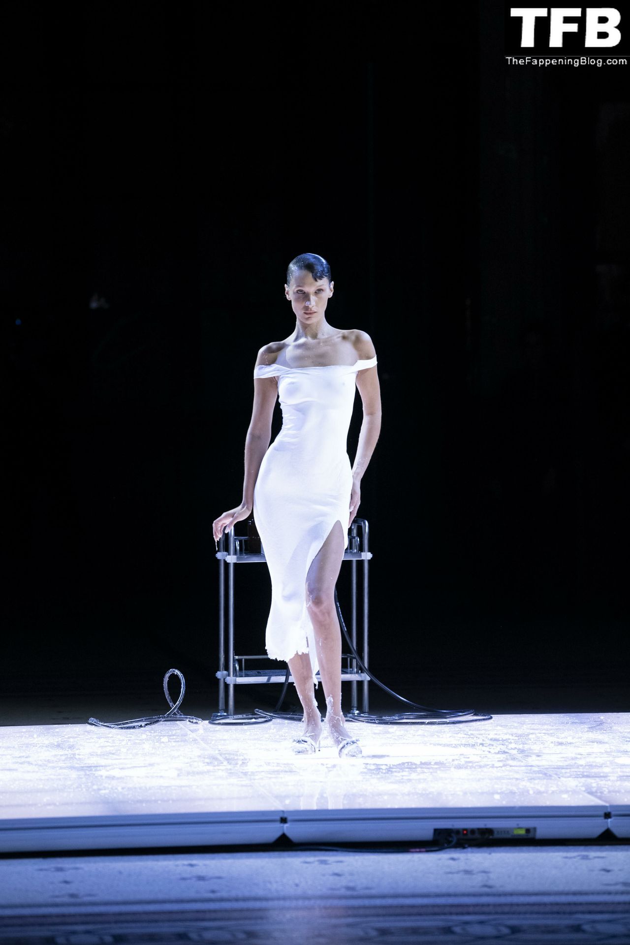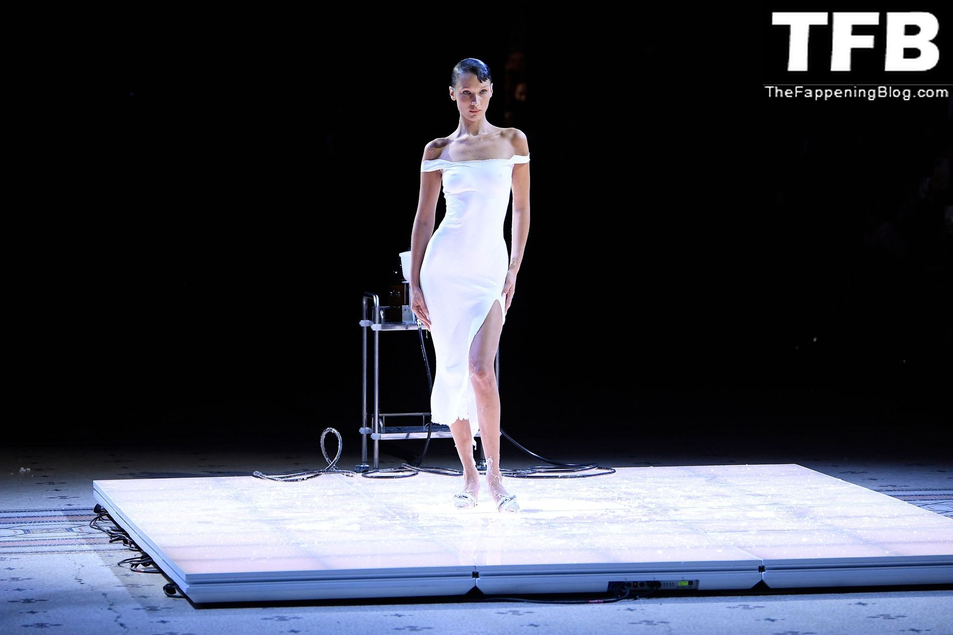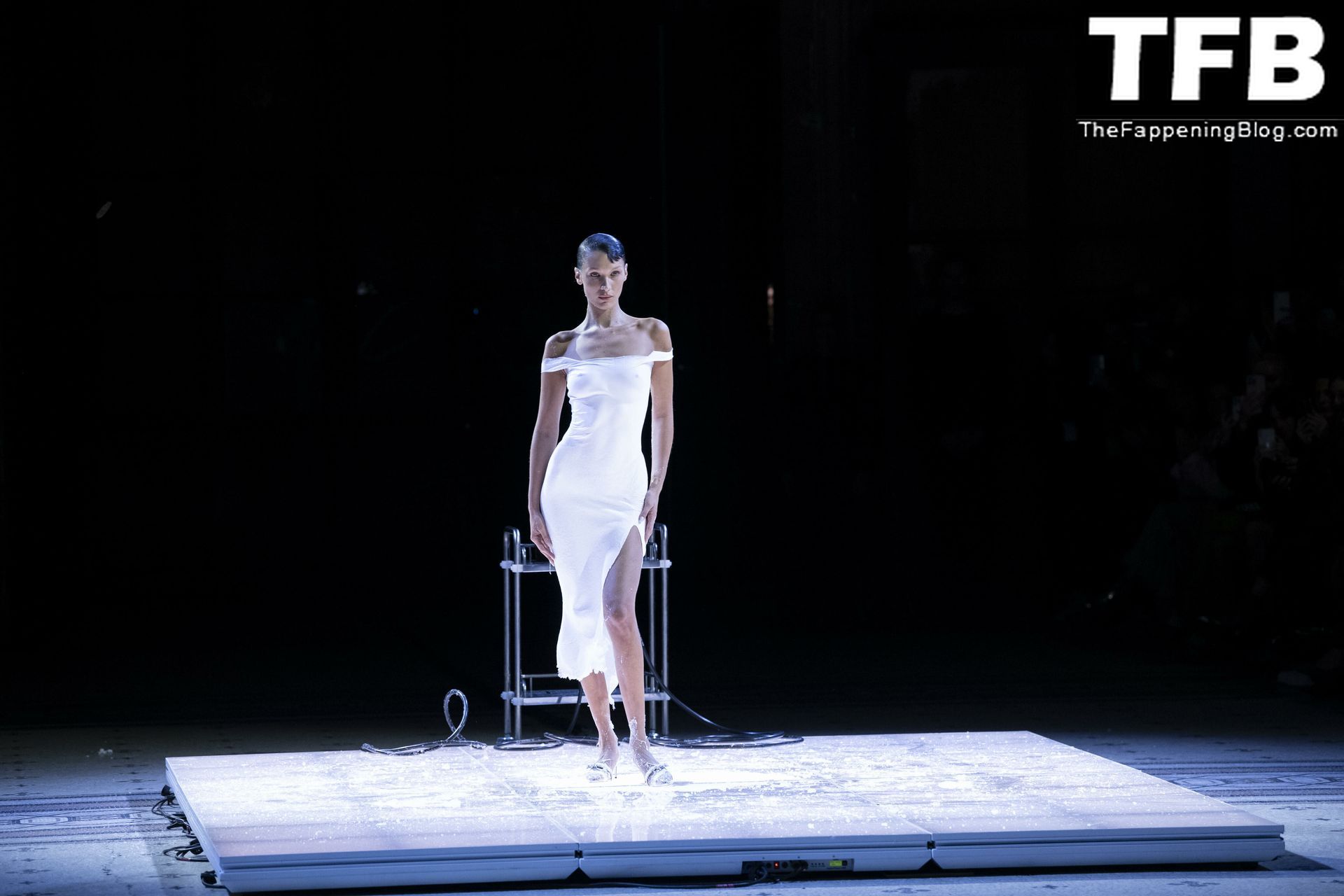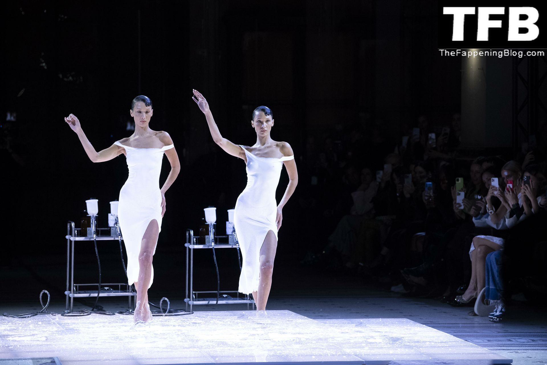 Bella Hadid aparece en el desfile de moda de Coperni durante la Semana de la Moda de París, 30/09/2022. La modelo recibe un vestido pintado con spray en medio del desfile.