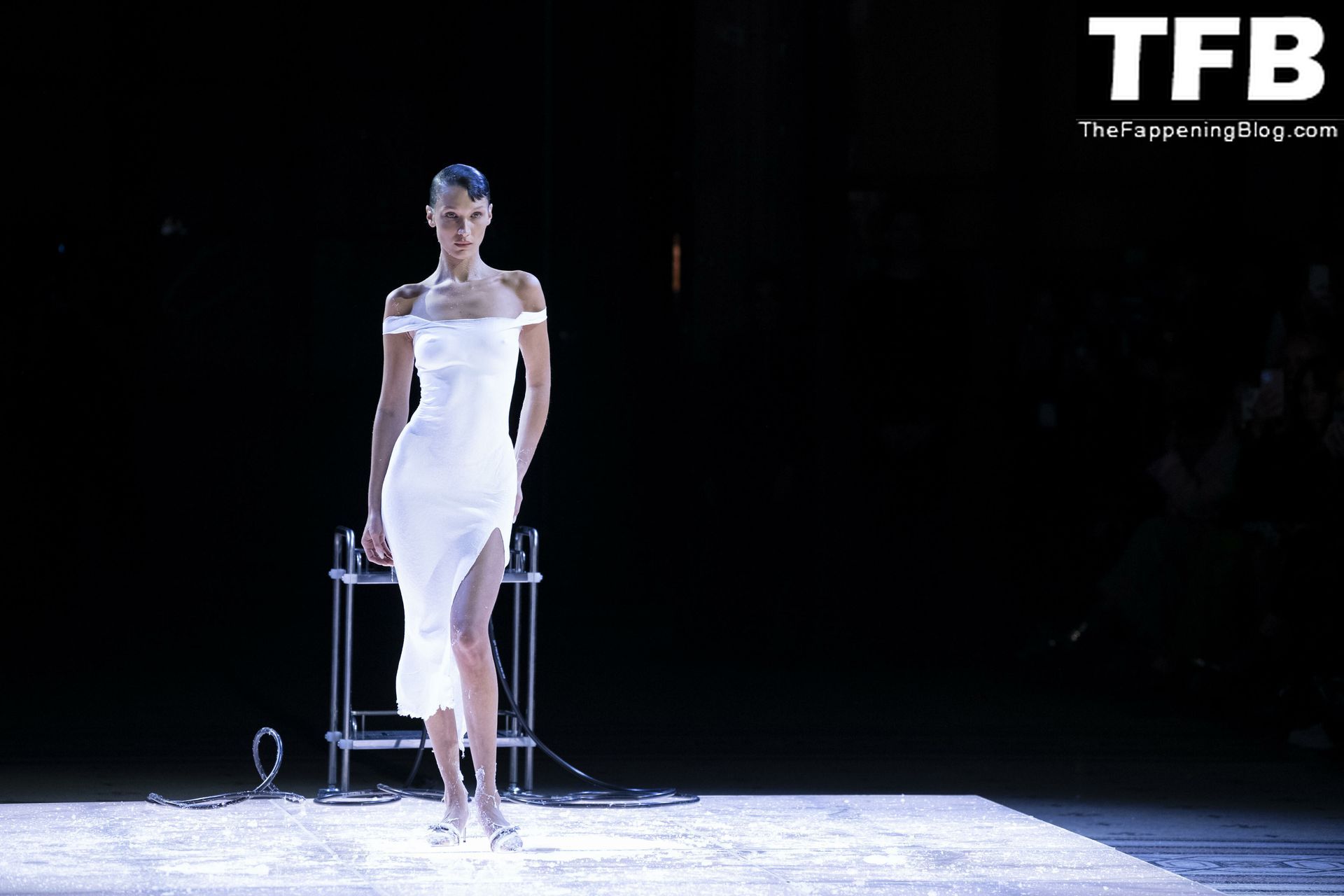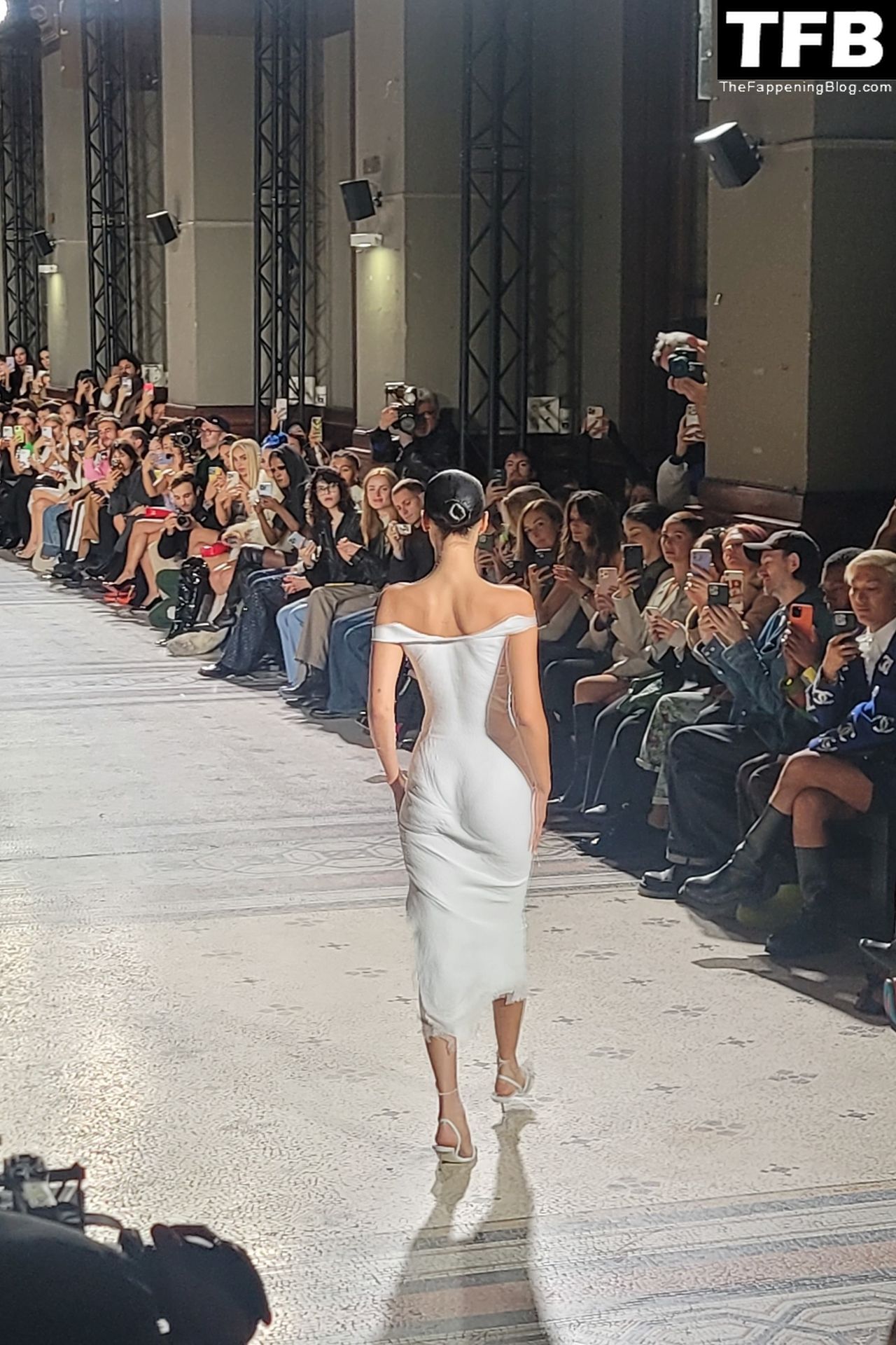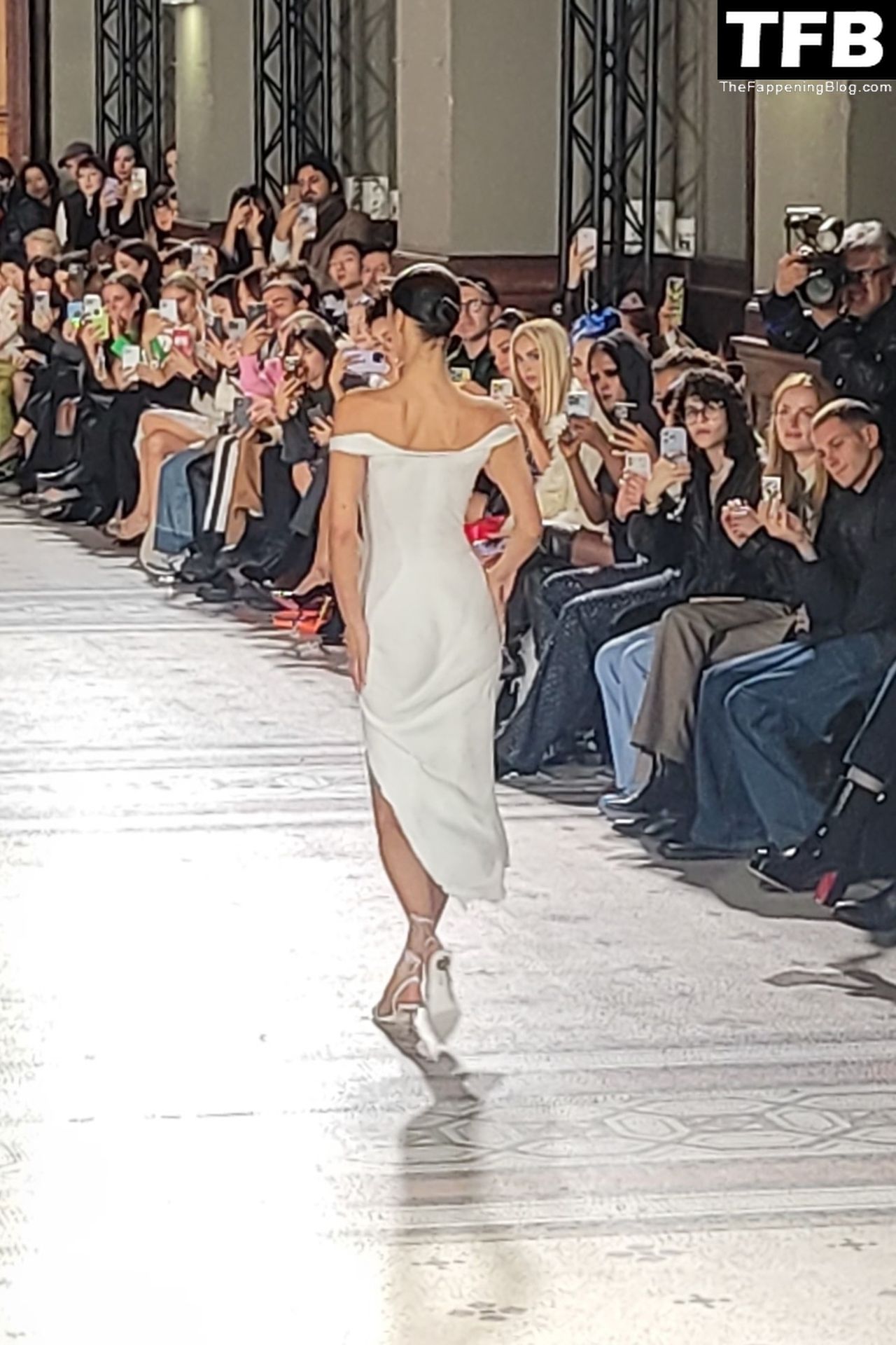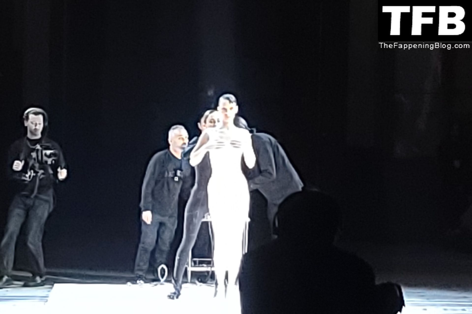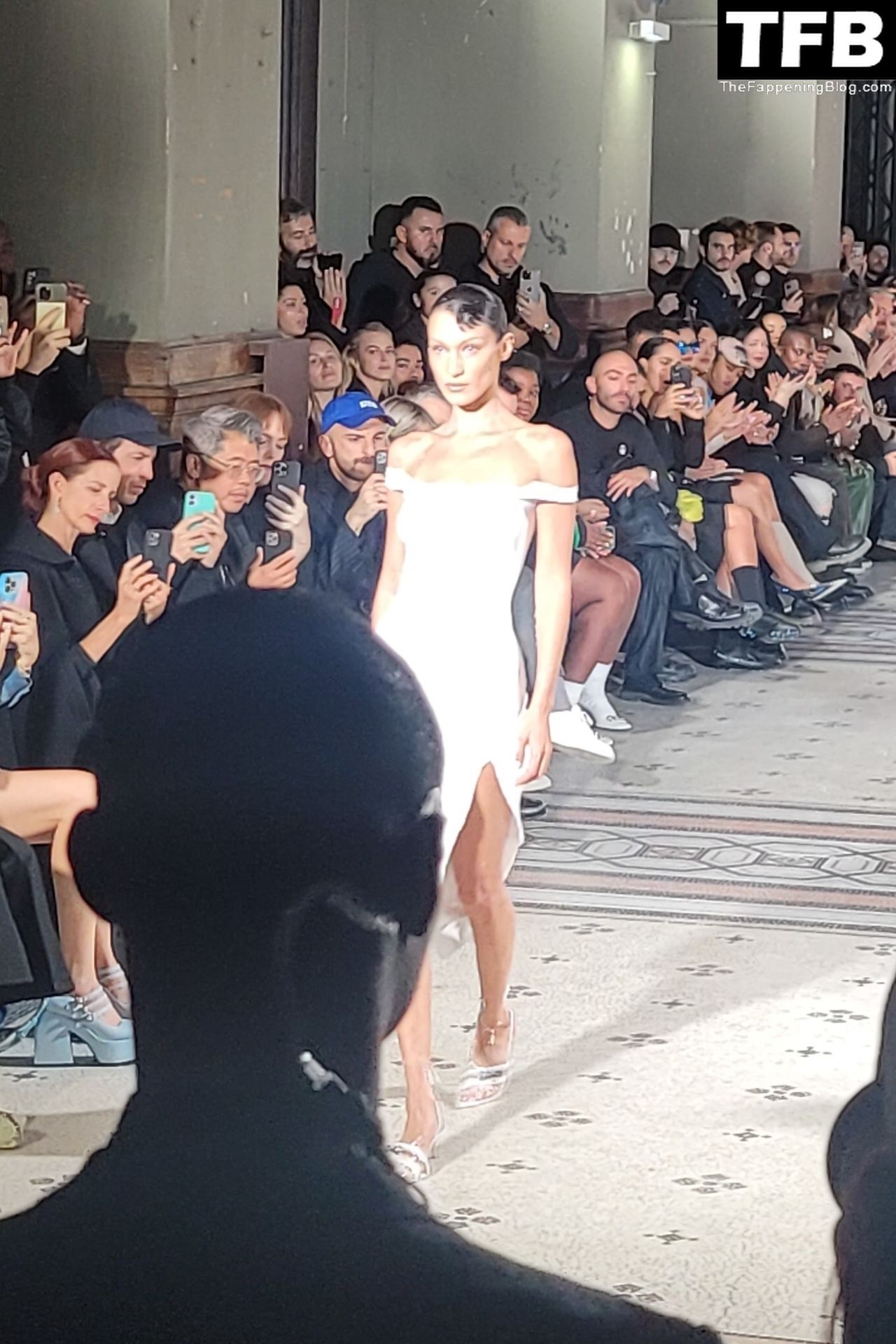 Bella Hadid aparece en el desfile de moda de Coperni durante la Semana de la Moda de París, 30/09/2022. La modelo recibe un vestido pintado con spray en medio del desfile.