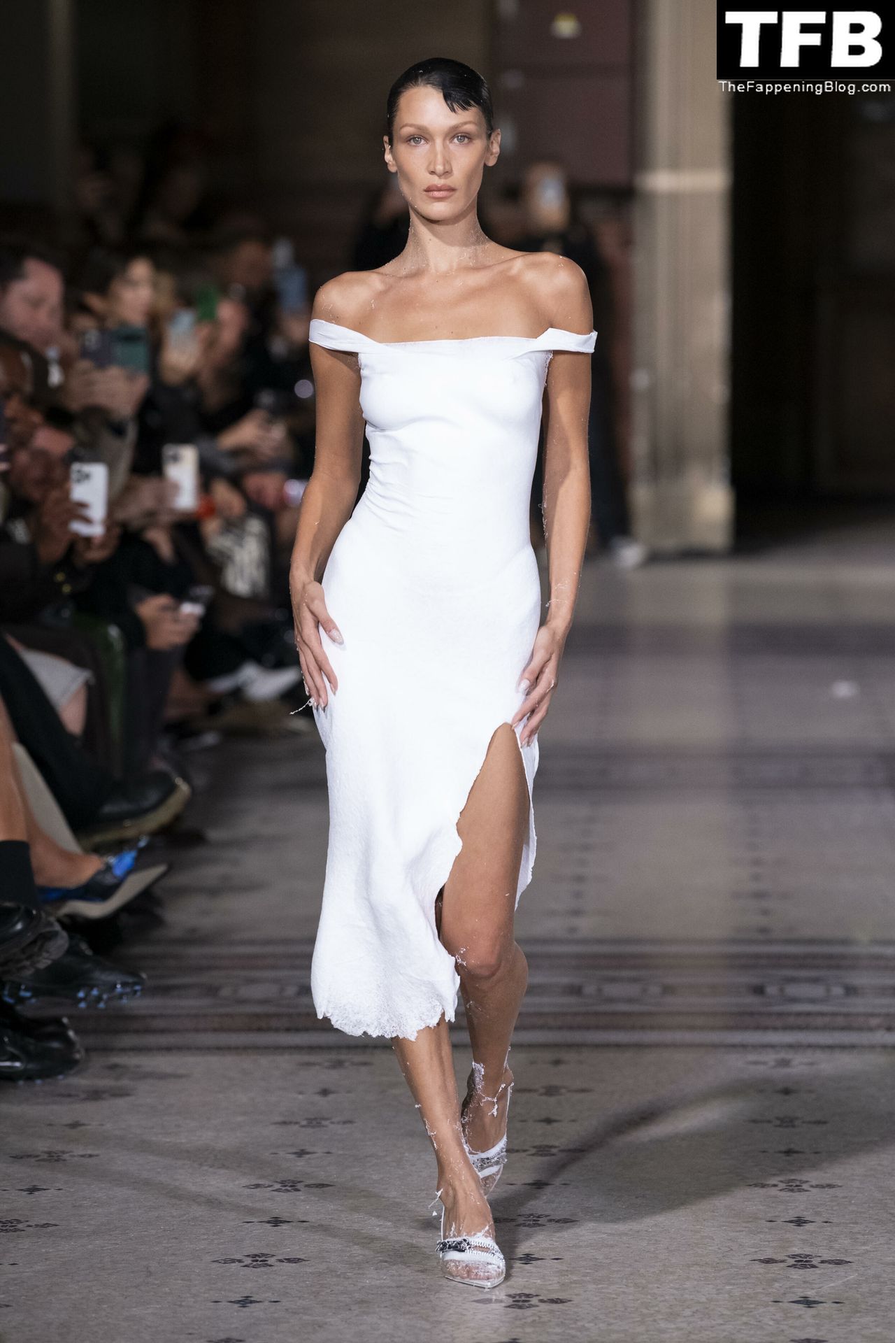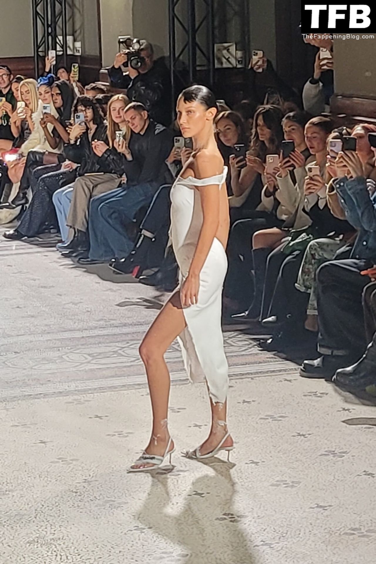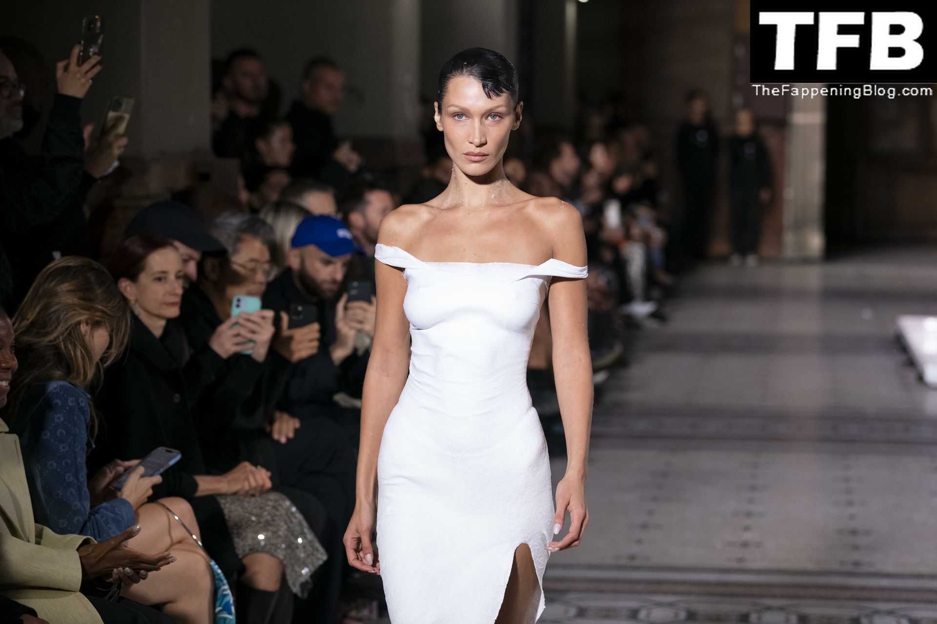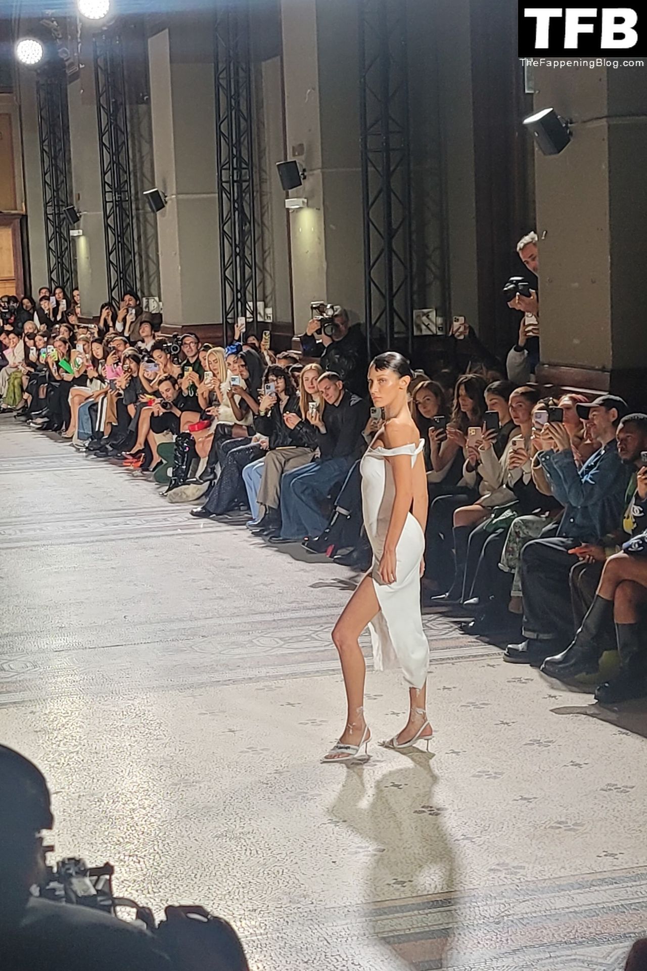 Bella Hadid aparece en el desfile de moda de Coperni durante la Semana de la Moda de París, 30/09/2022. La modelo recibe un vestido pintado con spray en medio del desfile.