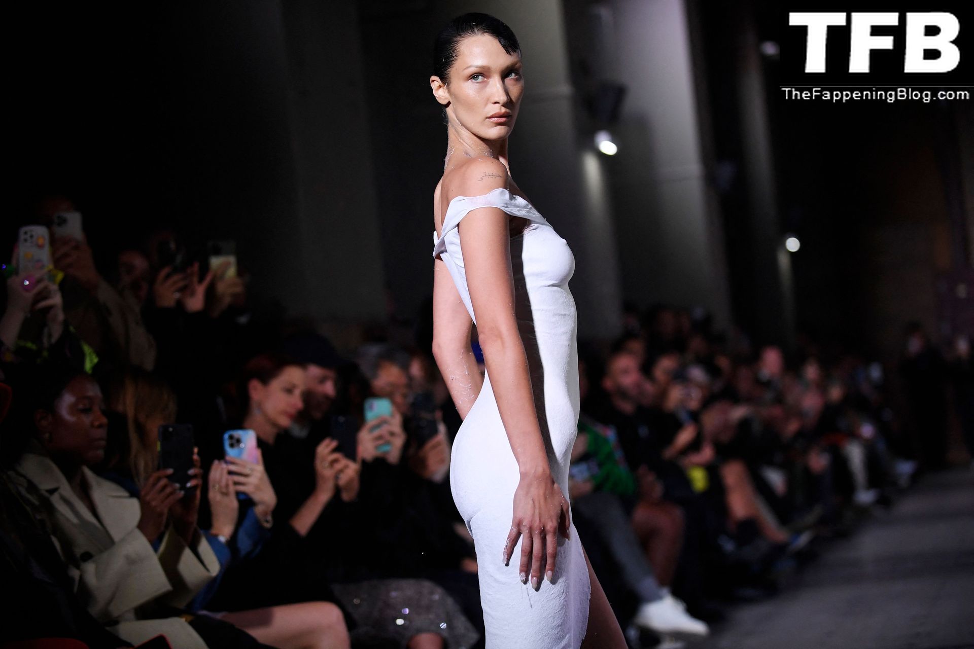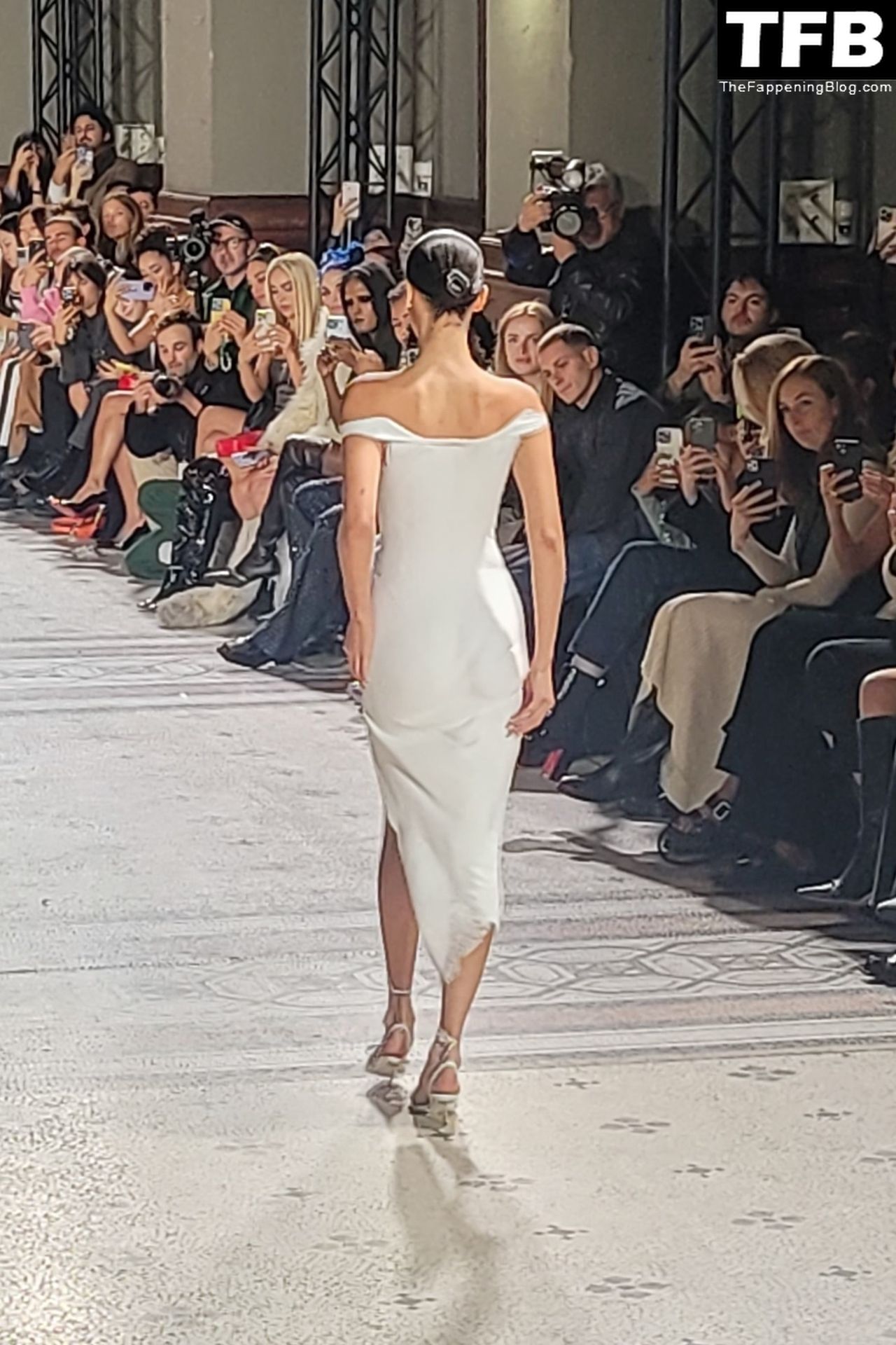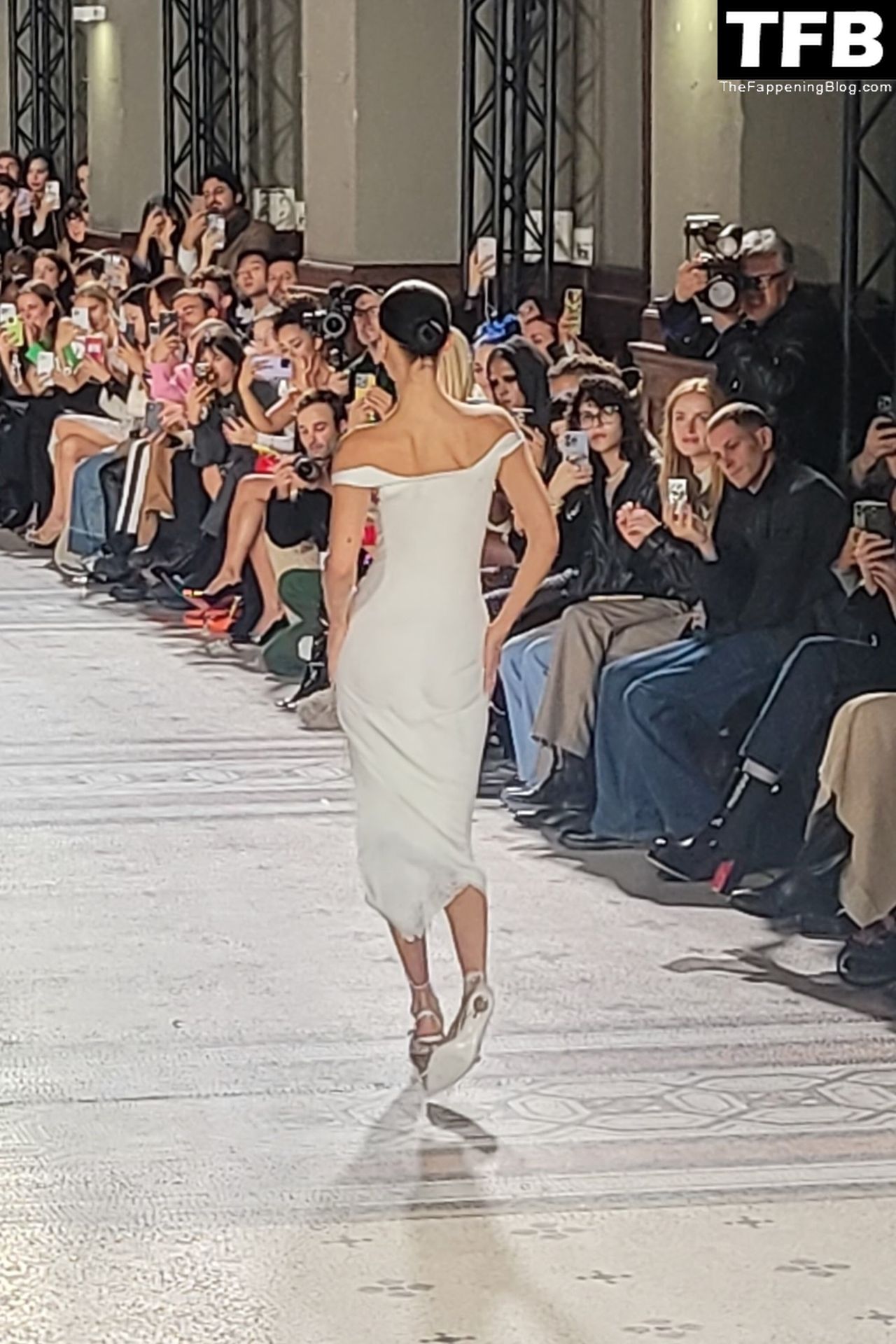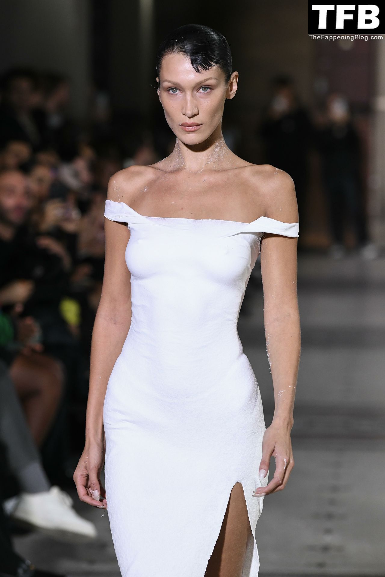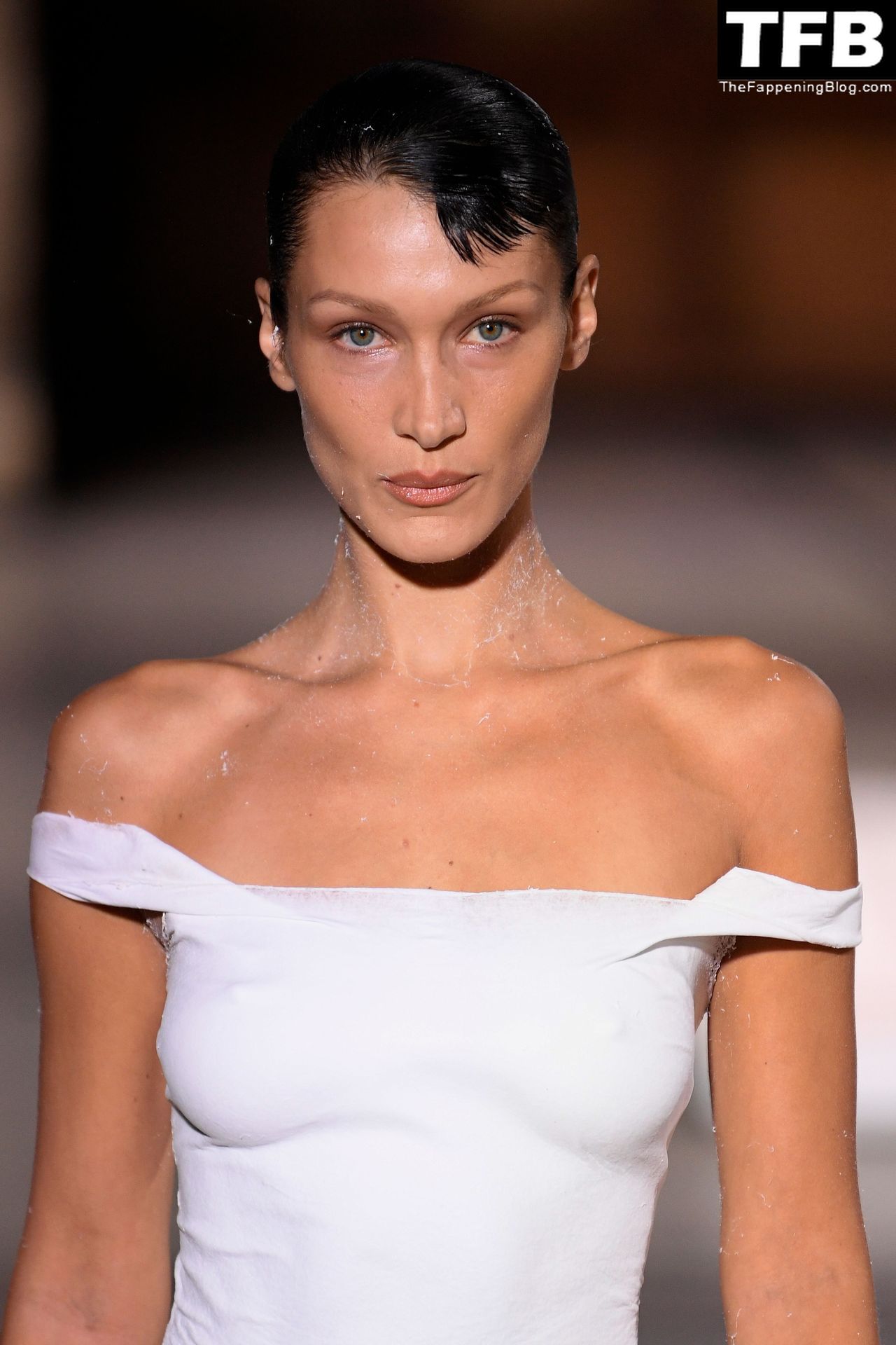 Bella Hadid aparece en el desfile de moda de Coperni durante la Semana de la Moda de París, 30/09/2022. La modelo recibe un vestido pintado con spray en medio del desfile.