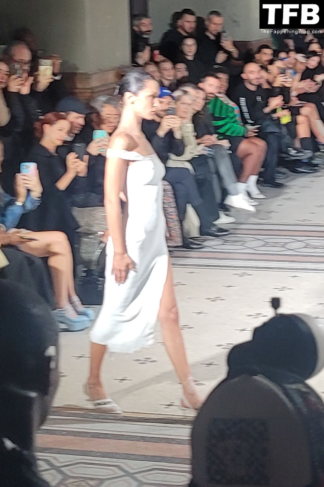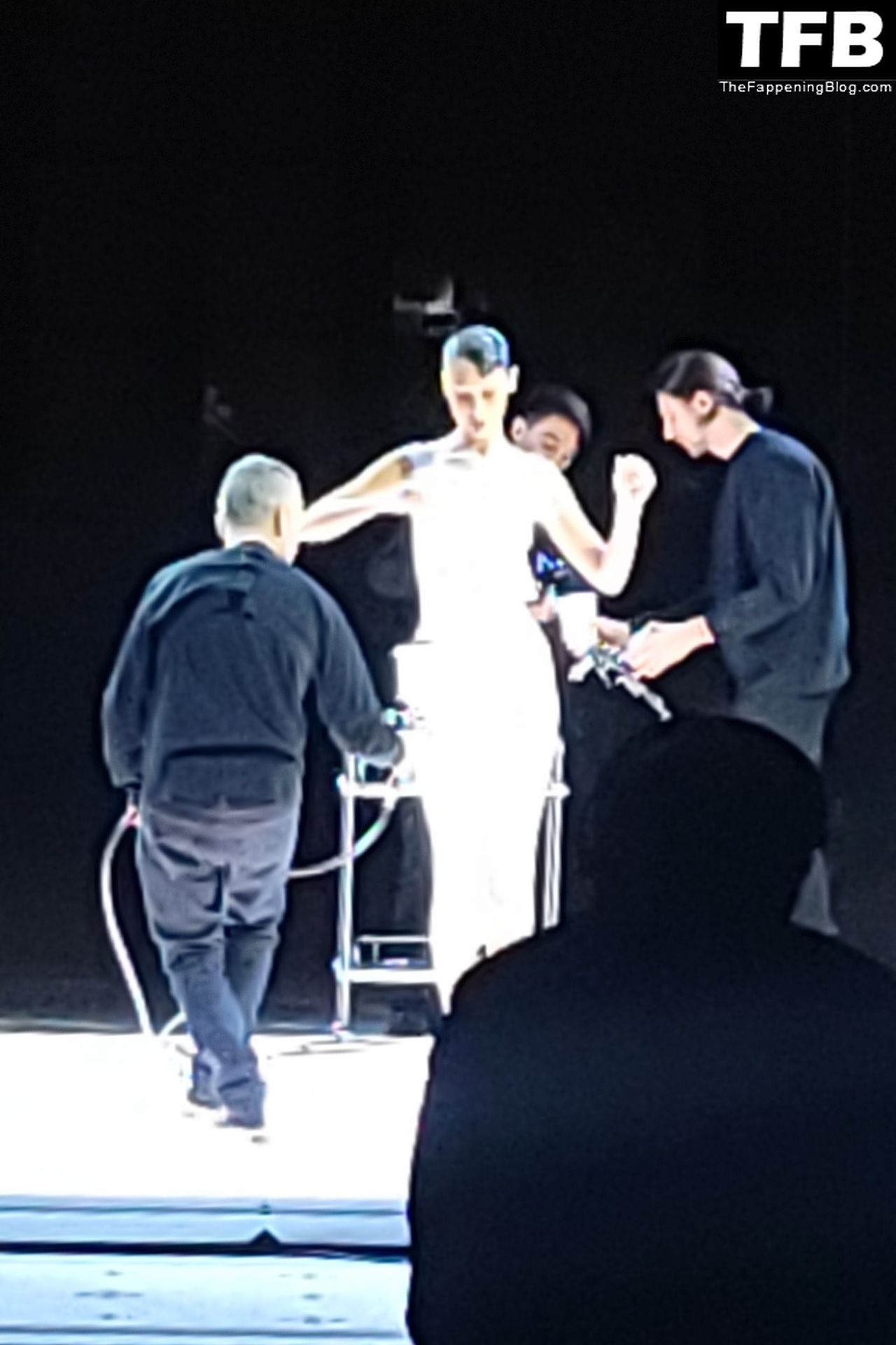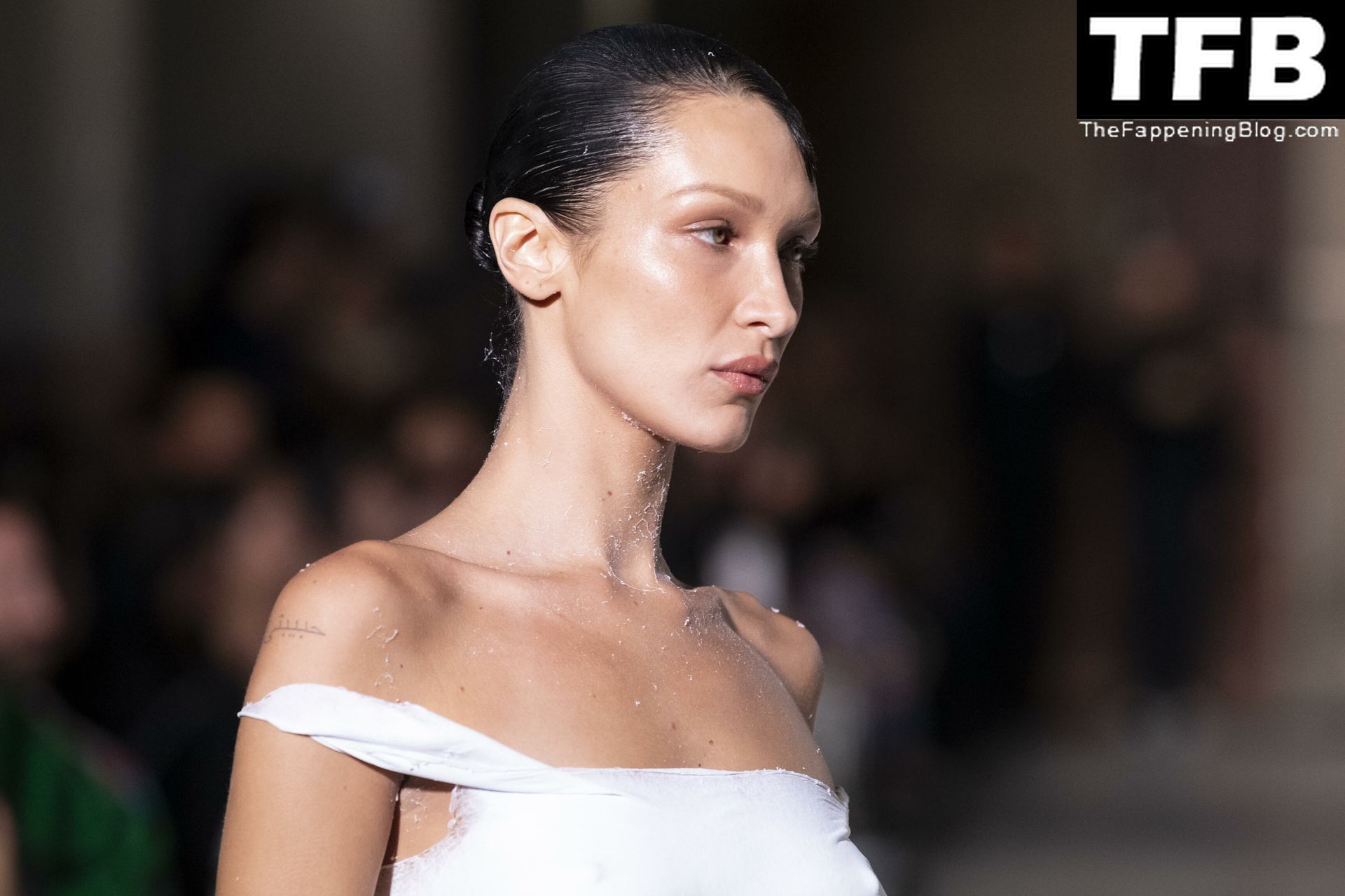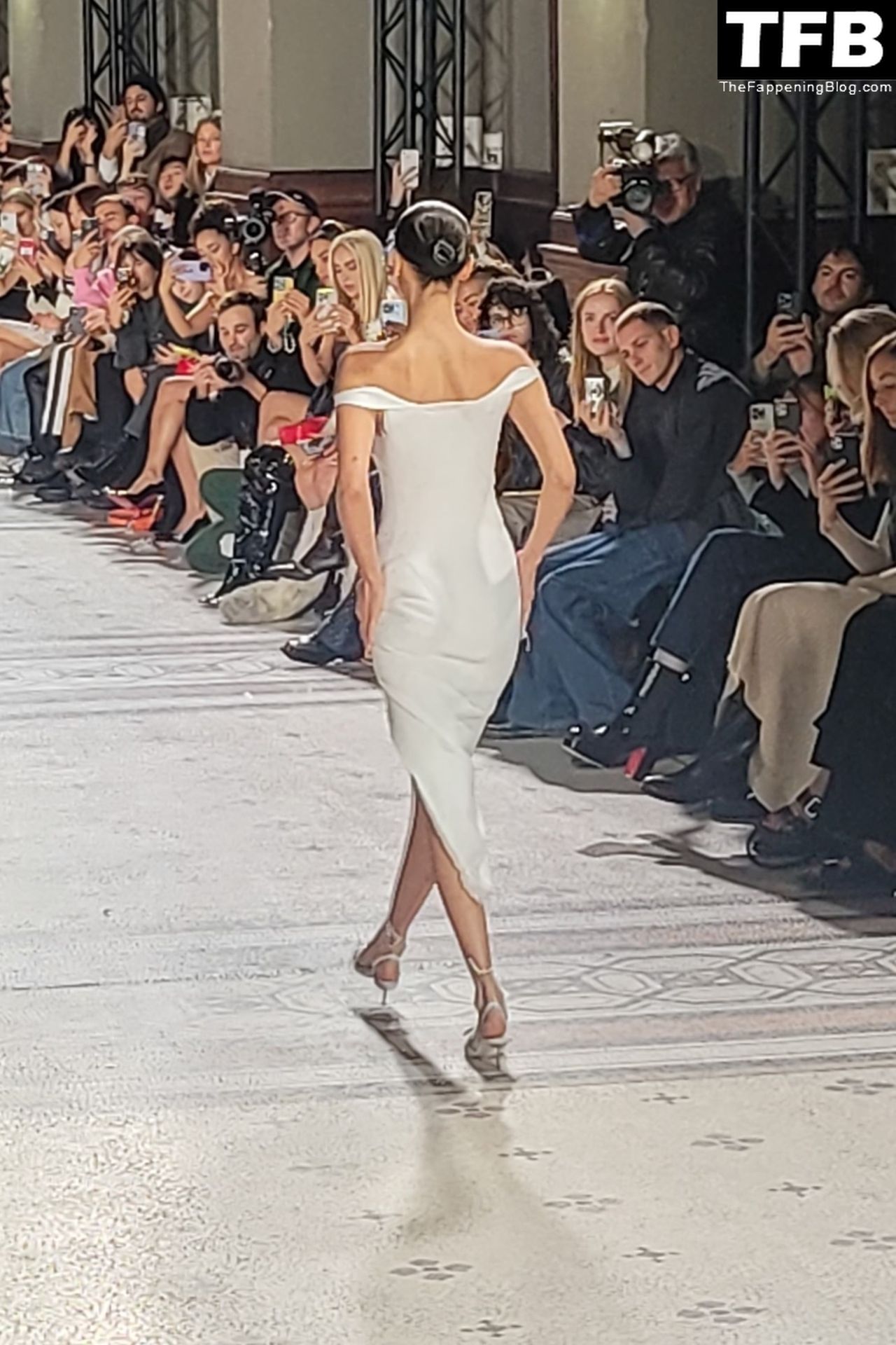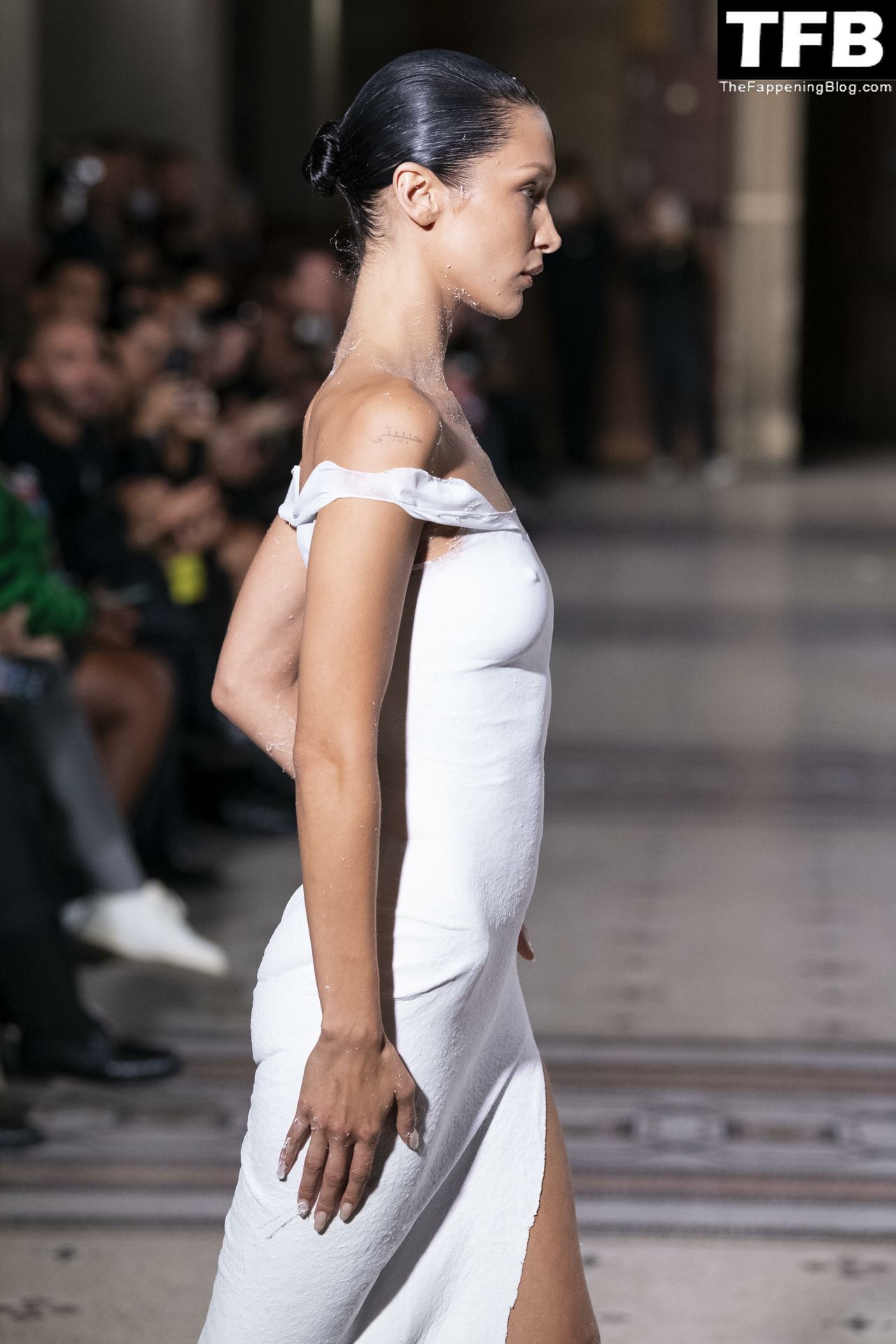 Bella Hadid aparece en el desfile de moda de Coperni durante la Semana de la Moda de París, 30/09/2022. La modelo recibe un vestido pintado con spray en medio del desfile.