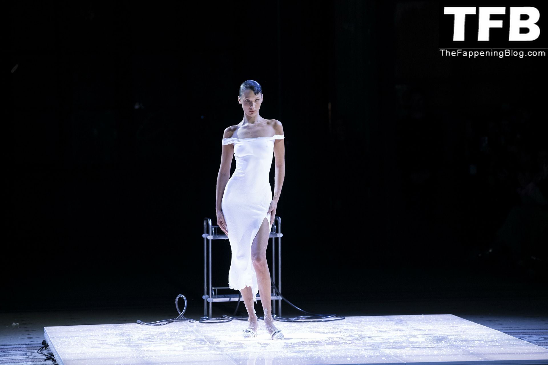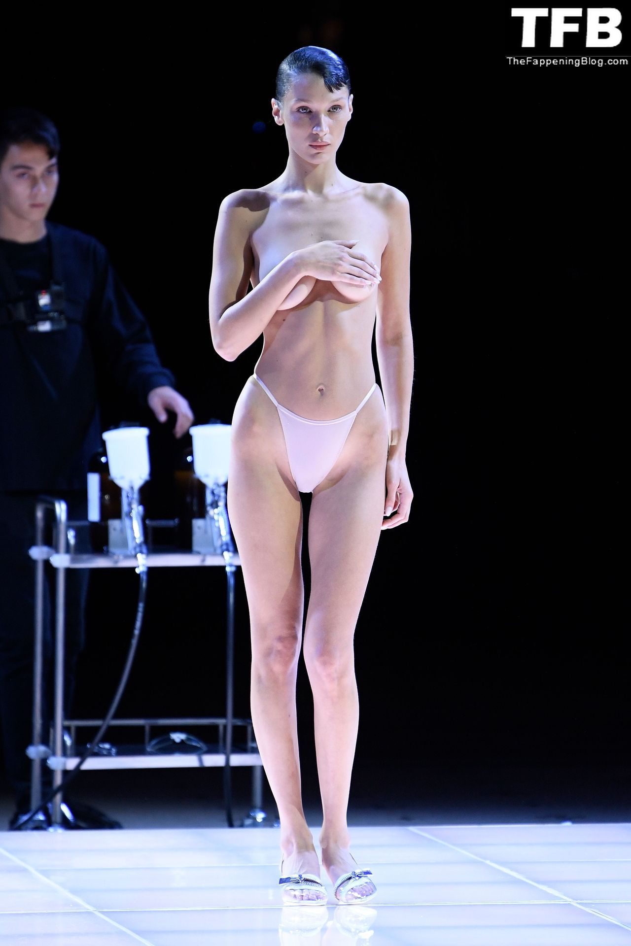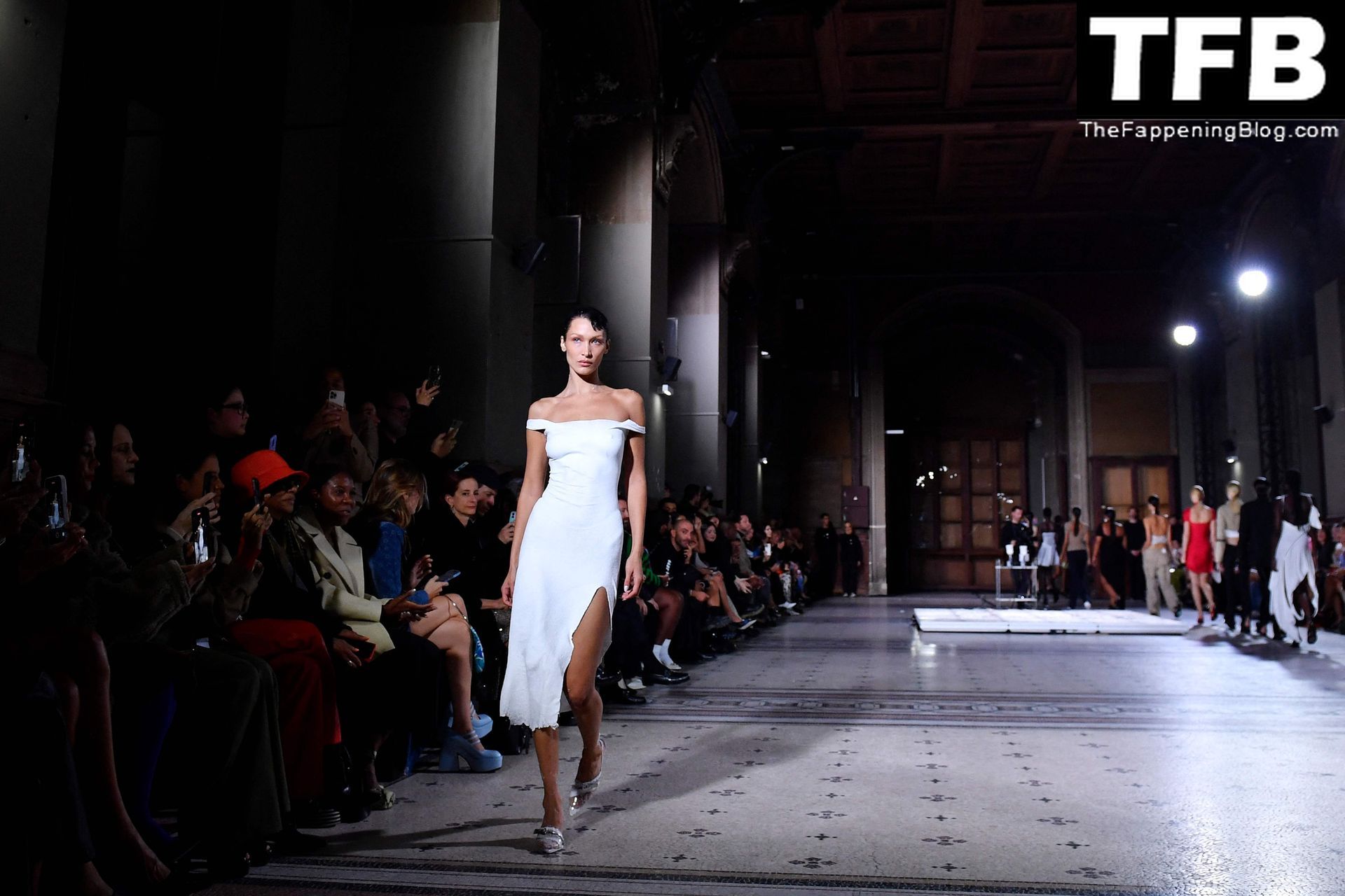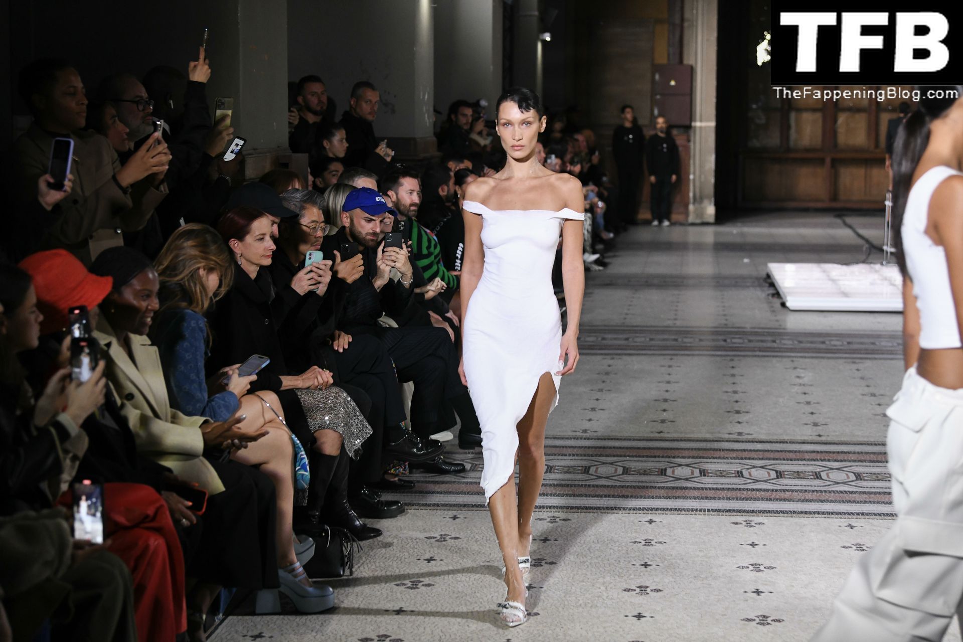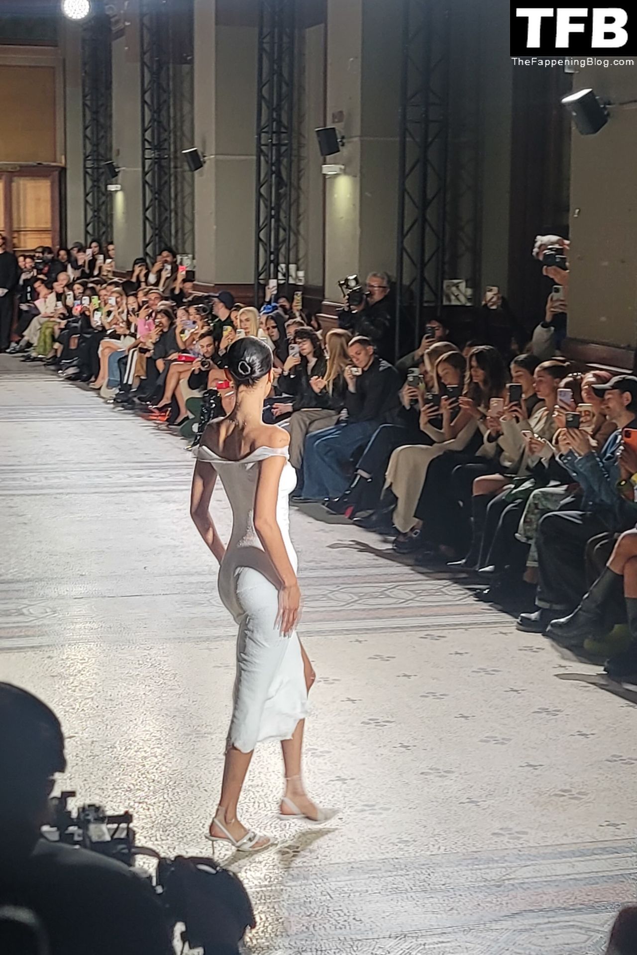 Bella Hadid aparece en el desfile de moda de Coperni durante la Semana de la Moda de París, 30/09/2022. La modelo recibe un vestido pintado con spray en medio del desfile.