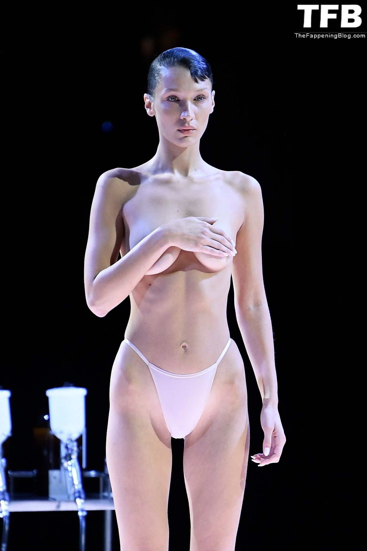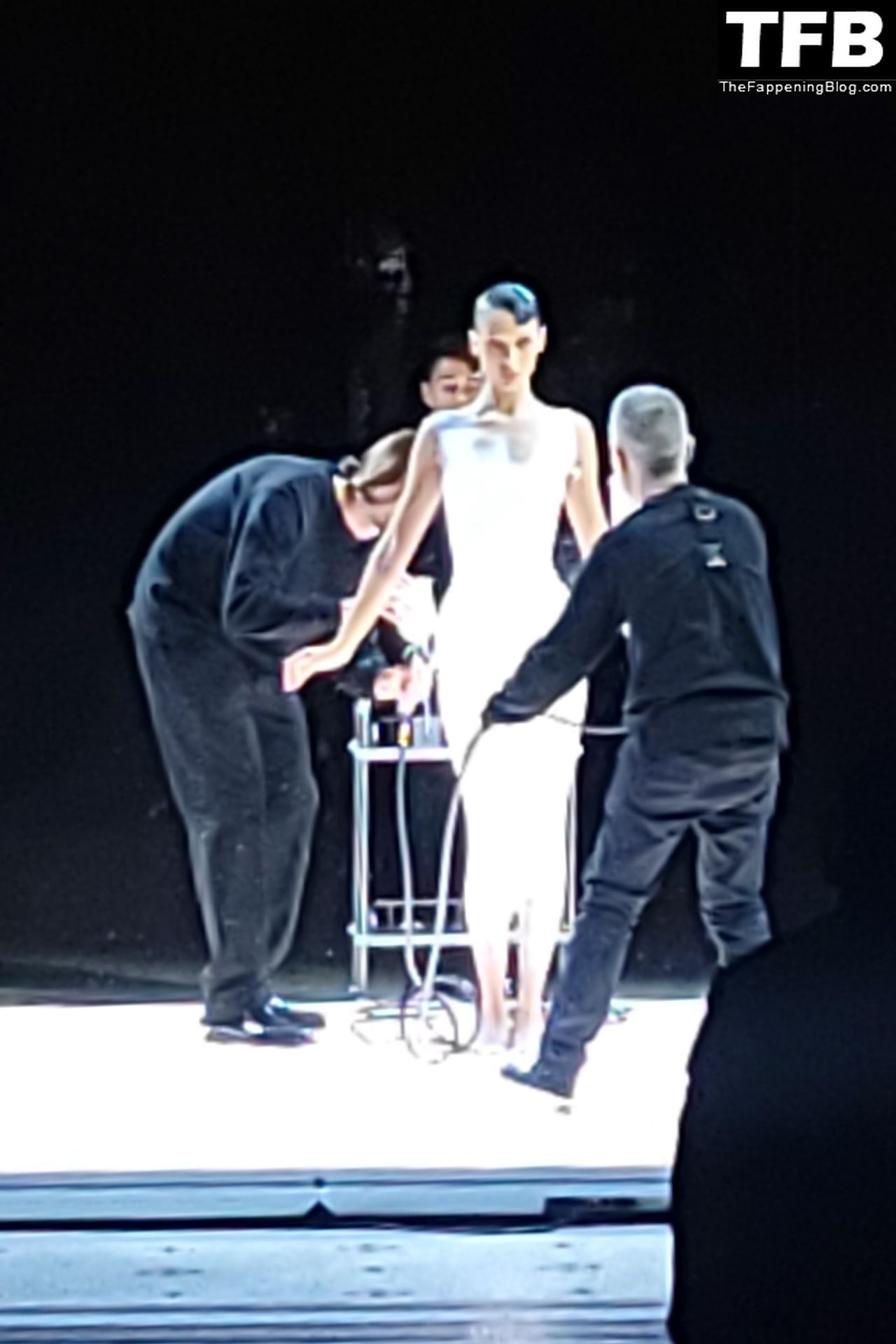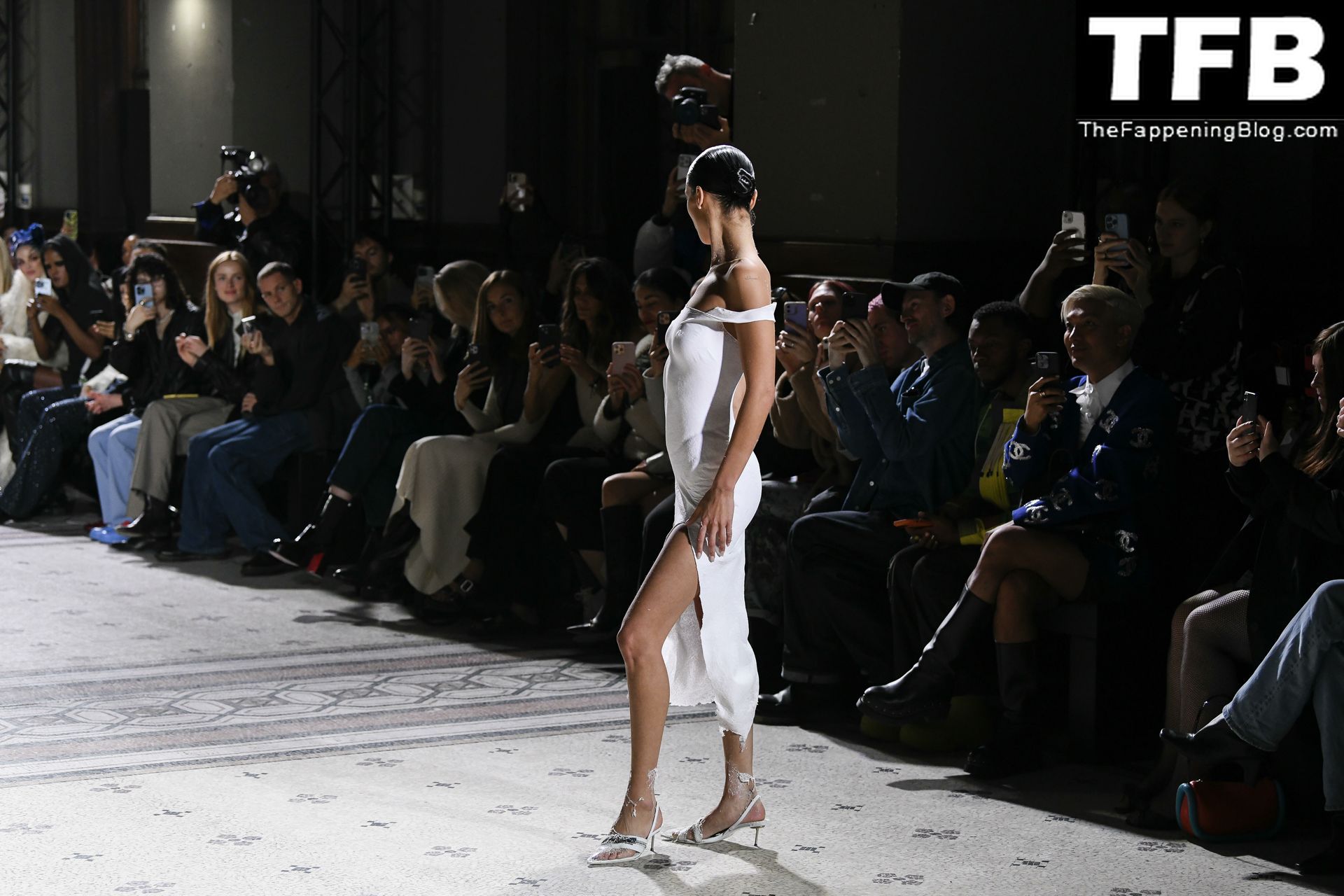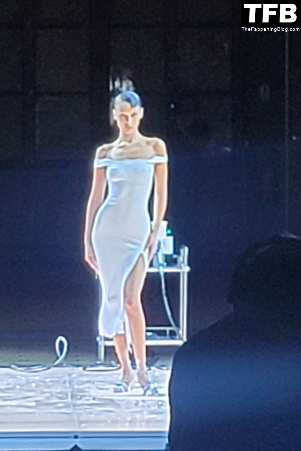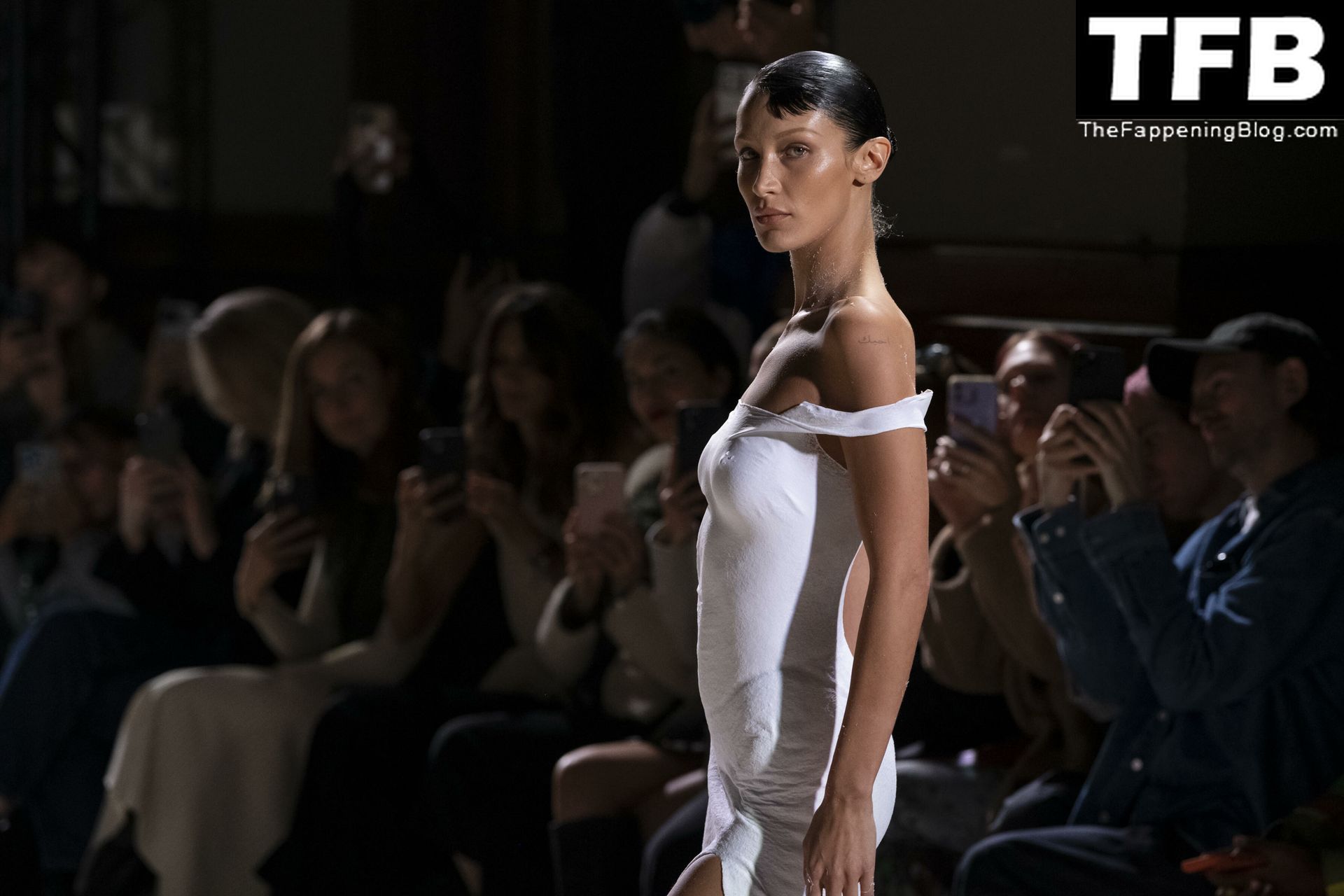 Bella Hadid aparece en el desfile de moda de Coperni durante la Semana de la Moda de París, 30/09/2022. La modelo recibe un vestido pintado con spray en medio del desfile.