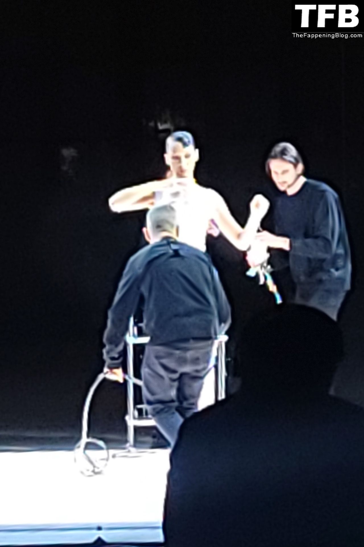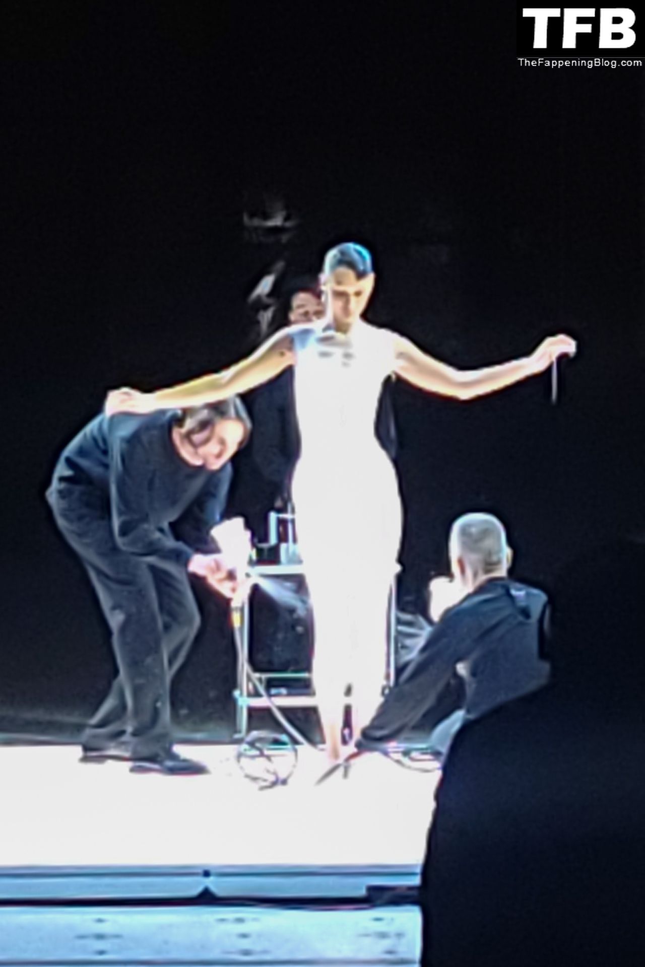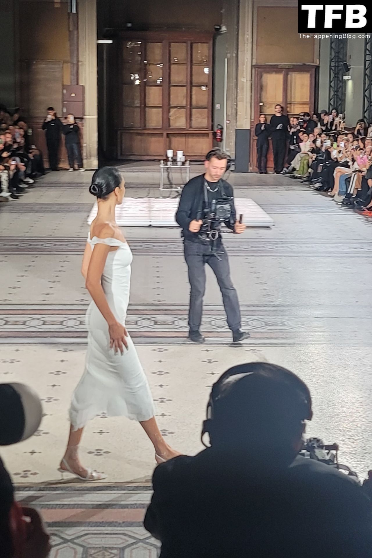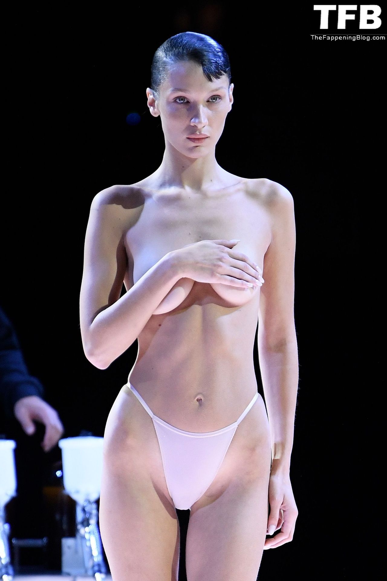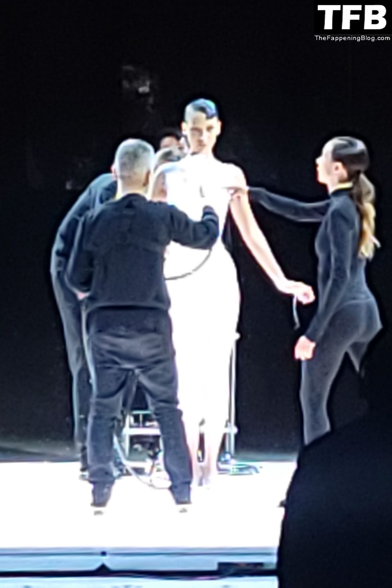 Bella Hadid aparece en el desfile de moda de Coperni durante la Semana de la Moda de París, 30/09/2022. La modelo recibe un vestido pintado con spray en medio del desfile.