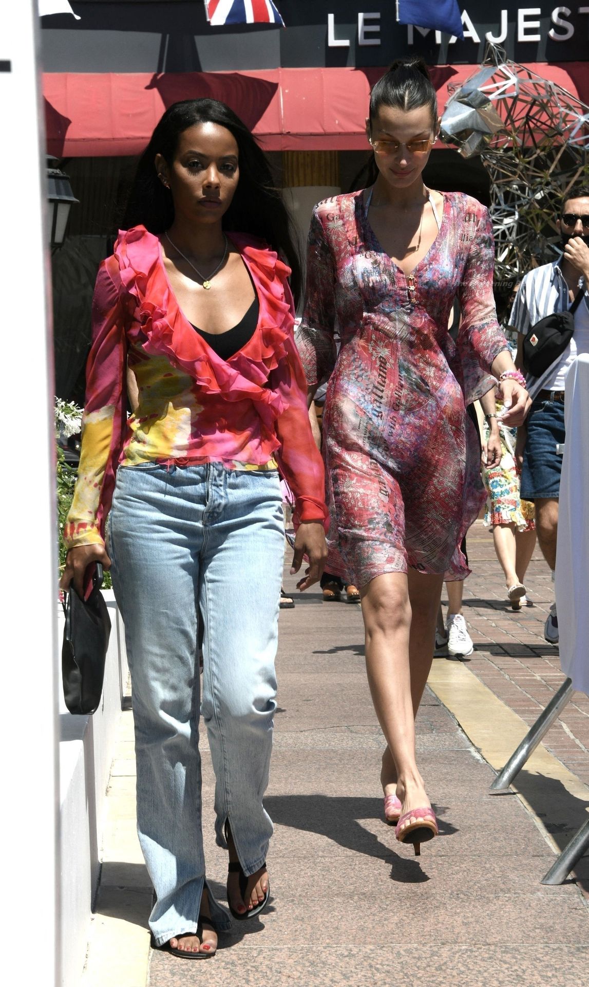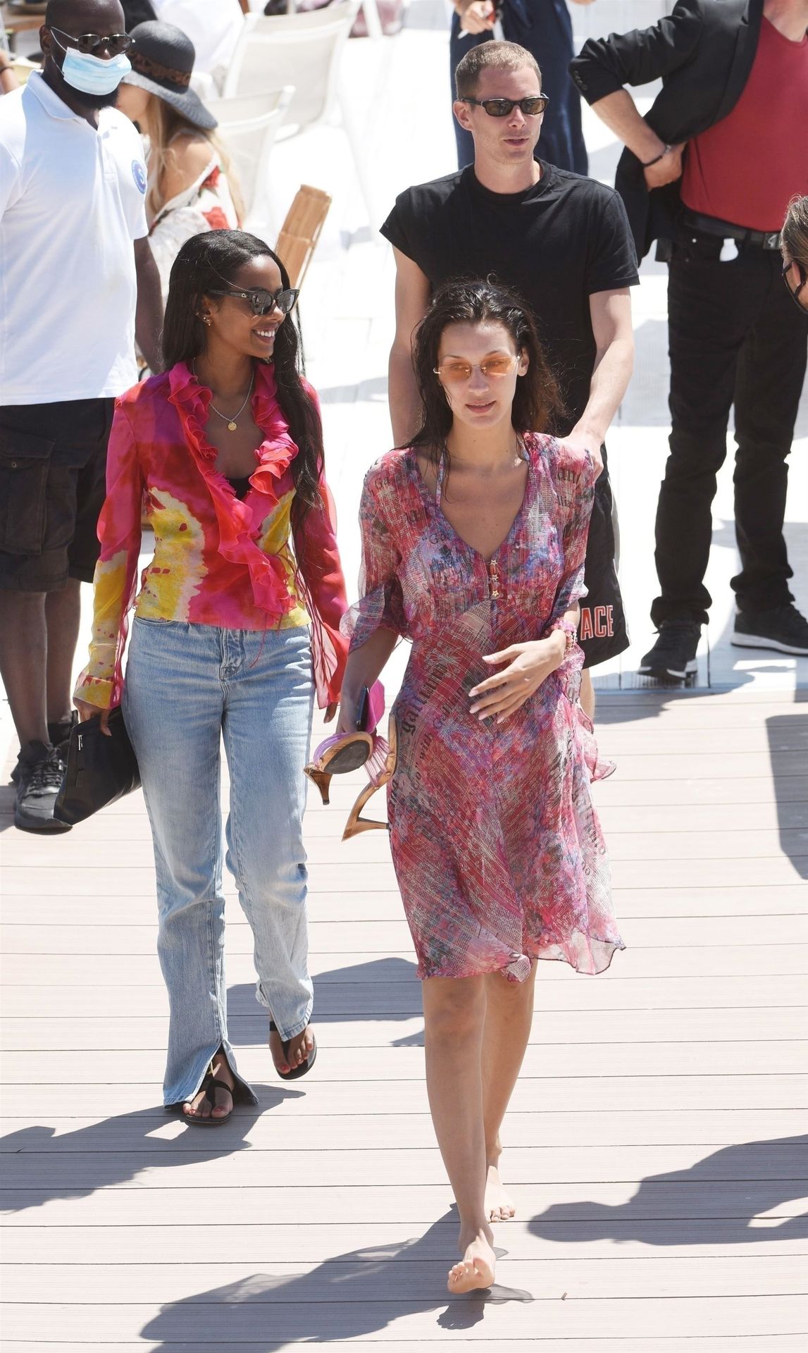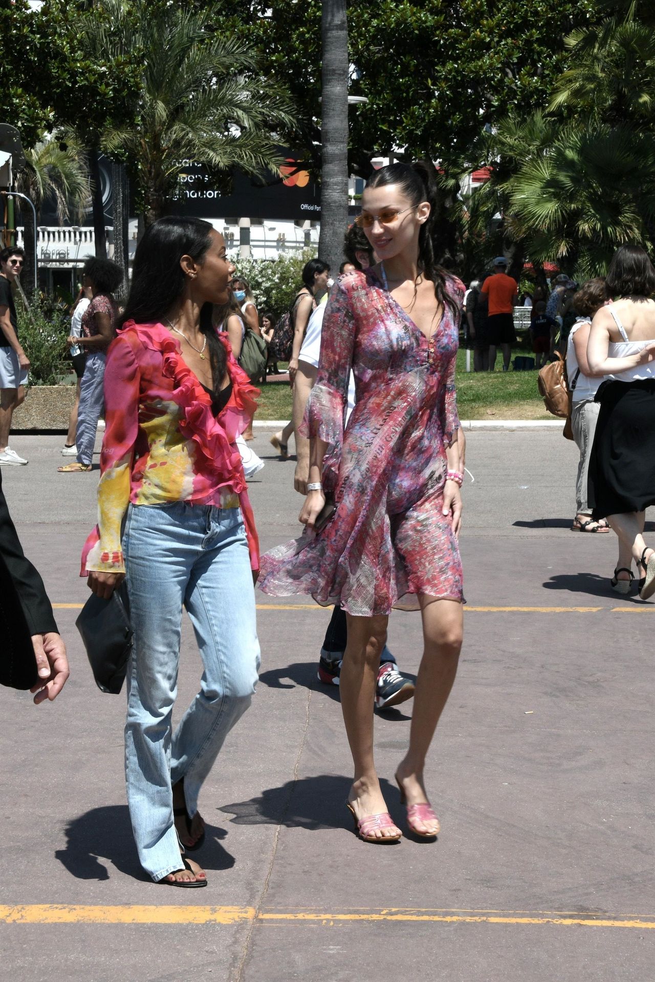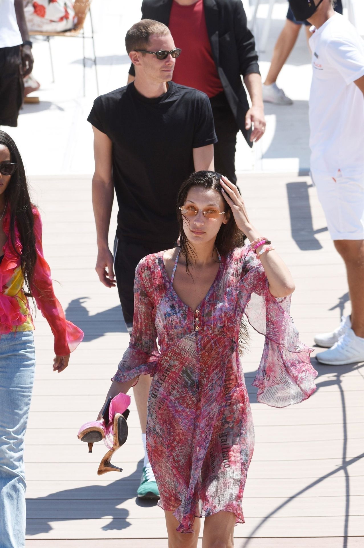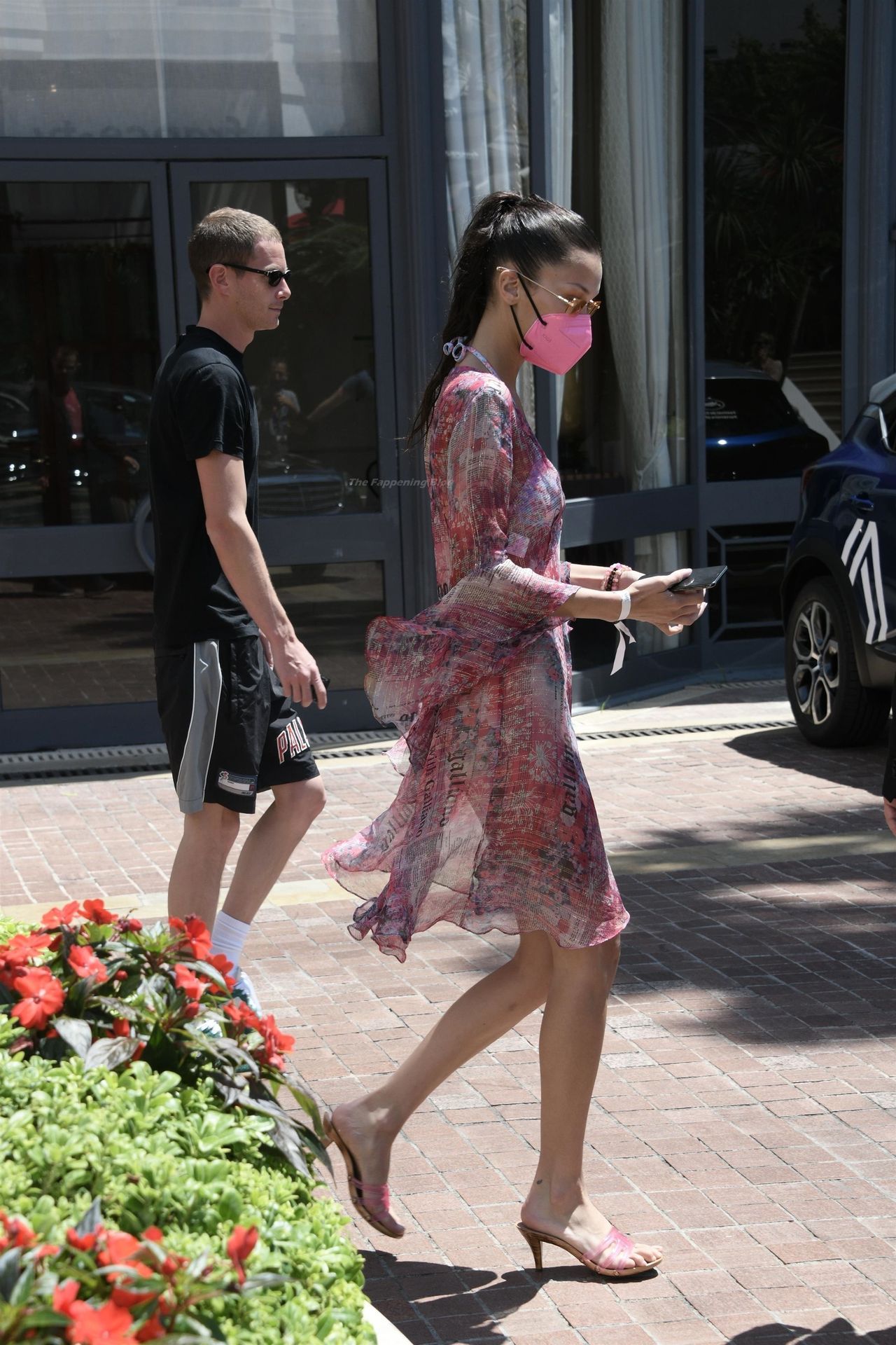La modelo Bella Hadid es vista durante el 74º Festival de Cine de Cannes en Cannes, 11/07/2021. La modelo muestra un estilo típicamente elegante con un vestido transparente y tacones kitten rosas mientras sale a almorzar.