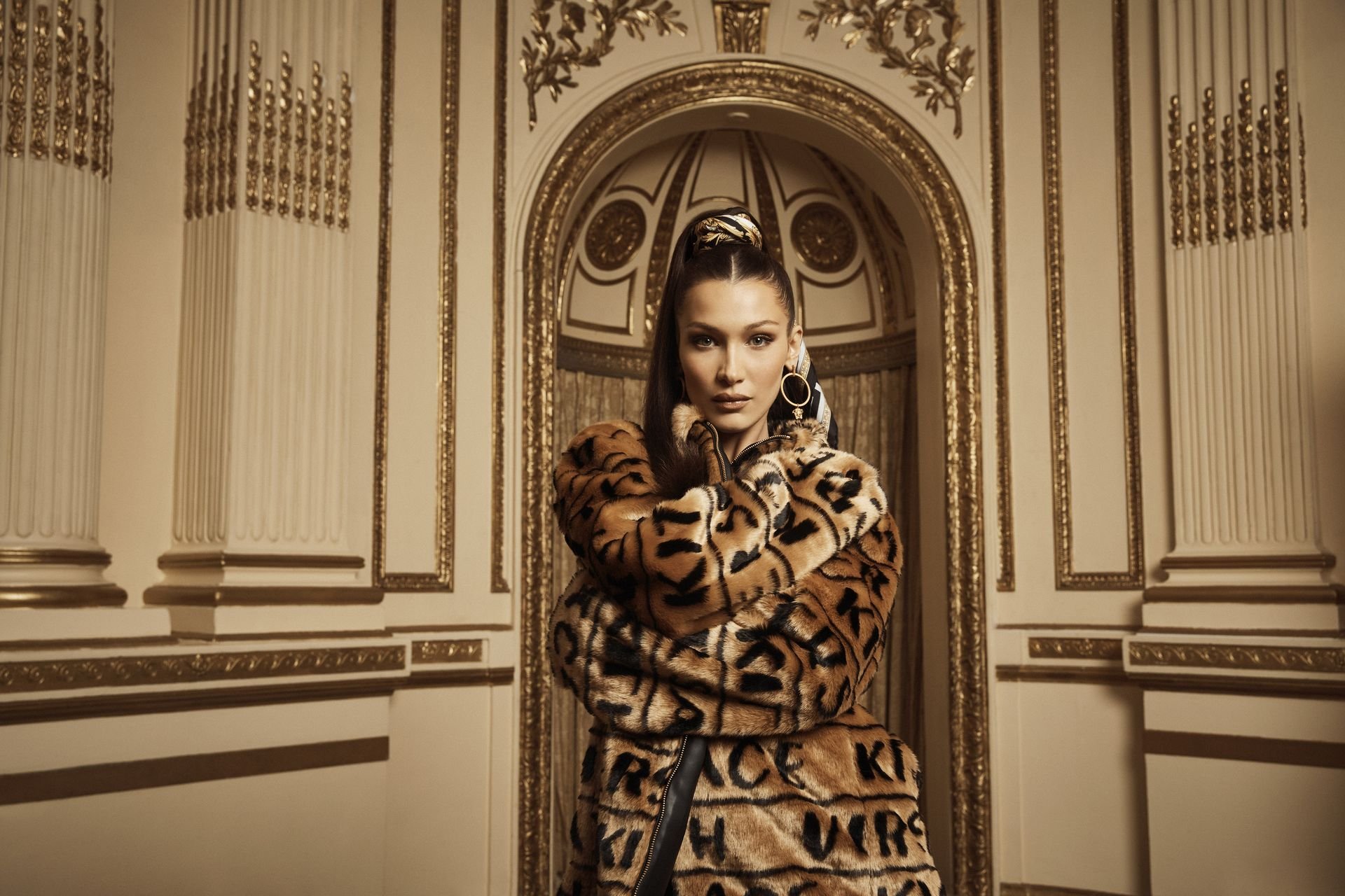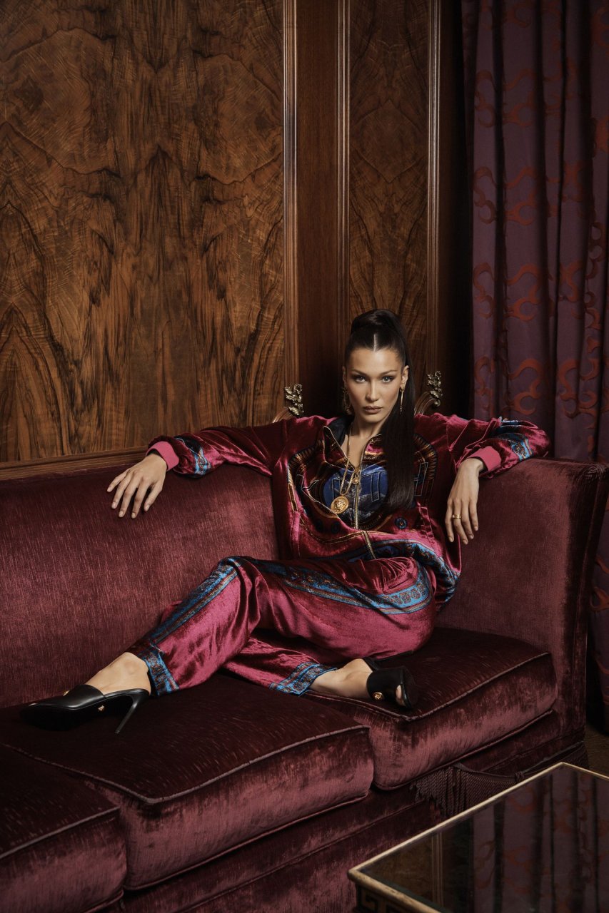 En las fotos reveladoras, se puede ver a Bella posando con shorts de ciclista, blusas, bikinis, chándales, abrigos acolchados e incluso un babushka aprobado por A$AP Rocky, todo cubierto con la característica estampa negra y dorada de la casa de moda italiana.