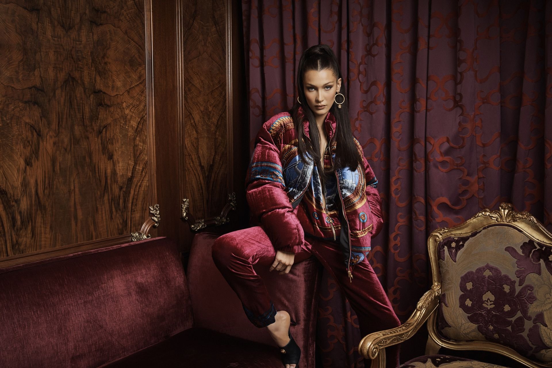 Mientras que en otra imagen se la puede ver luciendo sus interminables piernas con un ajustado traje de baño de una pieza negro. Durante la campaña, también viste un chándal de terciopelo burdeos adornado con un estampado barroco azul y dorado, que combina con mules de tacón alto.