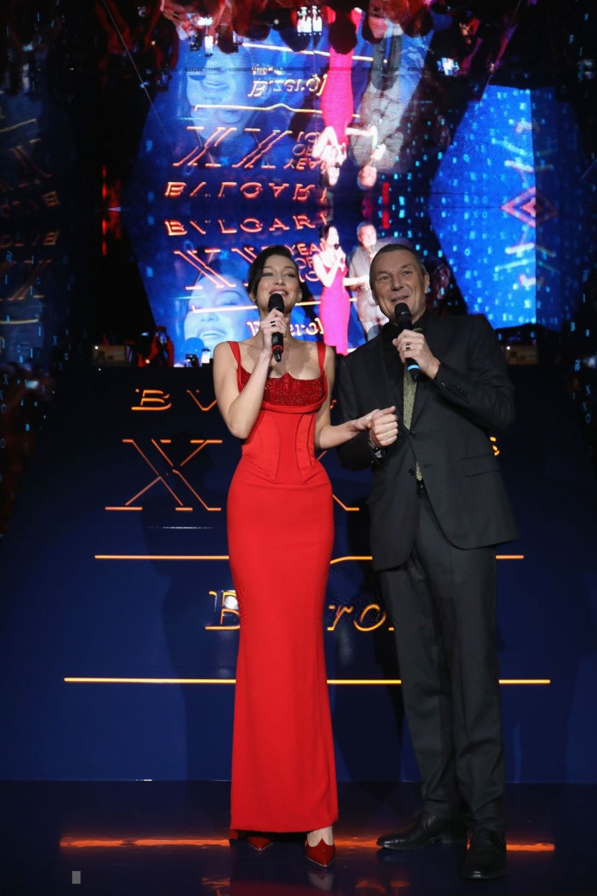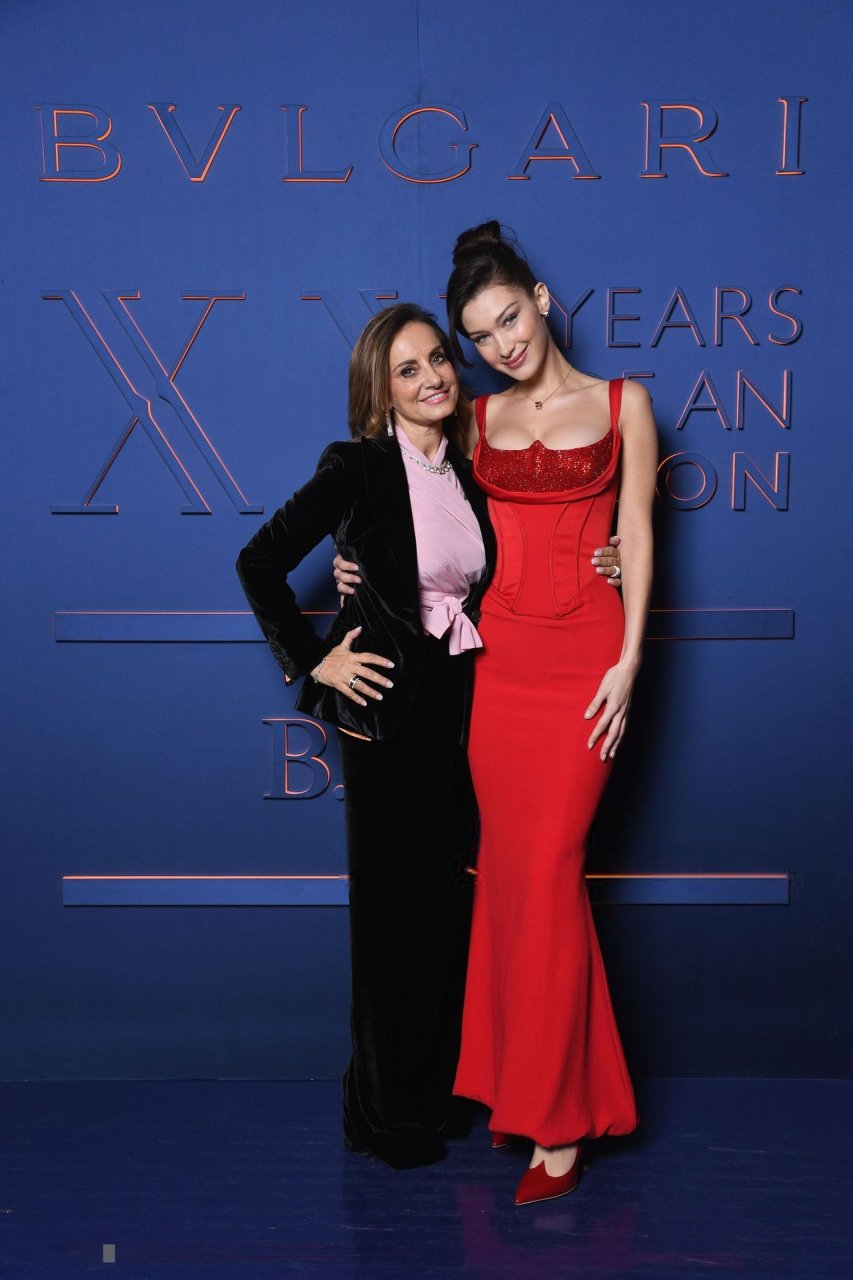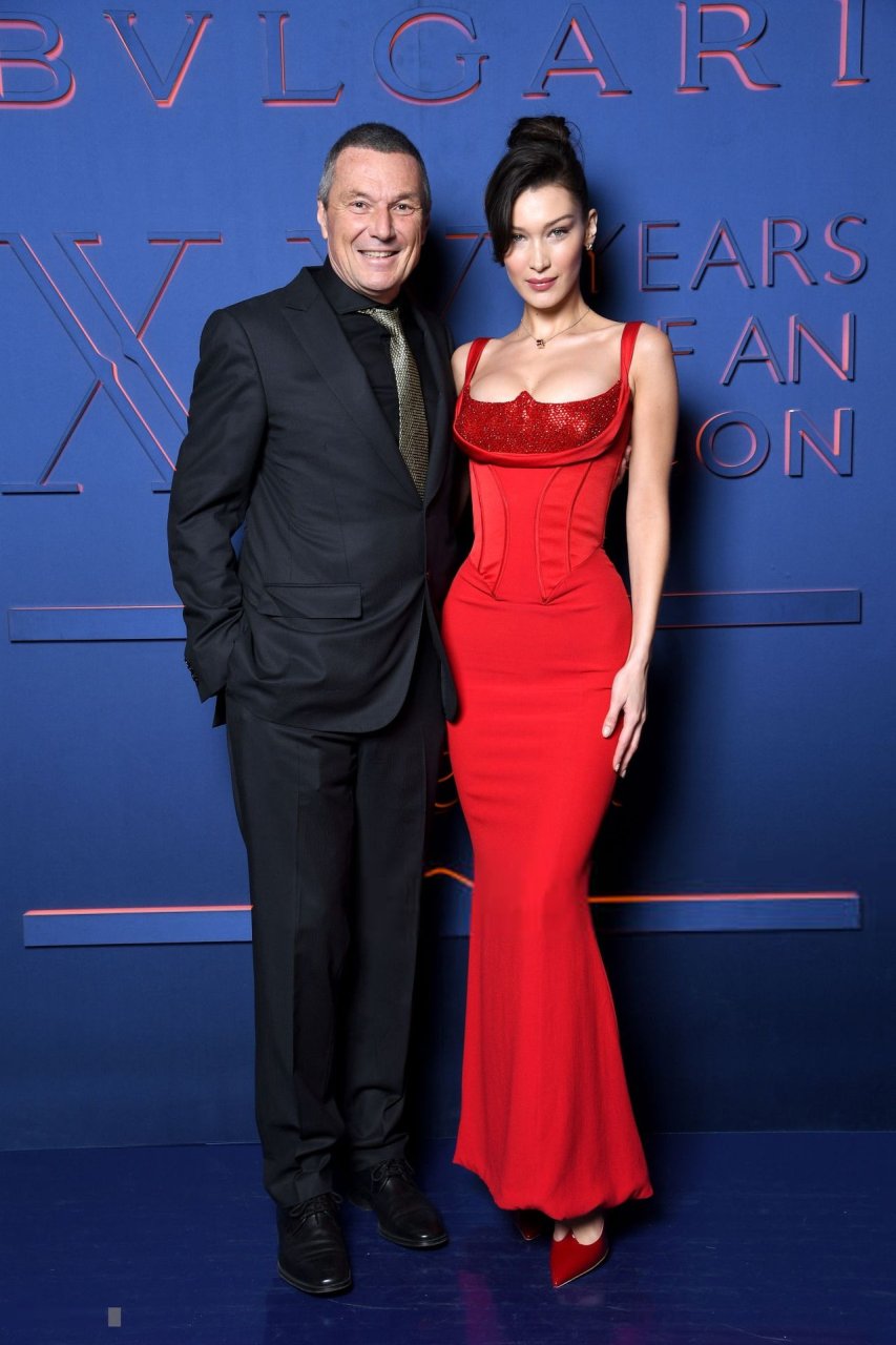 La noche de la marca Bvlgari se celebró en Roma, 19/02/2019. Celebridades y amigos de la marca asistieron al evento. Todos los invitados eligieron imágenes espectaculares para la noche. La modelo Bella Hadid (22) apareció con un vestido rojo de Versace con un escote profundo y corsé, que resaltaba su cintura delgada.