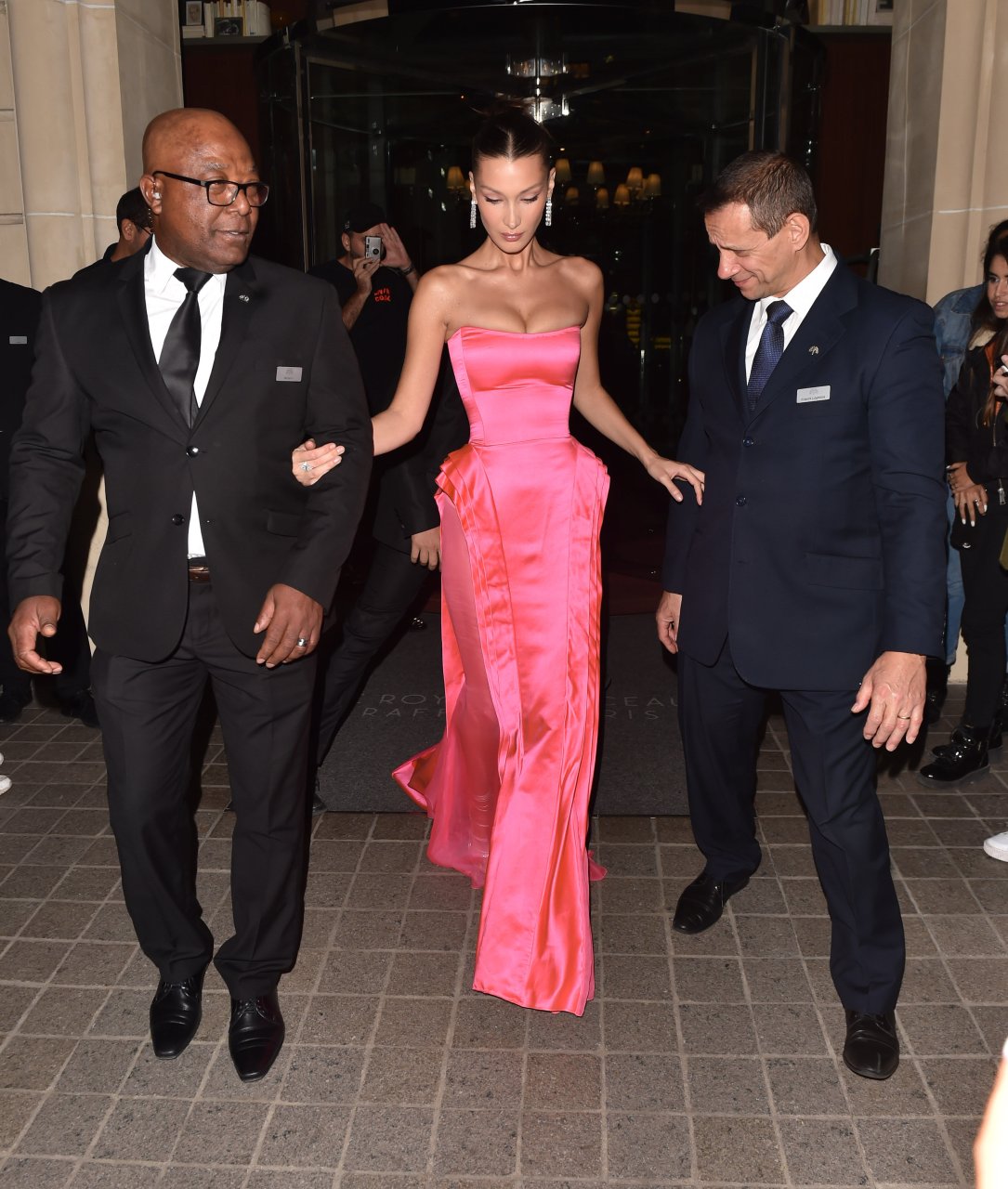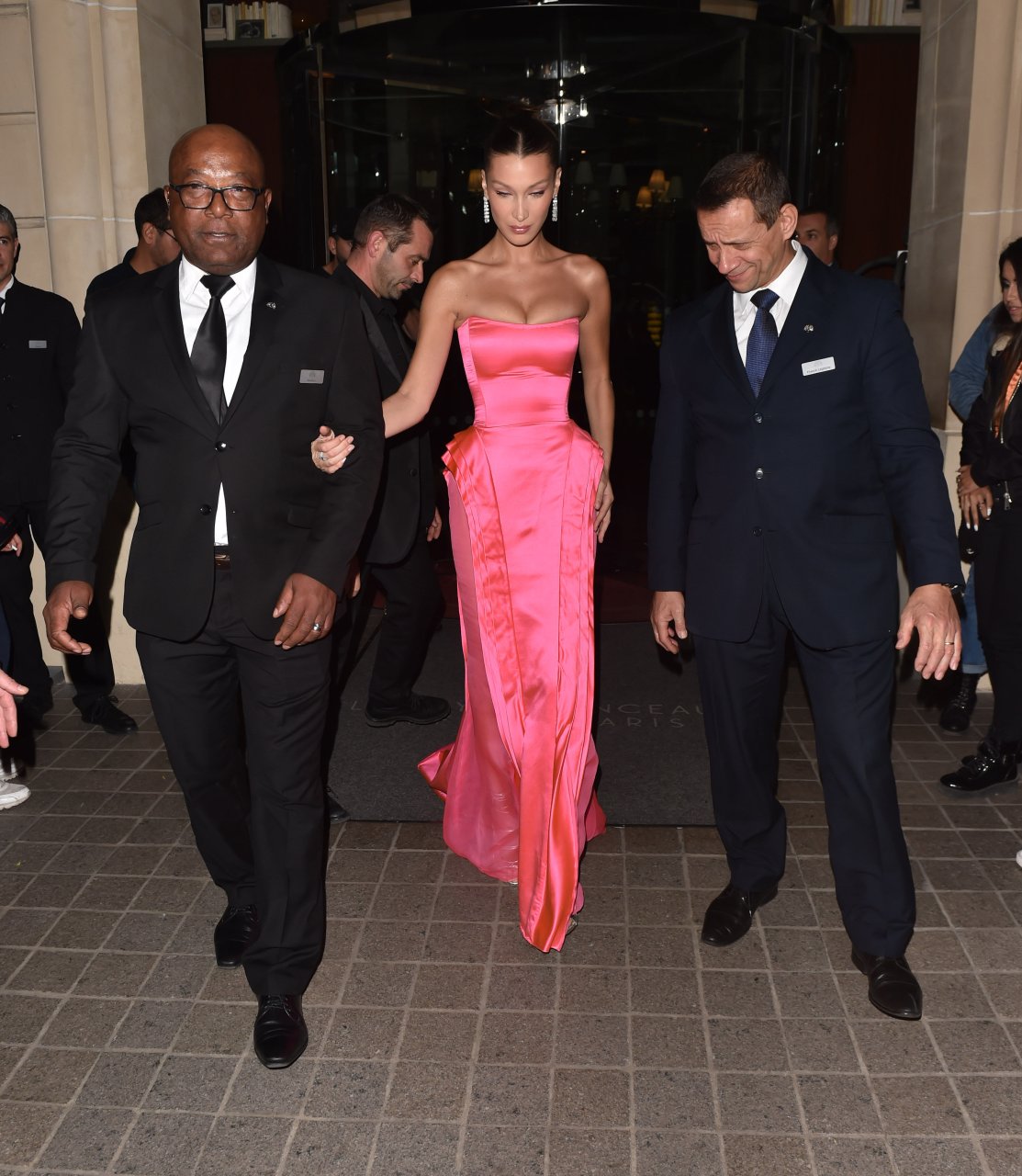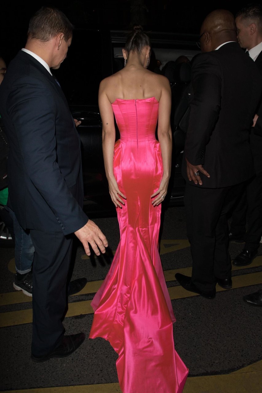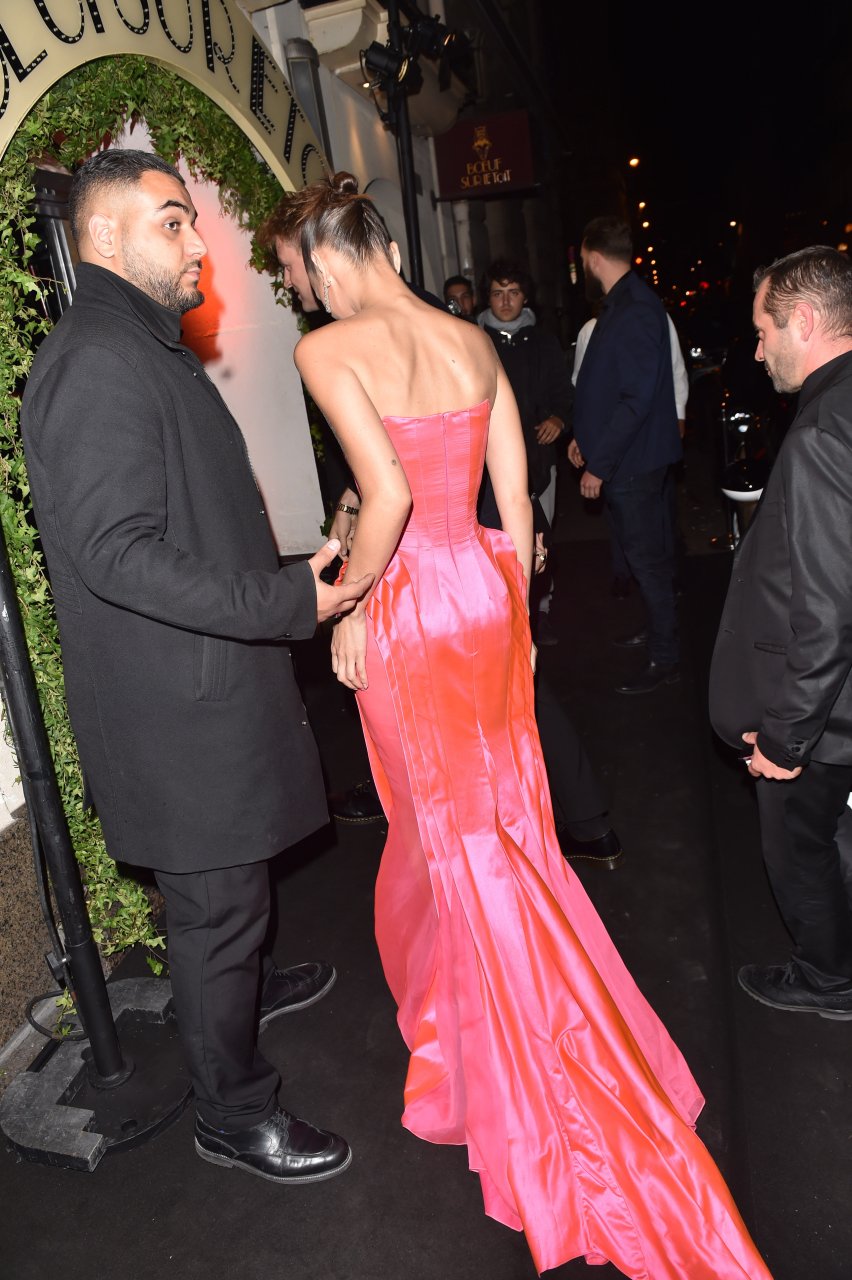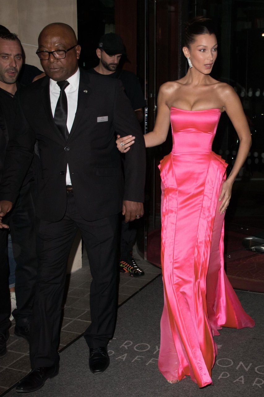 Model Bella Hadid (21) sale del hotel George V y se dirige al restaurante Le Boeuf sur le Toit para asistir al evento Golf for Good en París, 27/09/2018. Bella lucía impresionante con un vestido de noche rosa al salir del hotel.