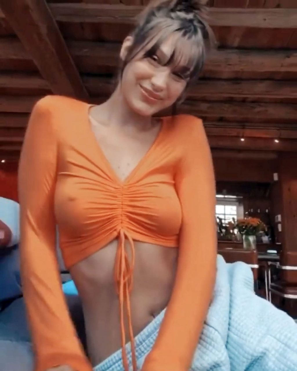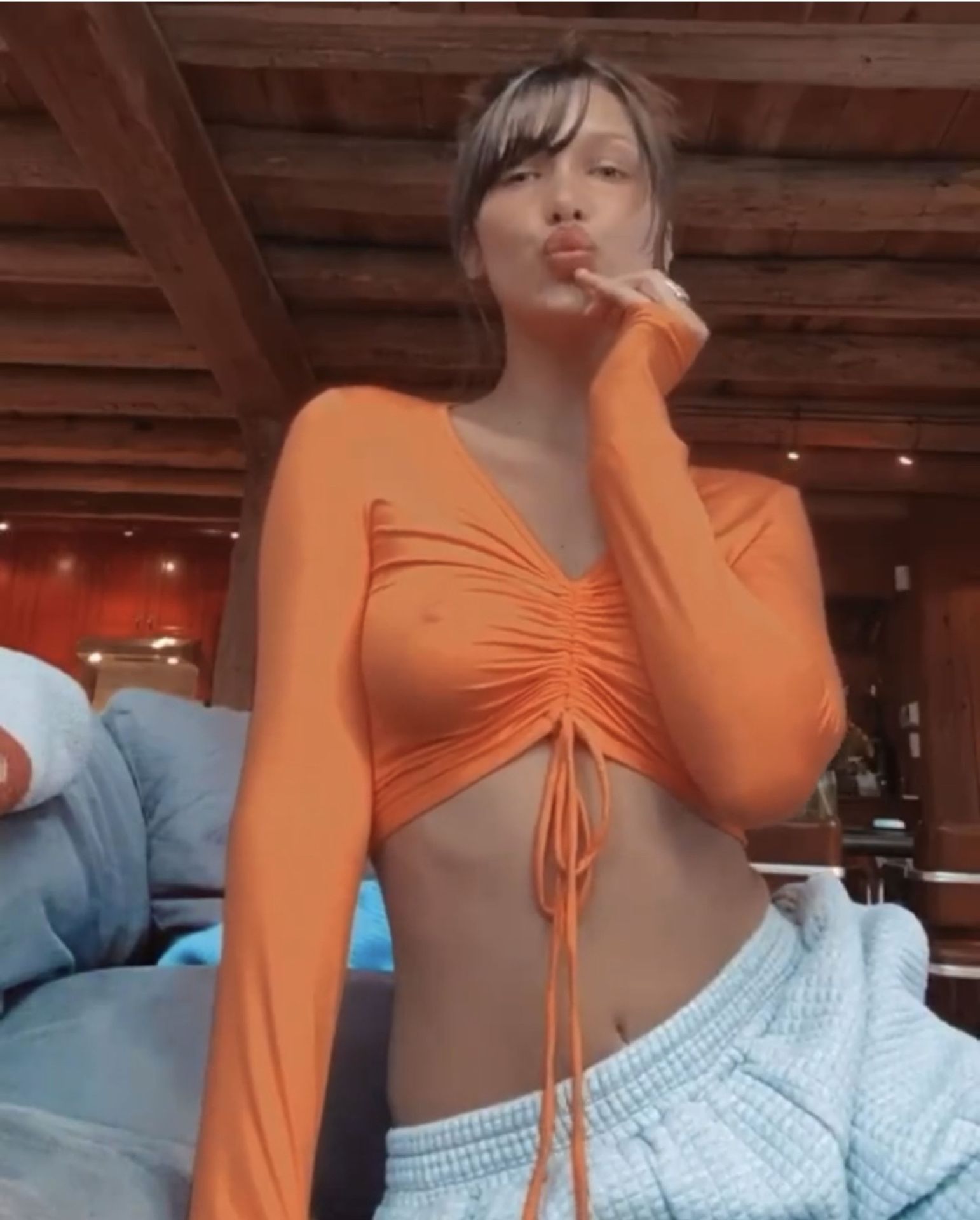 Model Bella Hadid compartió un nuevo video sexy mostrando sus pechos sin sostén con un top naranja en Instagram, 28/04/2020.