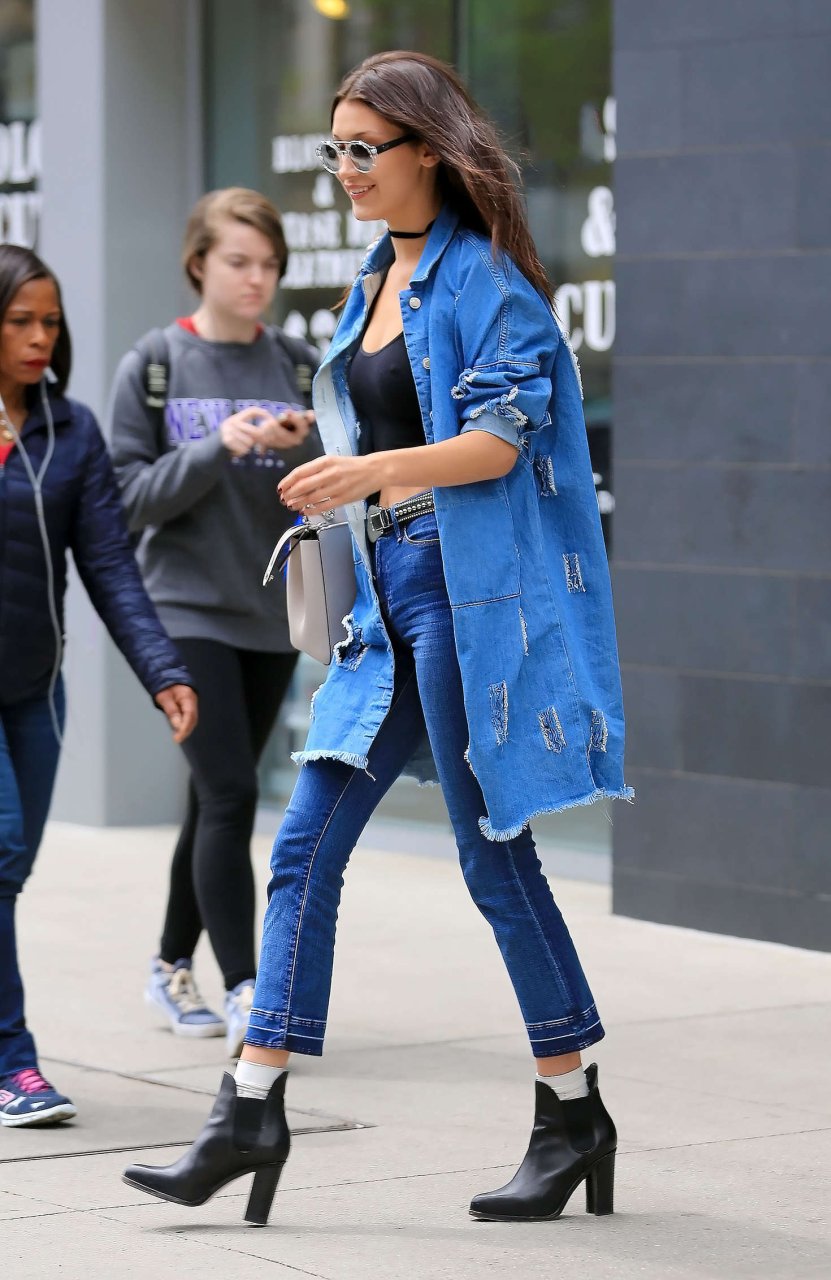 Bella Hadid vistiendo un top negro y chaqueta de mezclilla en la ciudad de Nueva York, 28/04/2016. ¡Oh, pokie! Bella Hadid es una modelo estadounidense. Edad: 19 (9 de octubre de 1996)