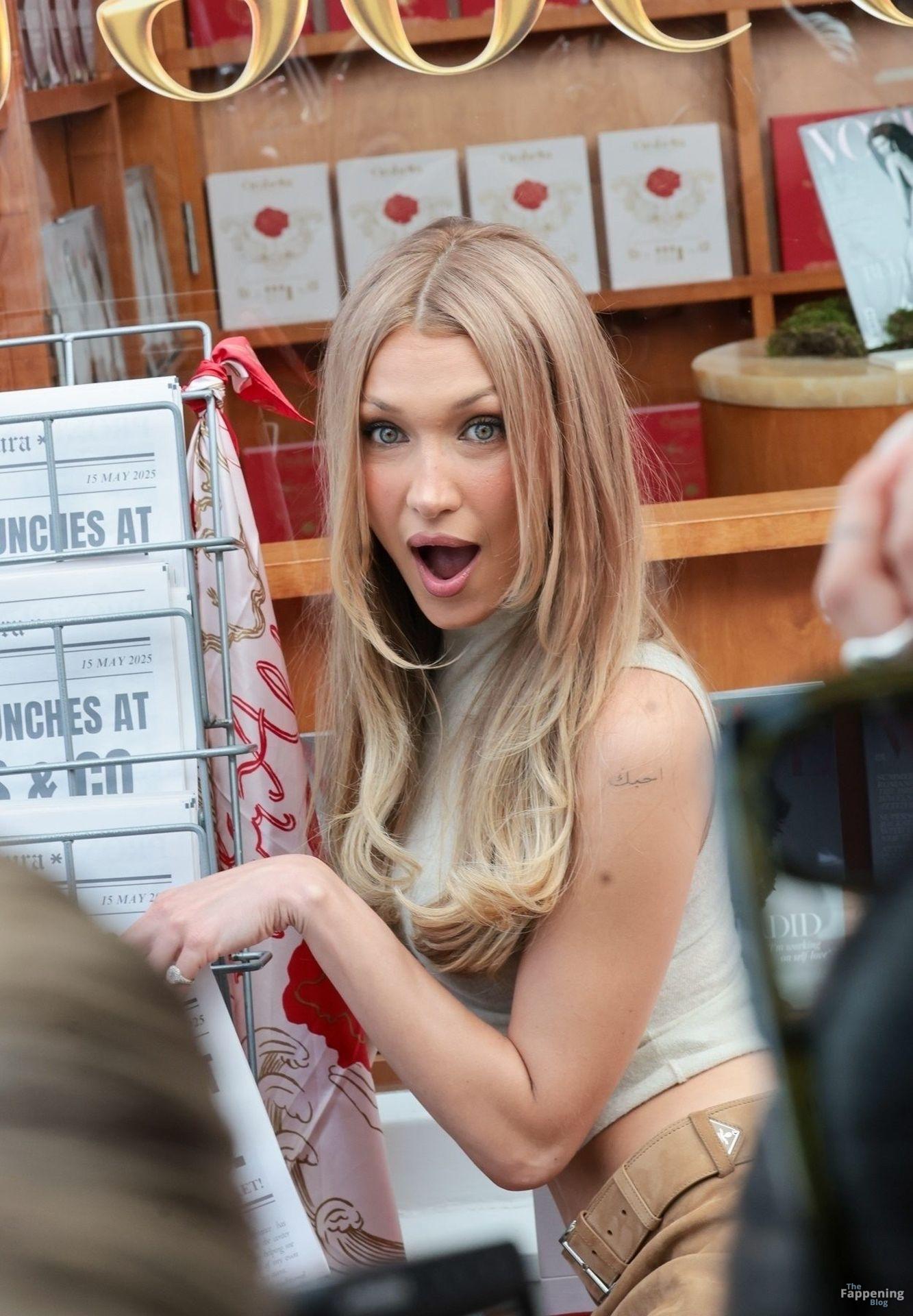 Bella Hadid estuvo en el pop-up de Orabella London, luciendo un top ajustado y una minifalda de ante, mostrando sus largas piernas.