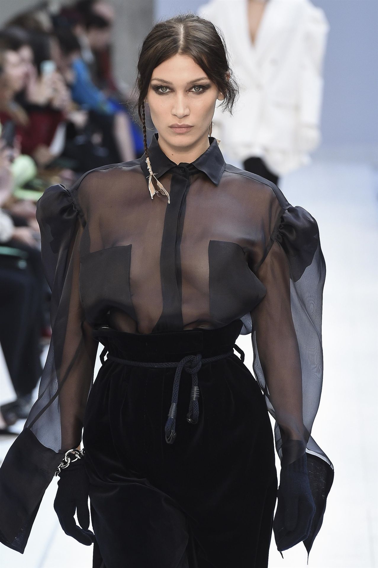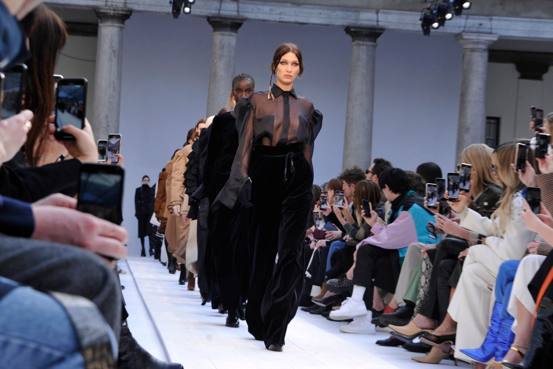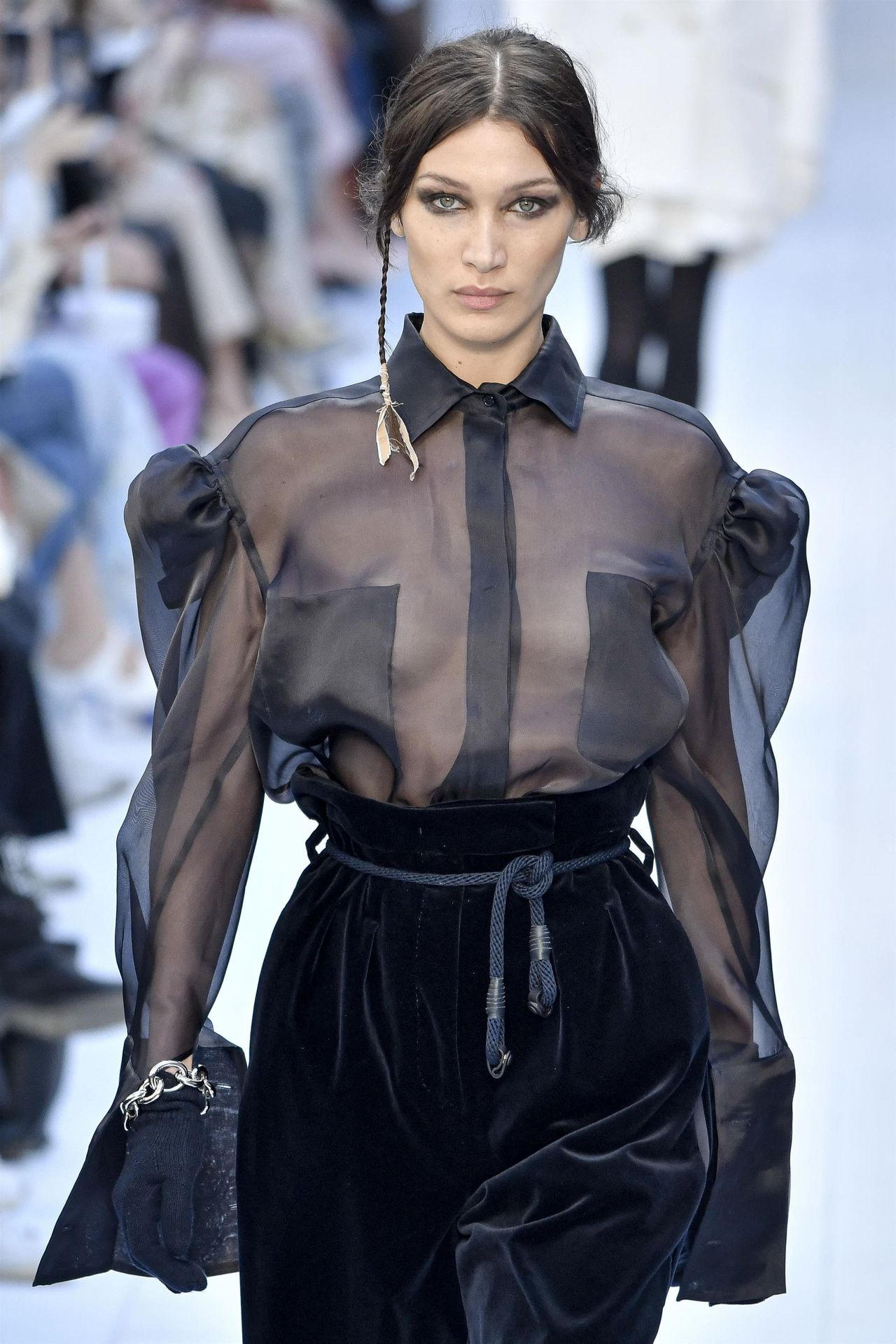 La modelo Bella Hadid desfila sin sostén durante el desfile de moda de Max Mara como parte de la Semana de la Moda de Milán Otoño/Invierno en Milán, Italia, 20/02/2020.