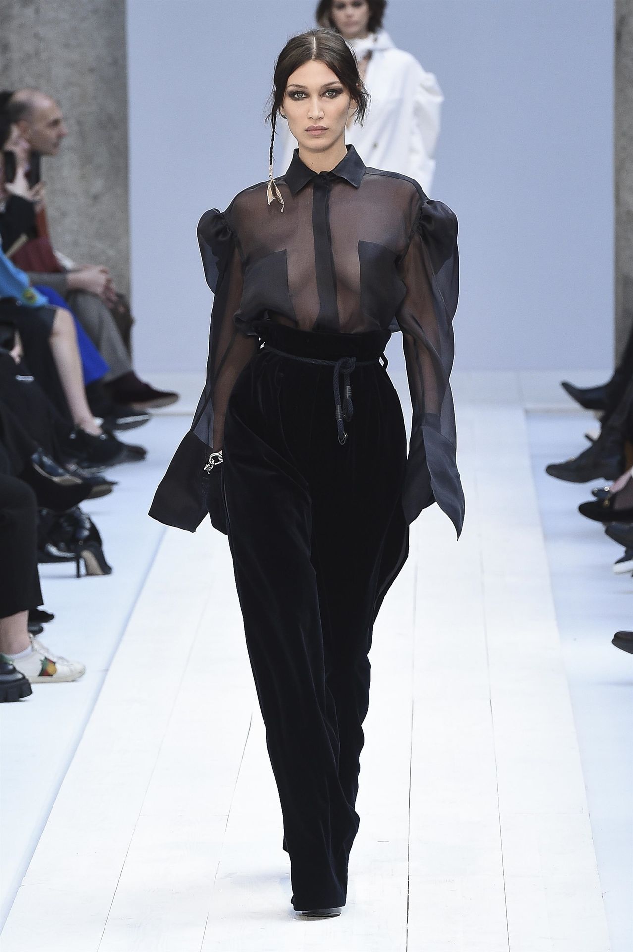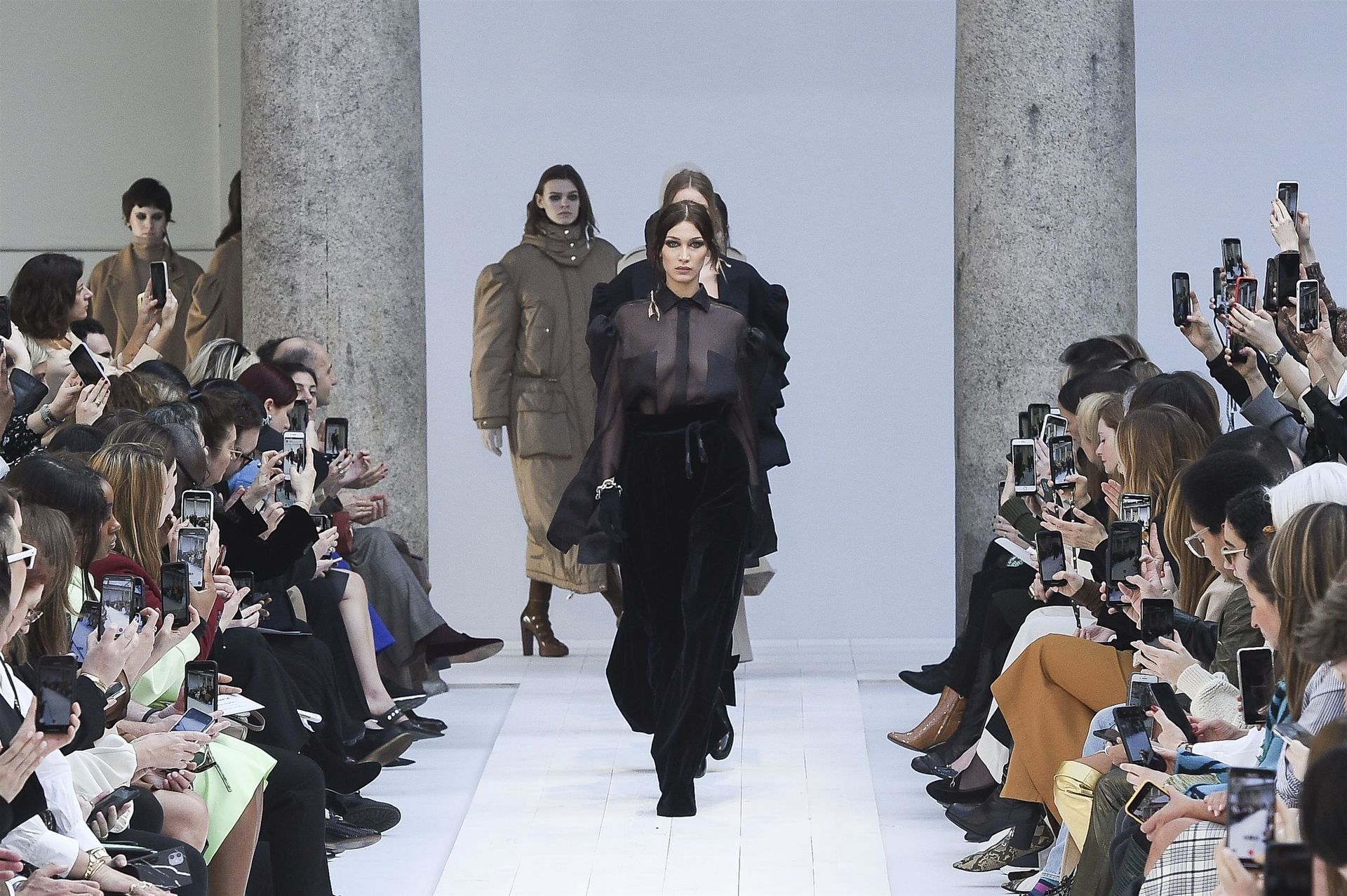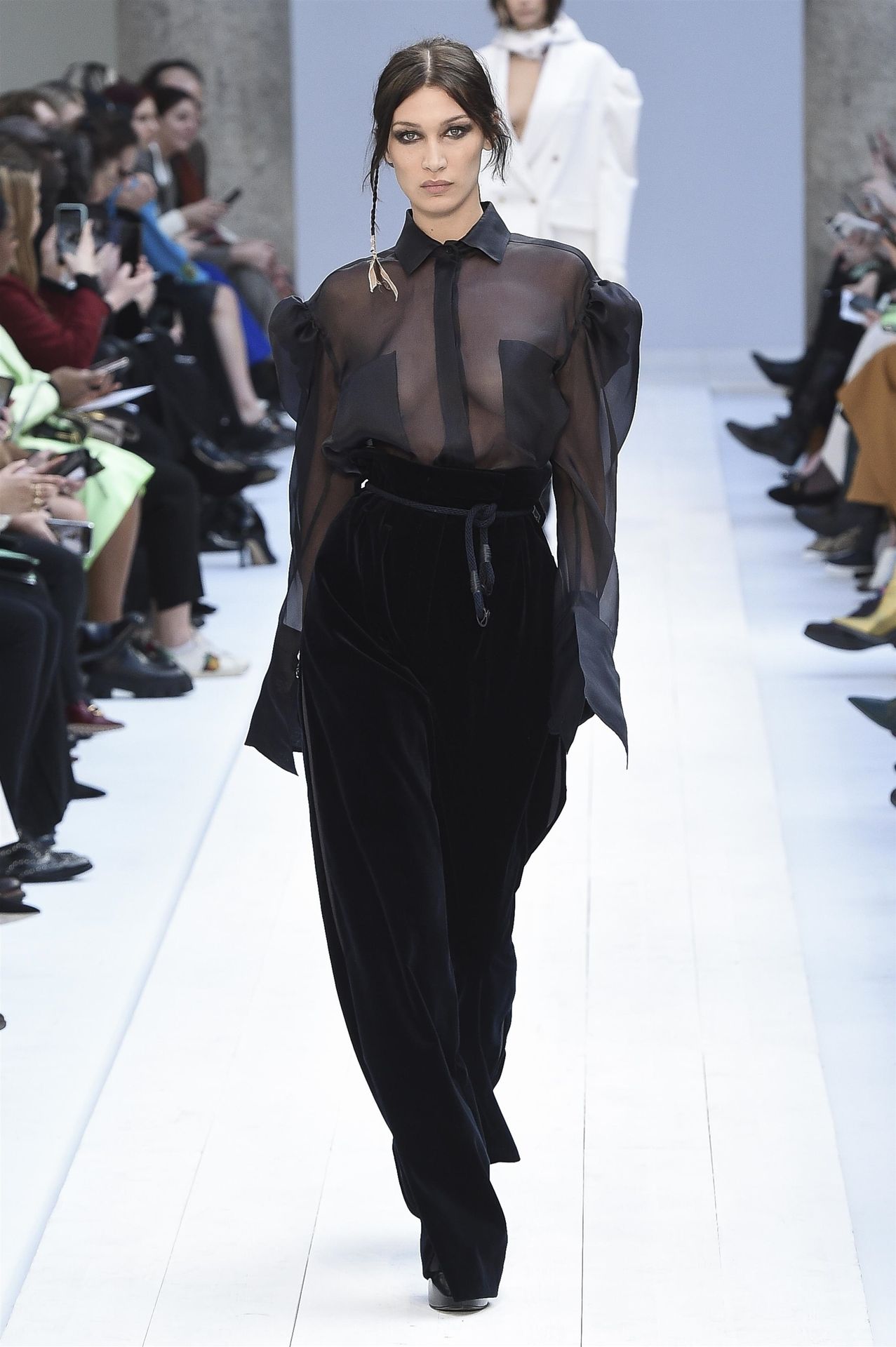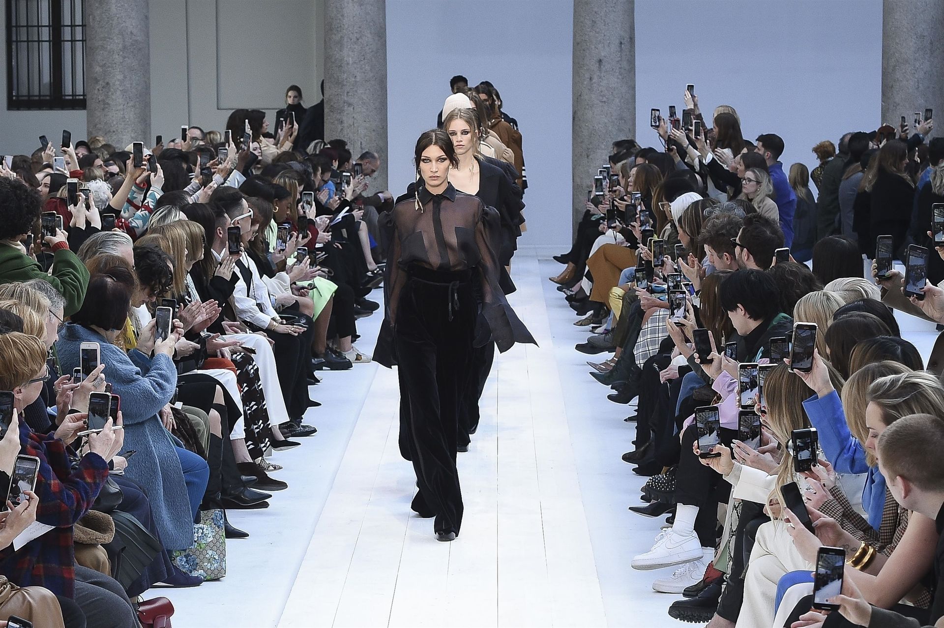 La modelo Bella Hadid desfila sin sostén durante el desfile de moda de Max Mara como parte de la Semana de la Moda de Milán Otoño/Invierno en Milán, Italia, 20/02/2020.