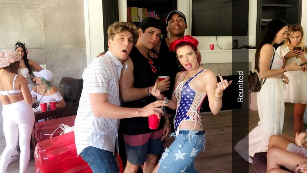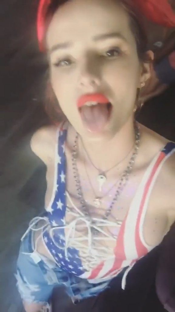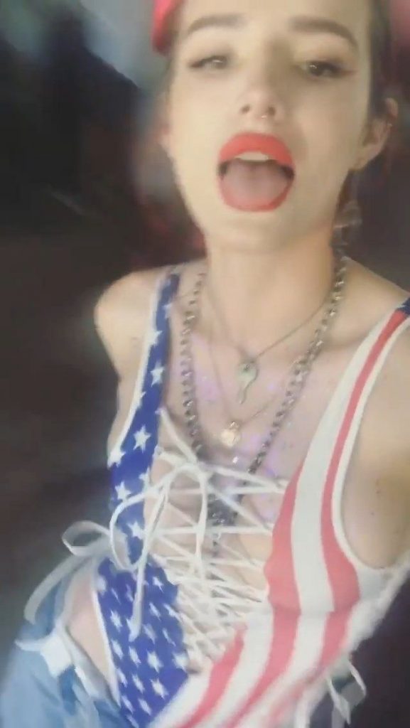 Bella Thorne lleva un body patriótico sexy en la fiesta con amigos – Snapchat, 07/04/2017. Bella Thorne es modelo, actriz (Be Here Now) y cantante. Edad: 19 años.
