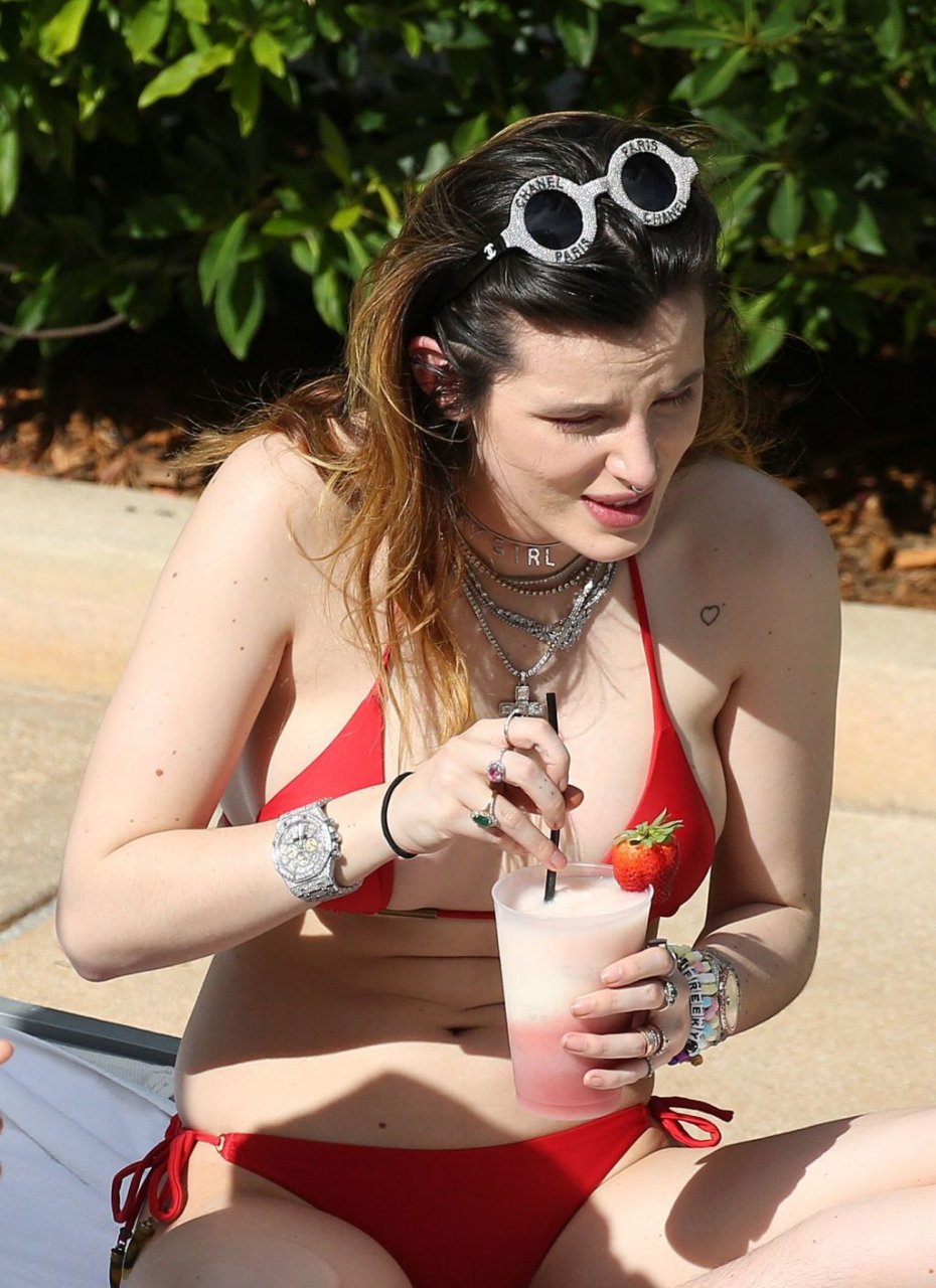 La actriz Bella Thorne lleva un bikini rojo y su hermana Dani le lava el cabello con cerveza junto a la piscina en Miami, 13/03/2019.