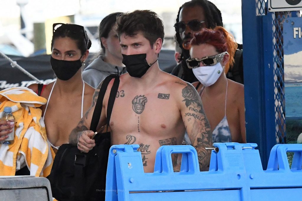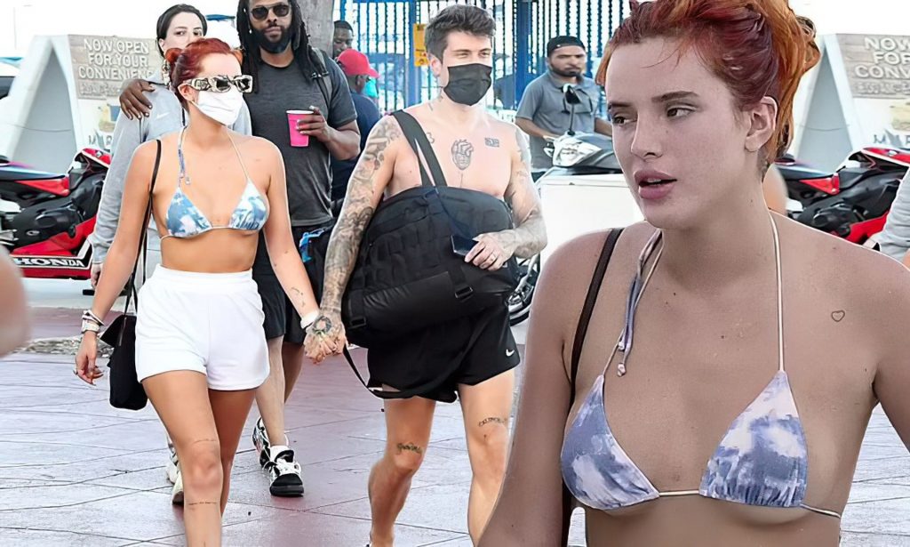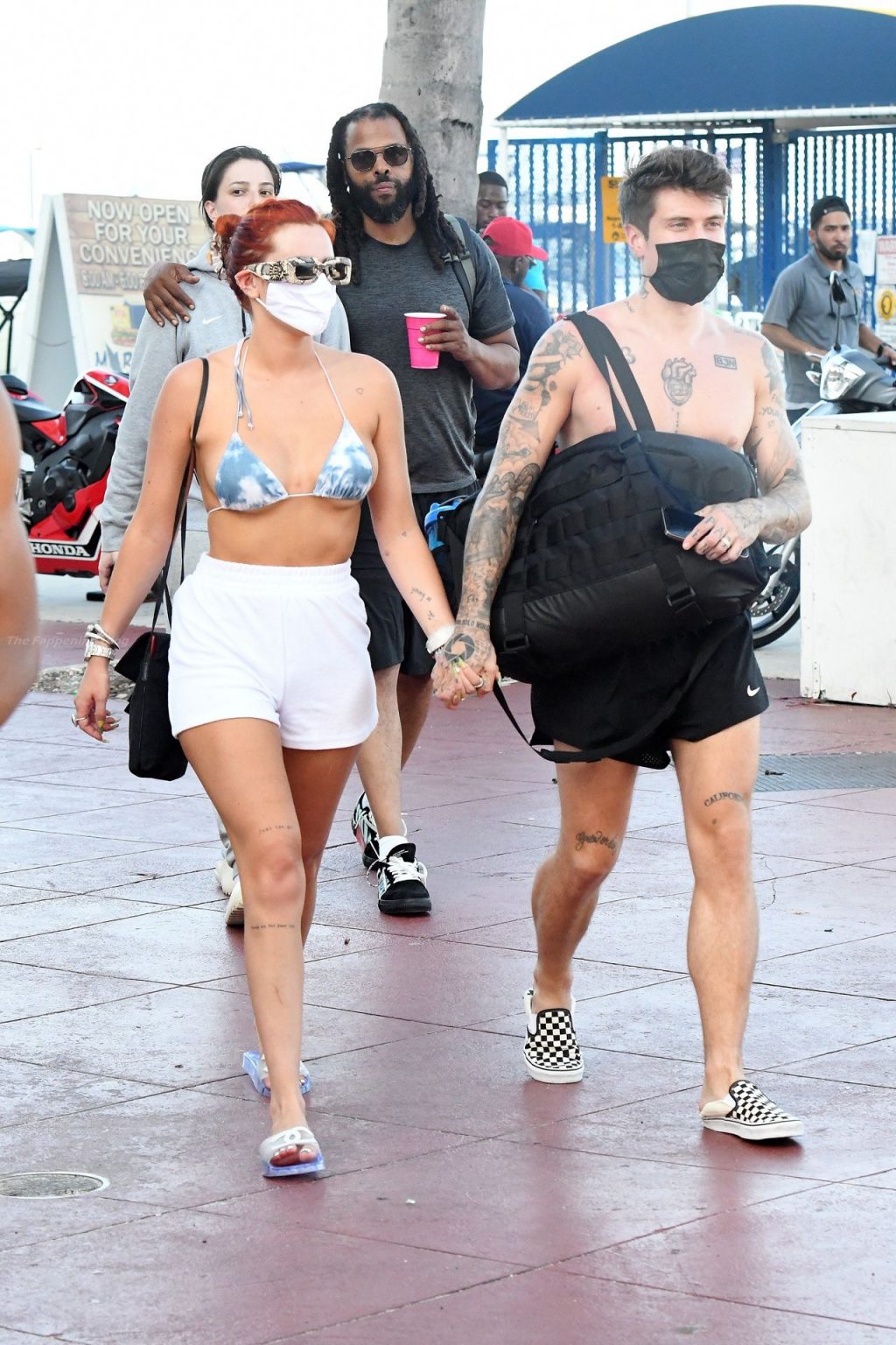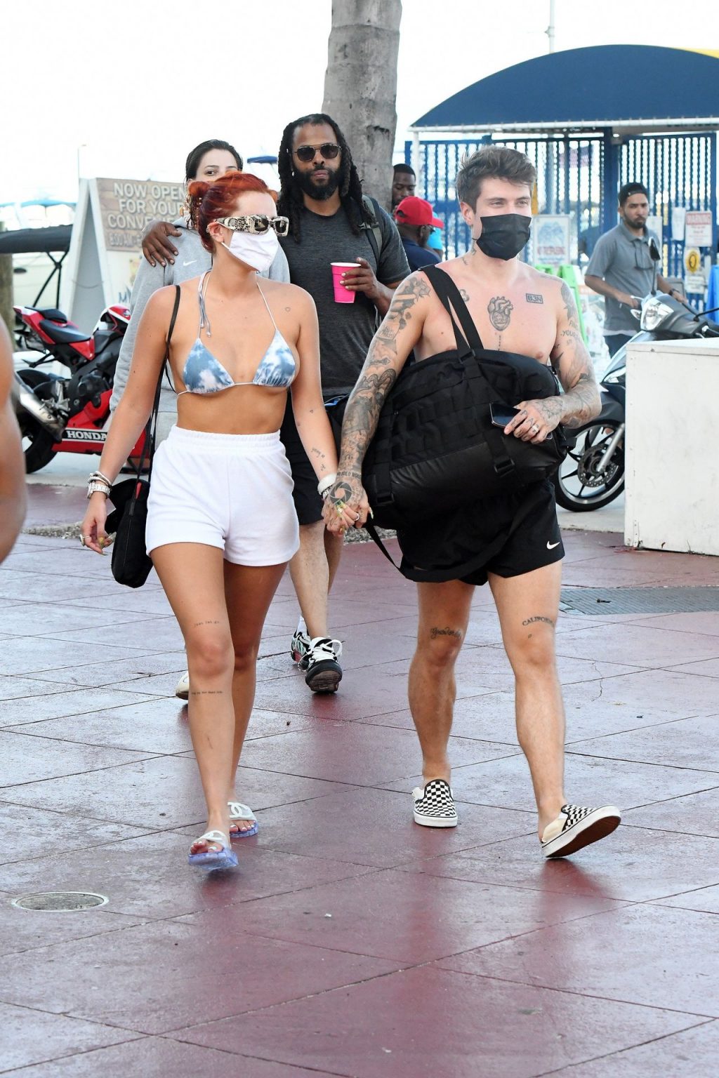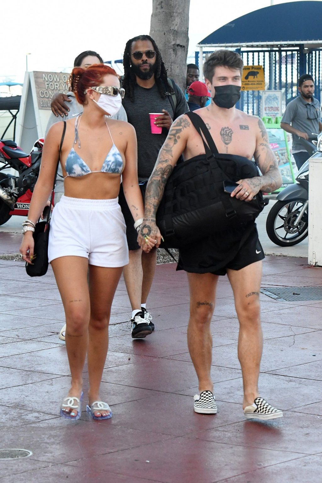 La estrella de The Fappening y actriz Bella Thorne lleva un bikini azul y blanco mientras se toma de la mano con su prometido Benjamin Mascolo al bajarse de un yate en Miami, 05/05/2021.