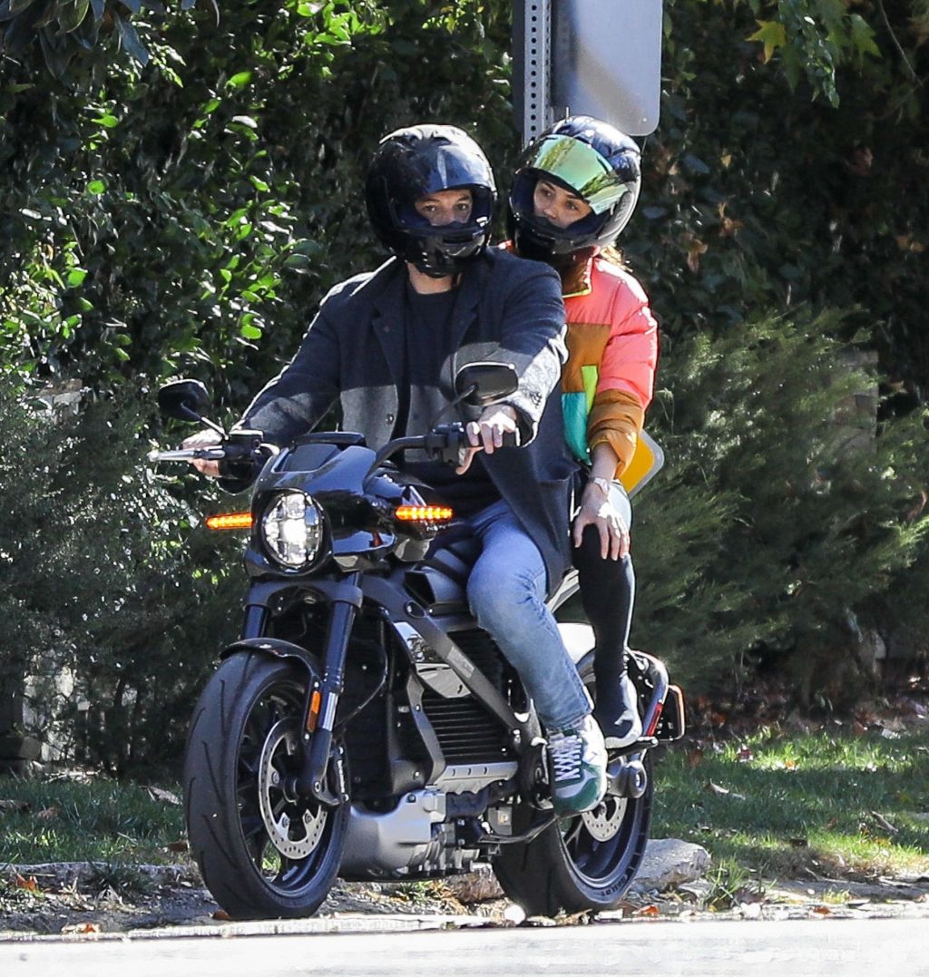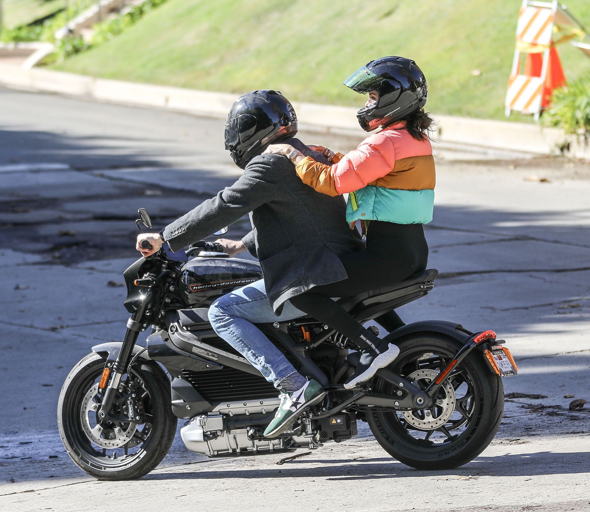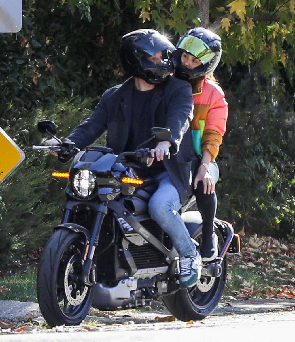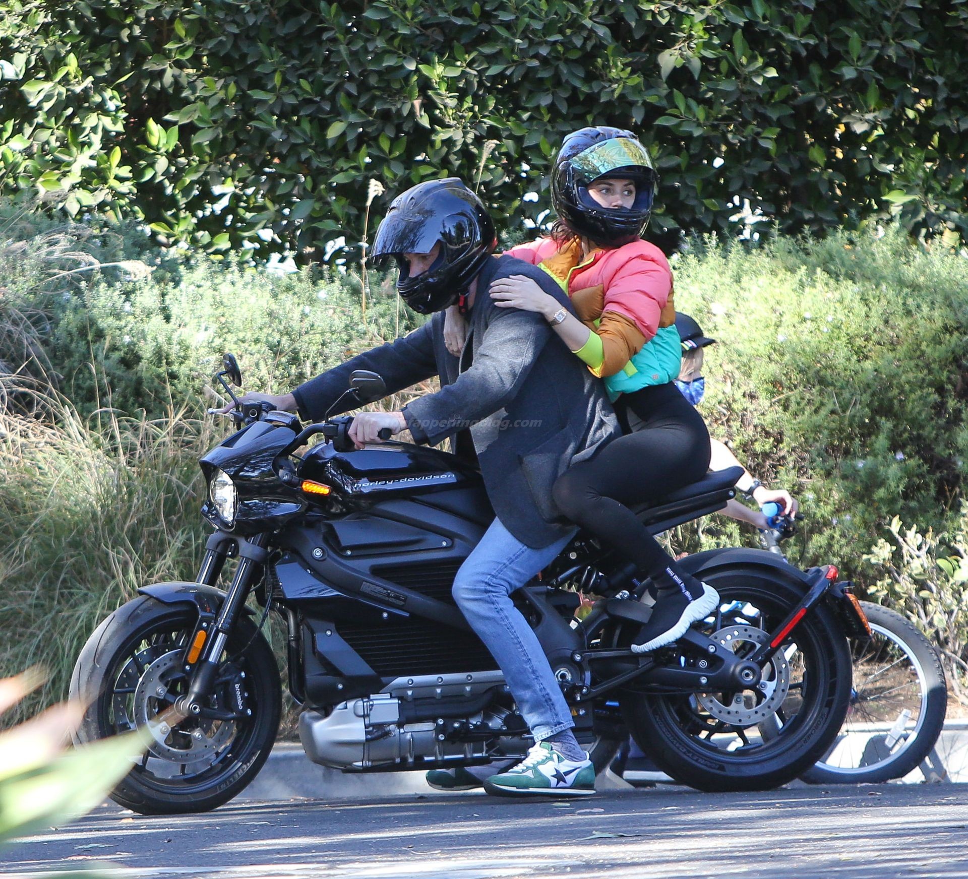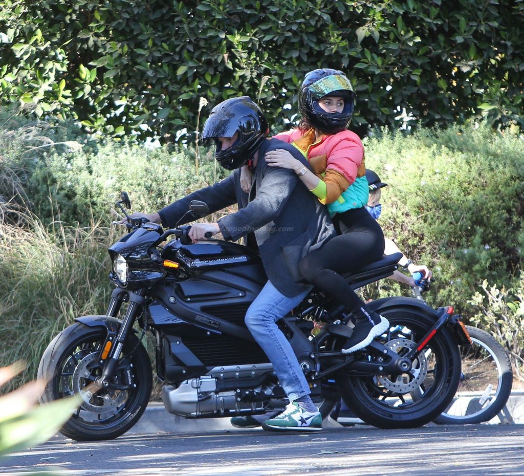 “Batman” estrella Ben Affleck es visto conduciendo una Harley Davidson LiveWire eléctrica con su novia, la actriz cubana Ana de Armas detrás de él y siguiendo a su hijo Samuel en una bicicleta en Brentwood, 27/11/2020.