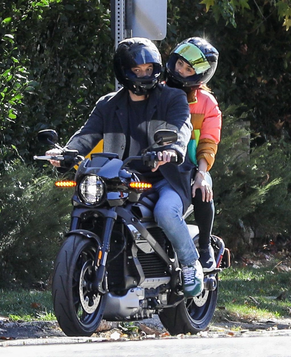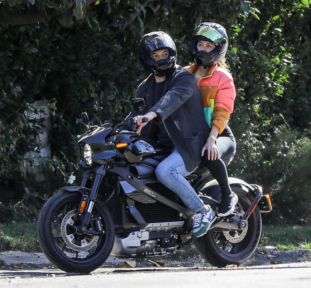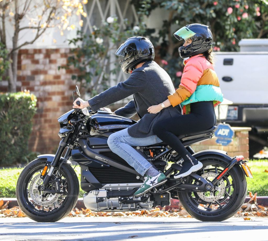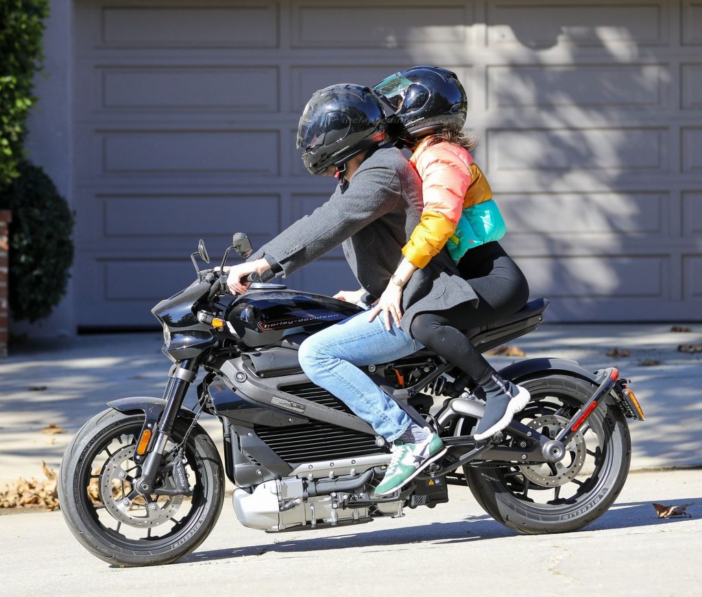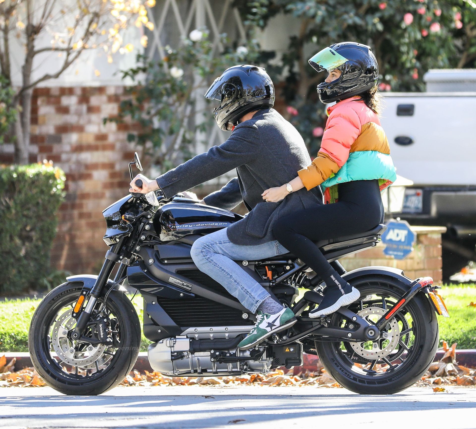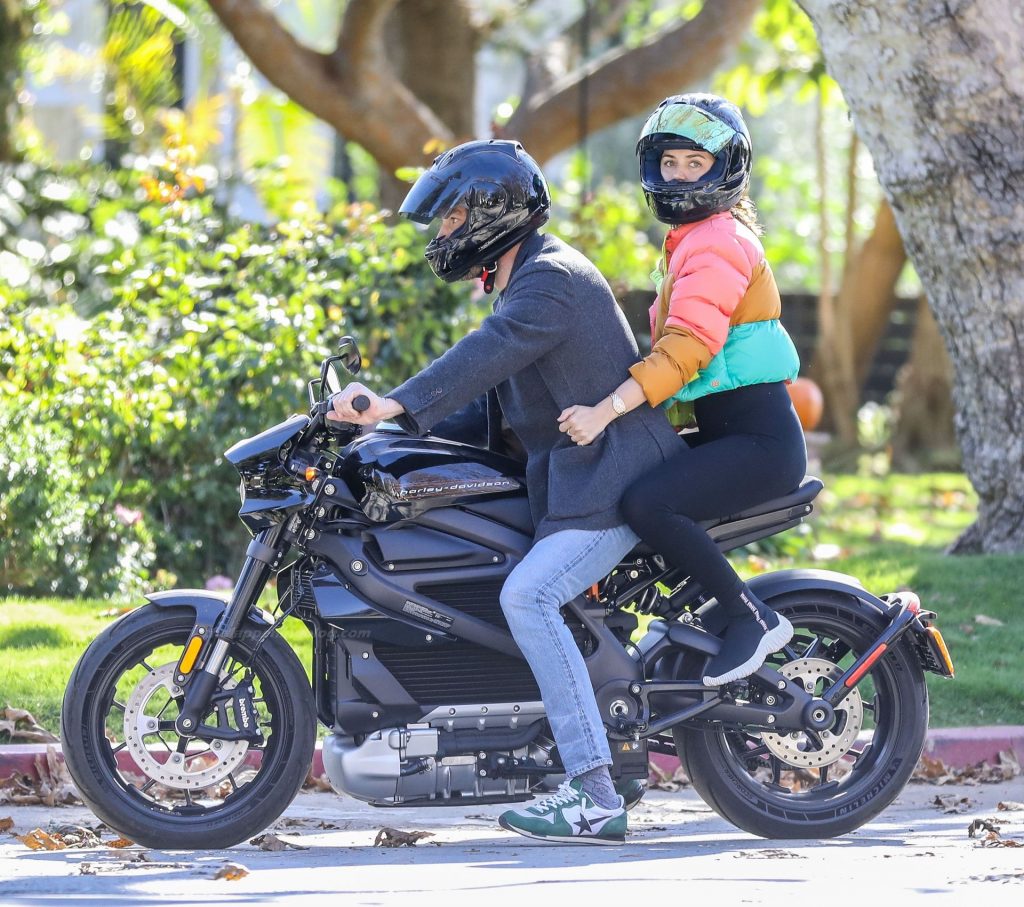 “Batman” estrella Ben Affleck es visto conduciendo una Harley Davidson LiveWire eléctrica con su novia, la actriz cubana Ana de Armas detrás de él y siguiendo a su hijo Samuel en una bicicleta en Brentwood, 27/11/2020.