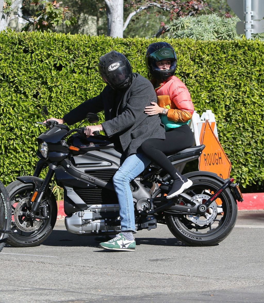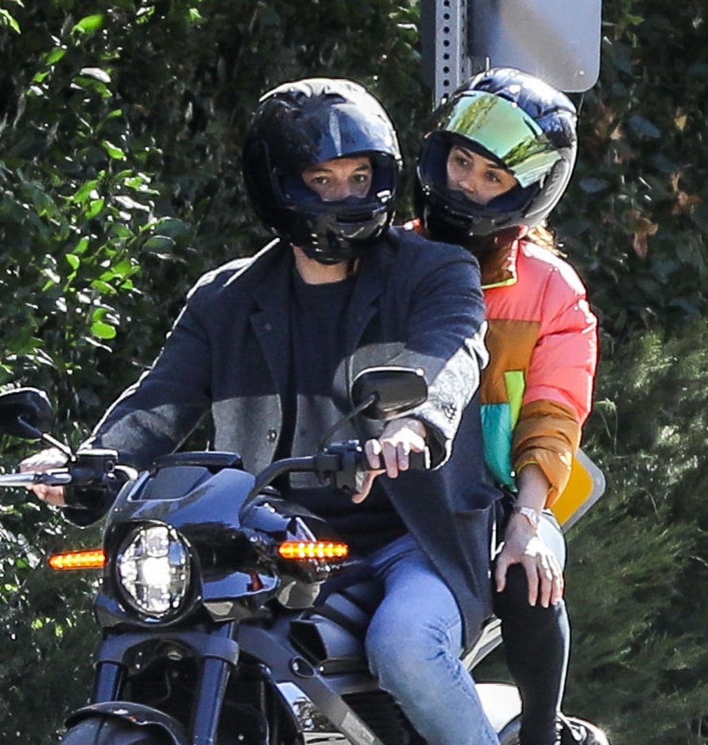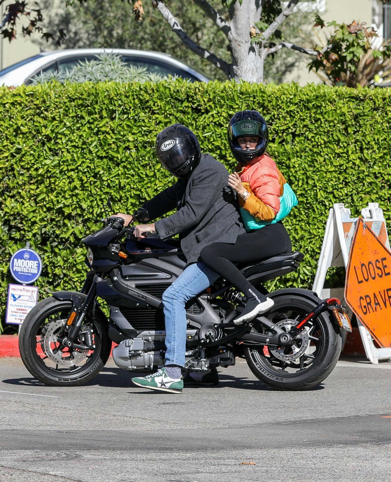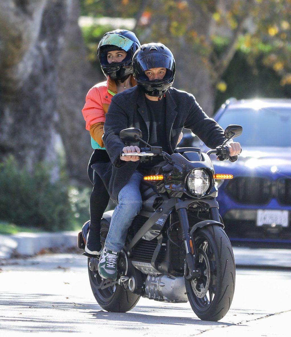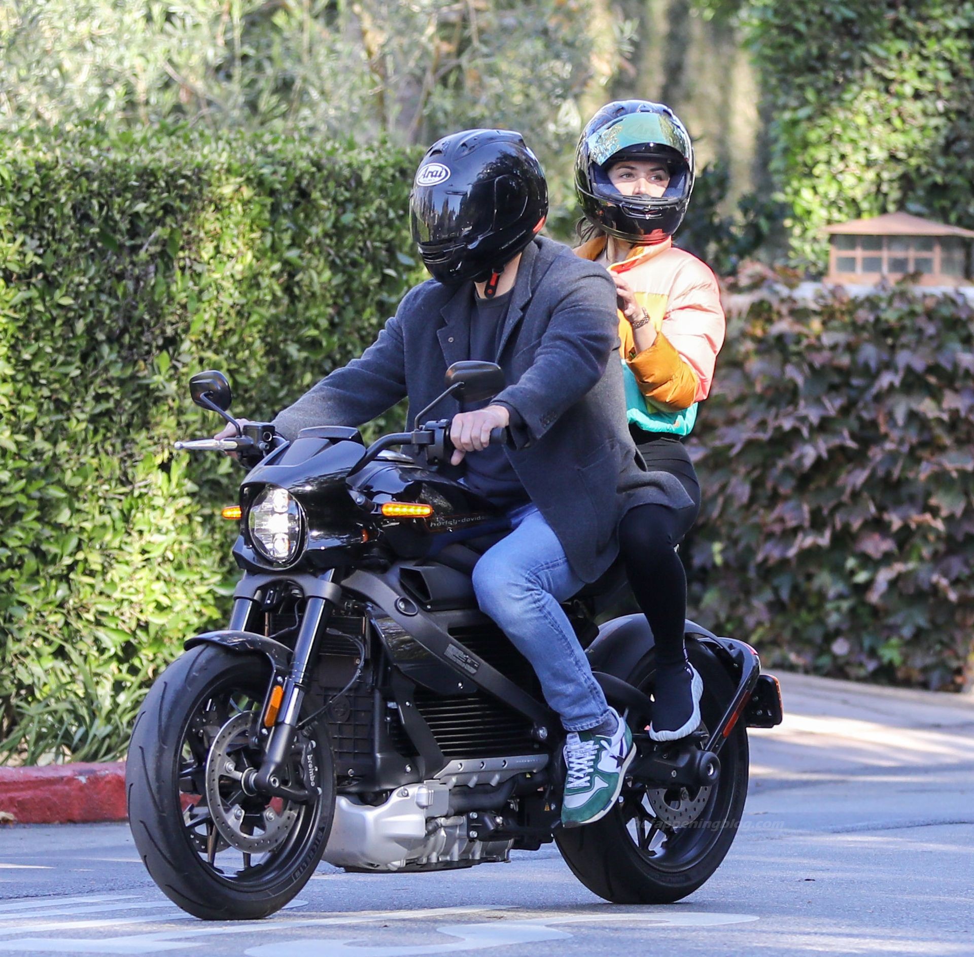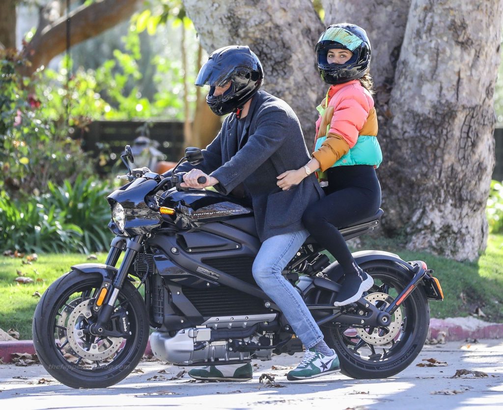 “Batman” estrella Ben Affleck es visto conduciendo una Harley Davidson LiveWire eléctrica con su novia, la actriz cubana Ana de Armas detrás de él y siguiendo a su hijo Samuel en una bicicleta en Brentwood, 27/11/2020.