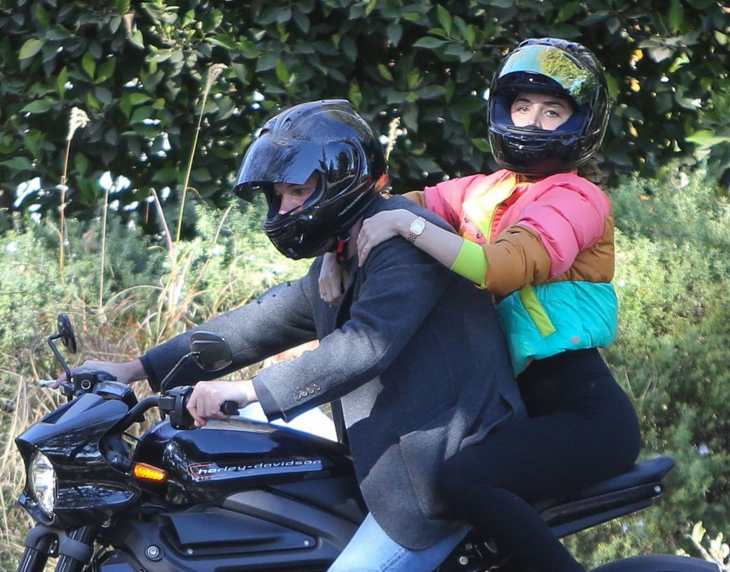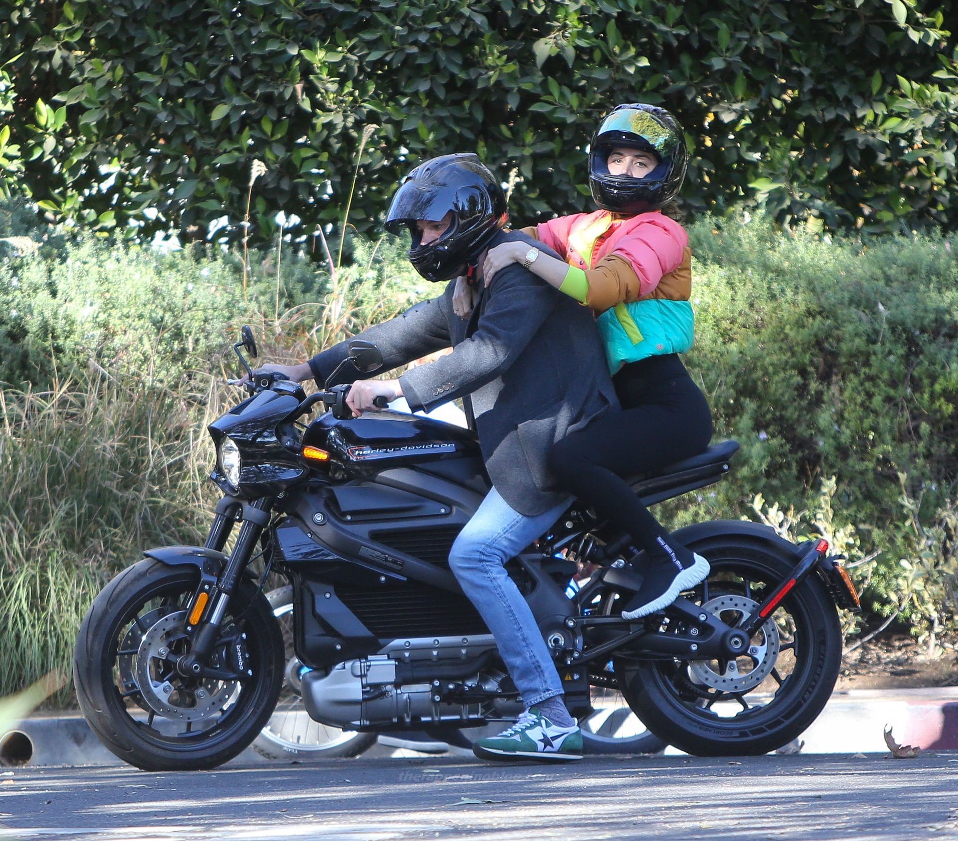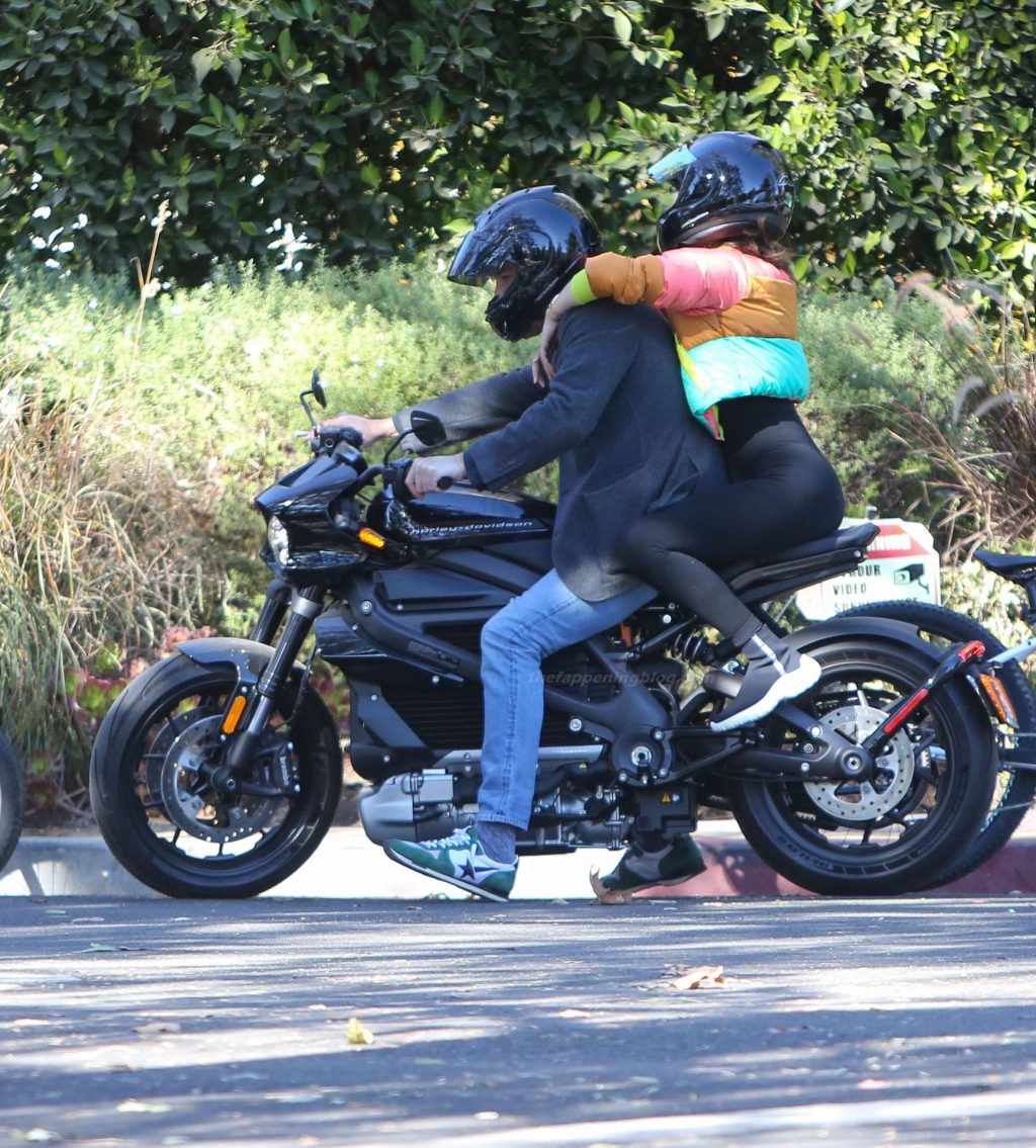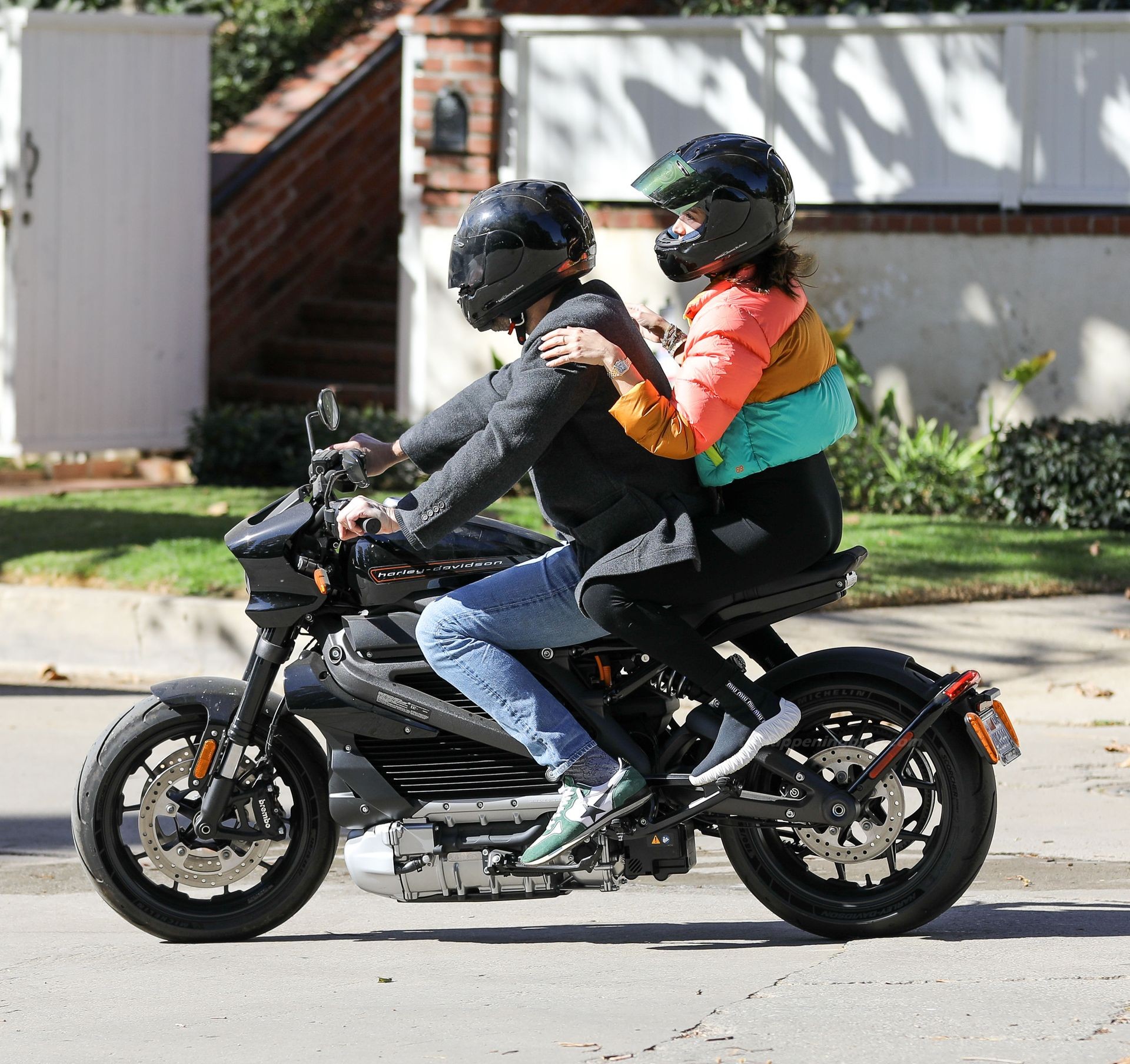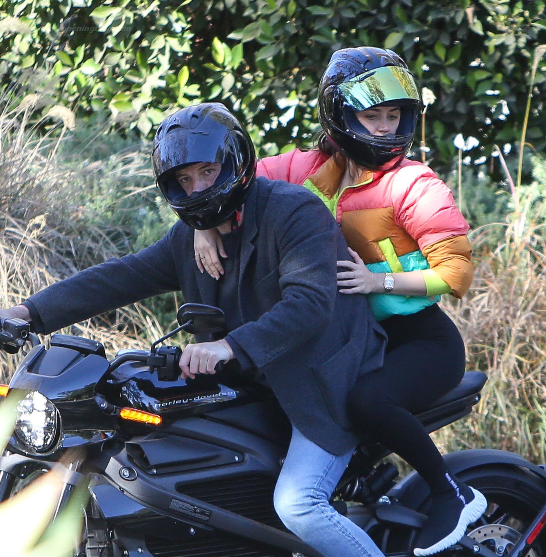 “Batman” estrella Ben Affleck es visto conduciendo una Harley Davidson LiveWire eléctrica con su novia, la actriz cubana Ana de Armas detrás de él y siguiendo a su hijo Samuel en una bicicleta en Brentwood, 27/11/2020.