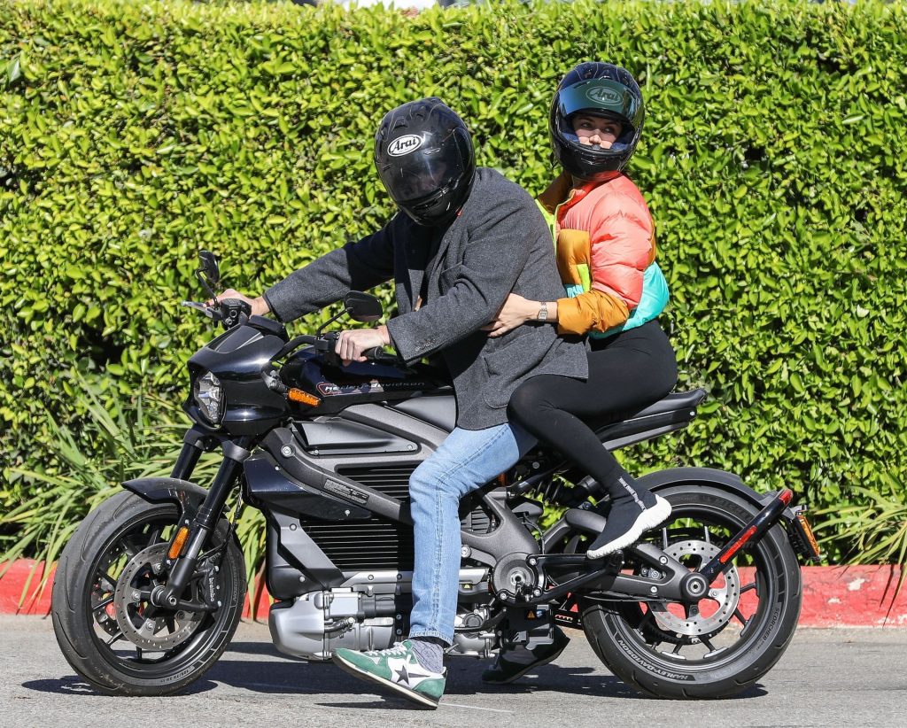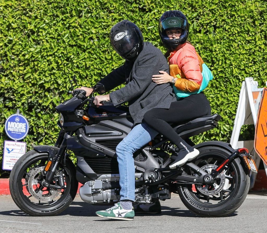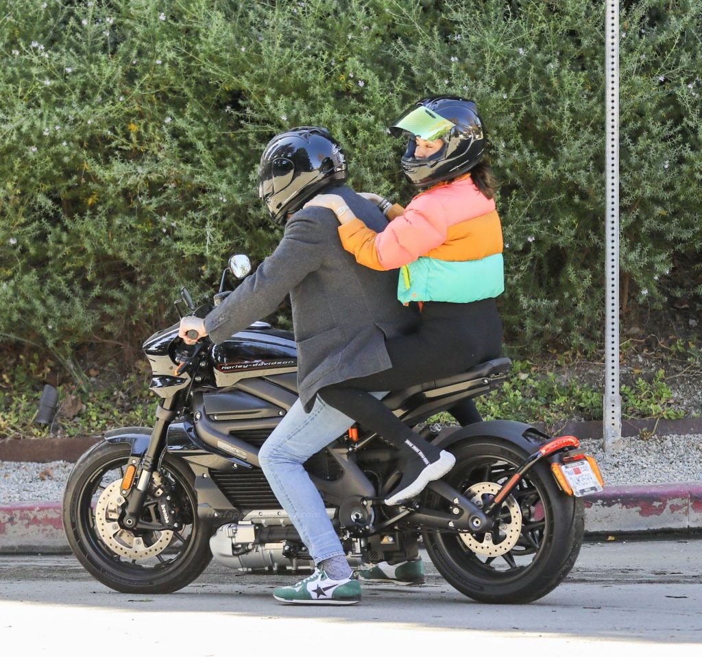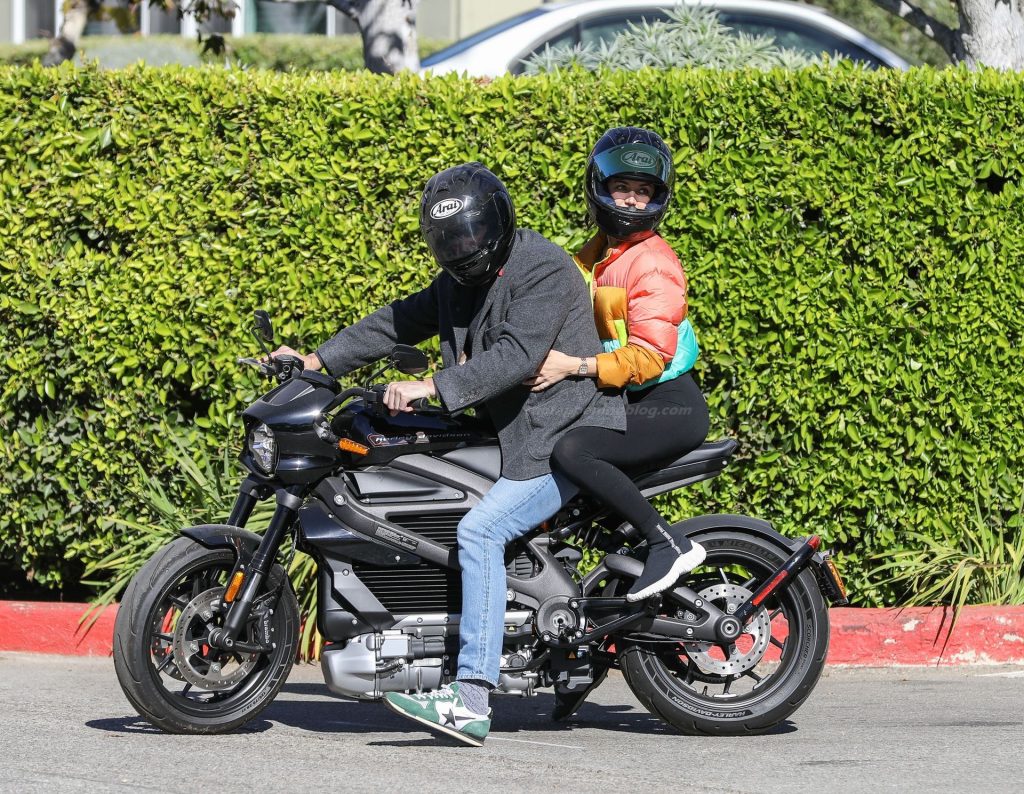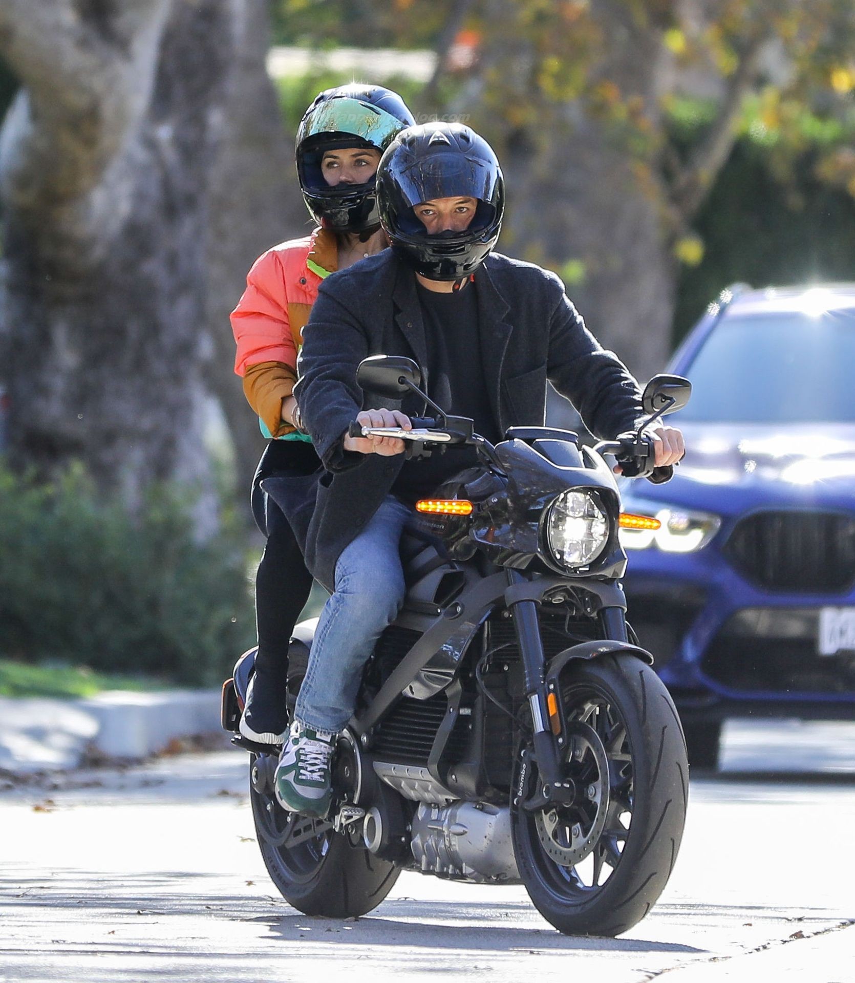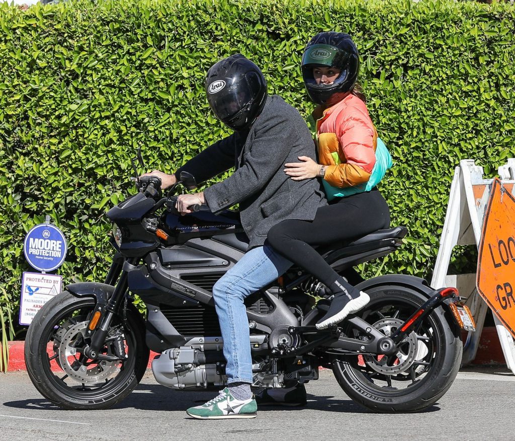 “Batman” estrella Ben Affleck es visto conduciendo una Harley Davidson LiveWire eléctrica con su novia, la actriz cubana Ana de Armas detrás de él y siguiendo a su hijo Samuel en una bicicleta en Brentwood, 27/11/2020.