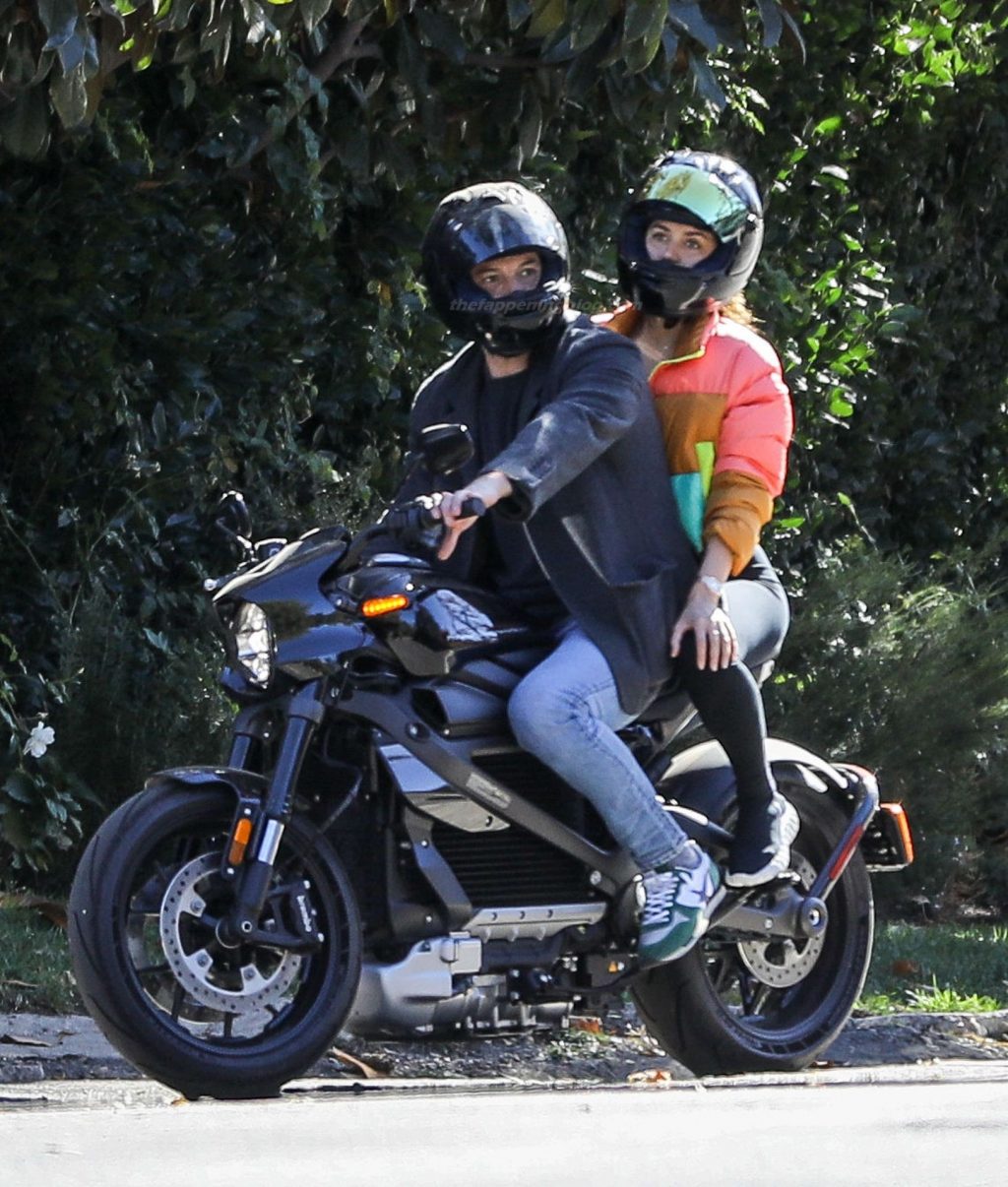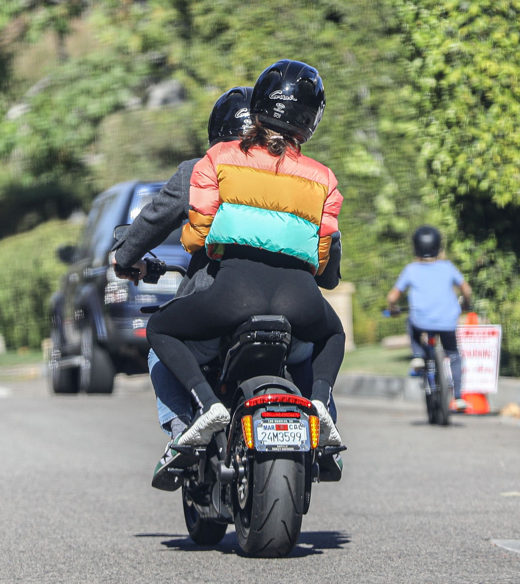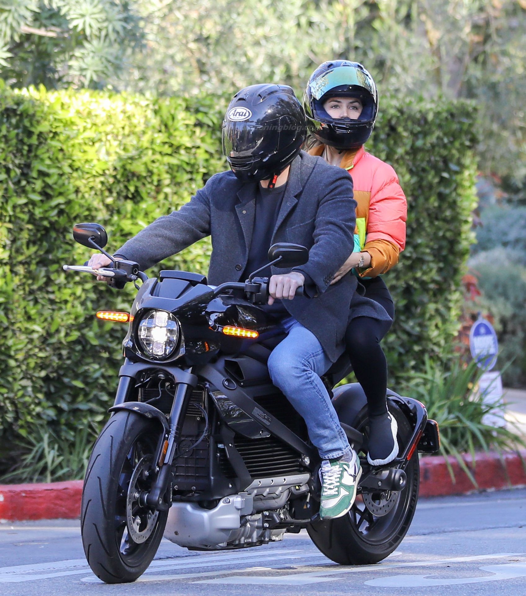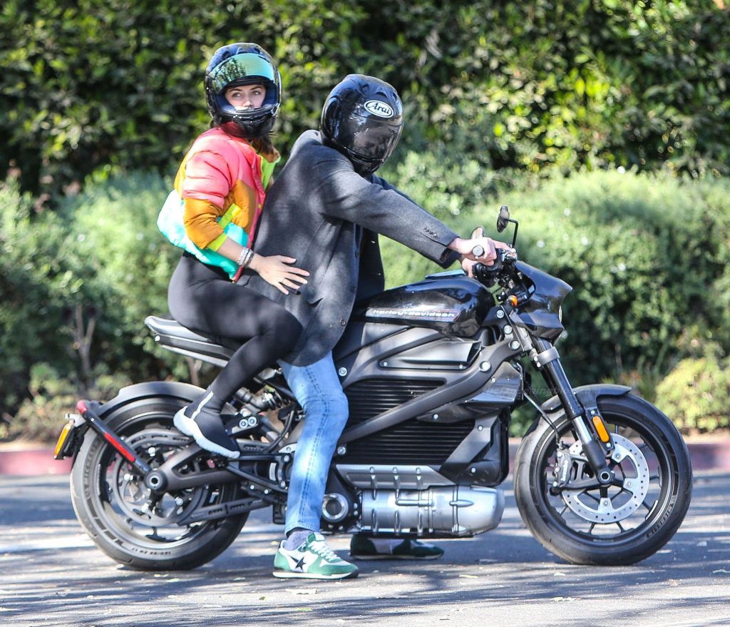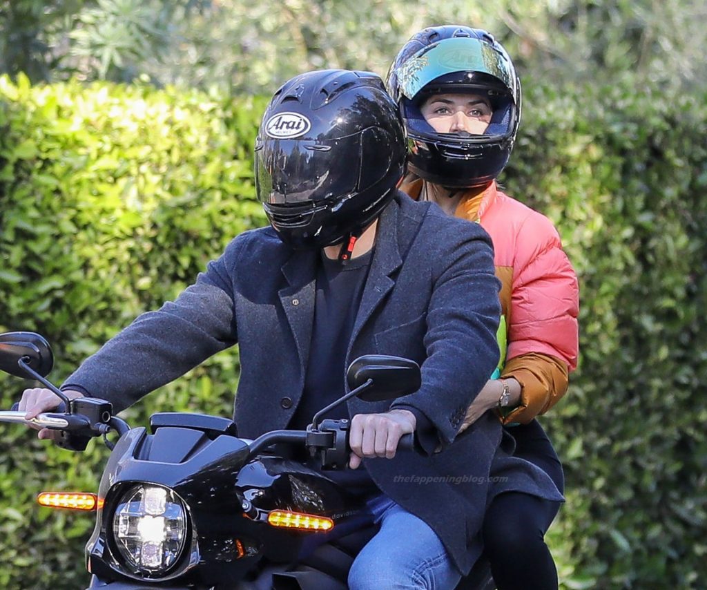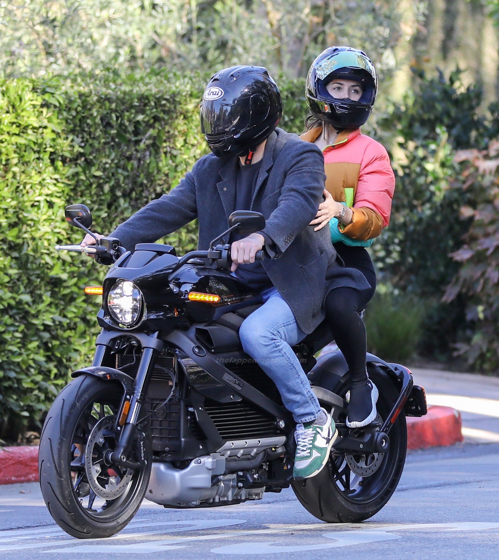 “Batman” estrella Ben Affleck es visto conduciendo una Harley Davidson LiveWire eléctrica con su novia, la actriz cubana Ana de Armas detrás de él y siguiendo a su hijo Samuel en una bicicleta en Brentwood, 27/11/2020.