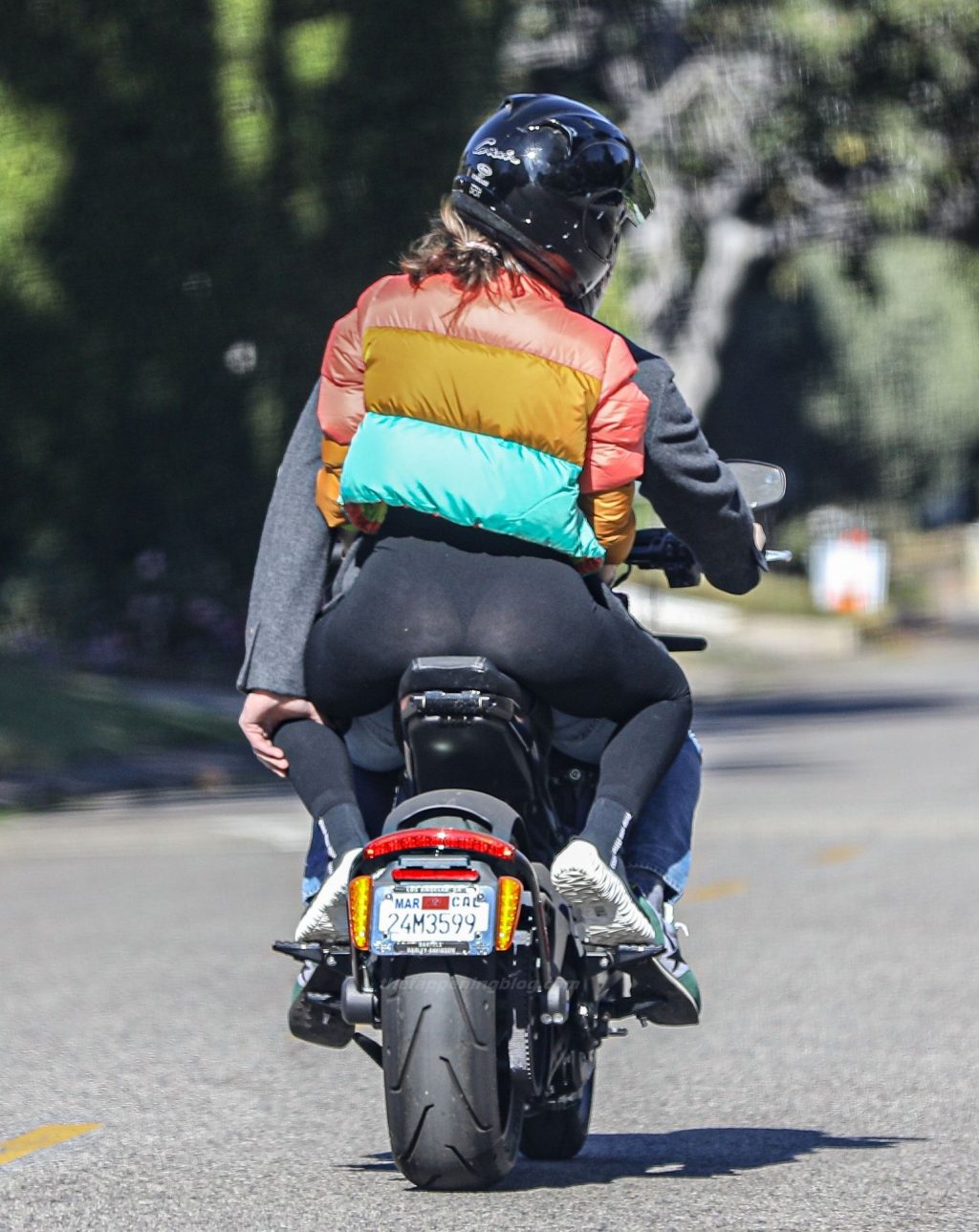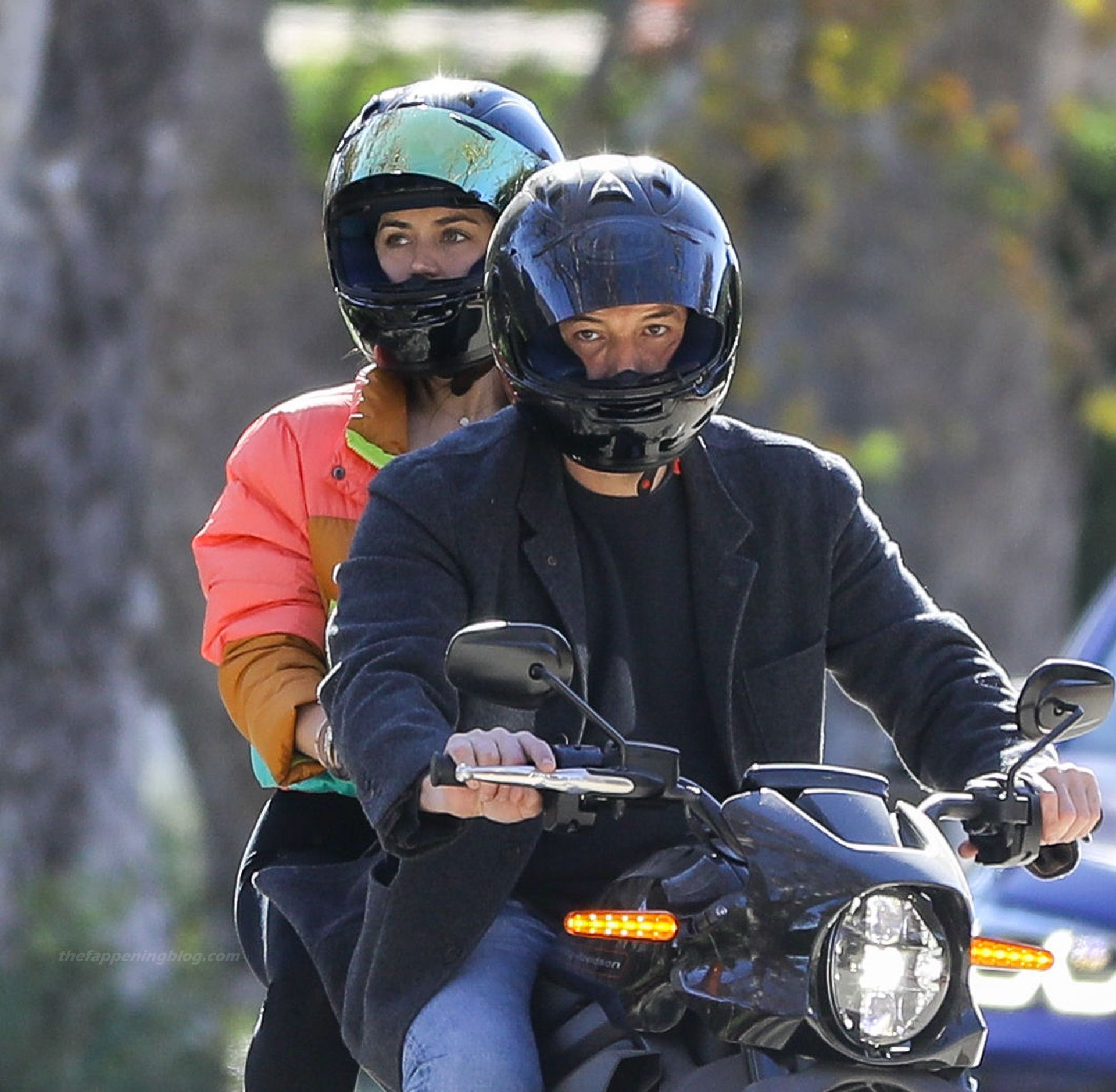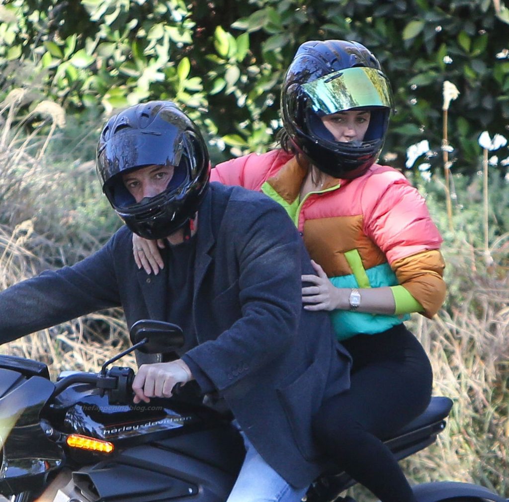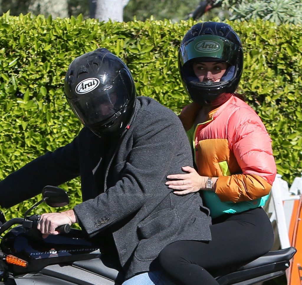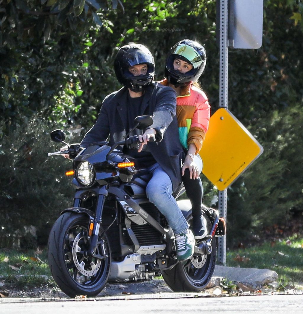 “Batman” estrella Ben Affleck es visto conduciendo una Harley Davidson LiveWire eléctrica con su novia, la actriz cubana Ana de Armas detrás de él y siguiendo a su hijo Samuel en una bicicleta en Brentwood, 27/11/2020.