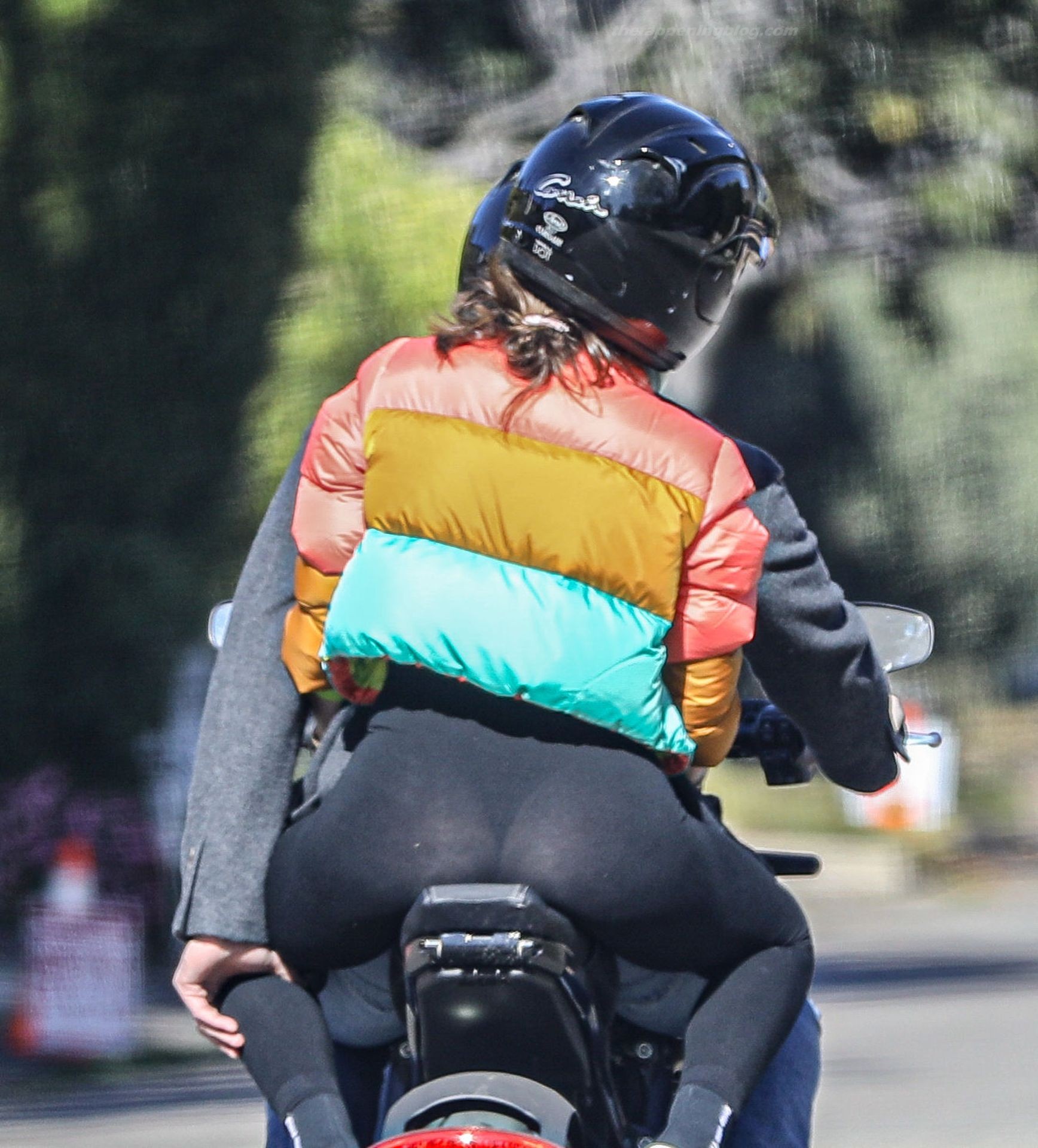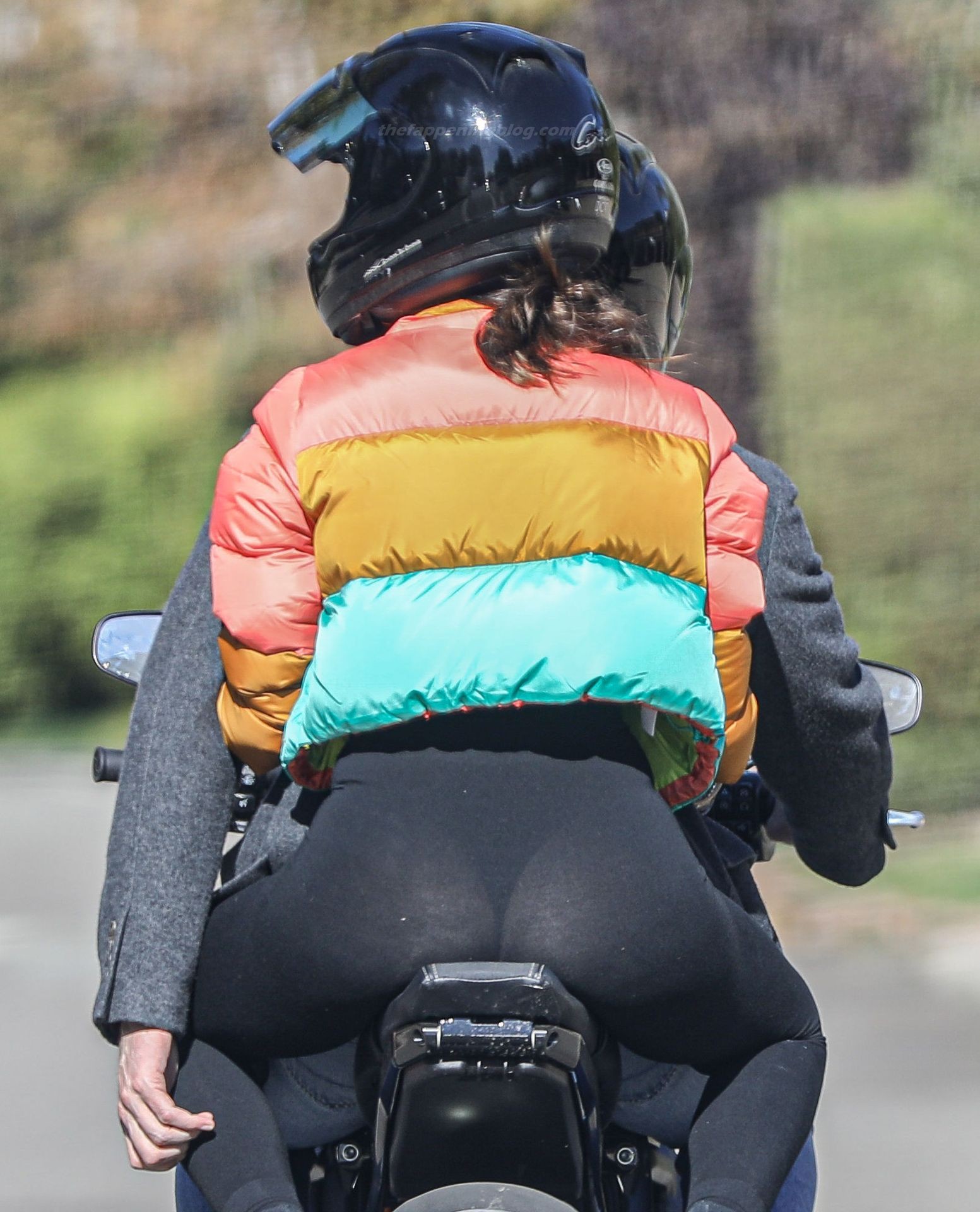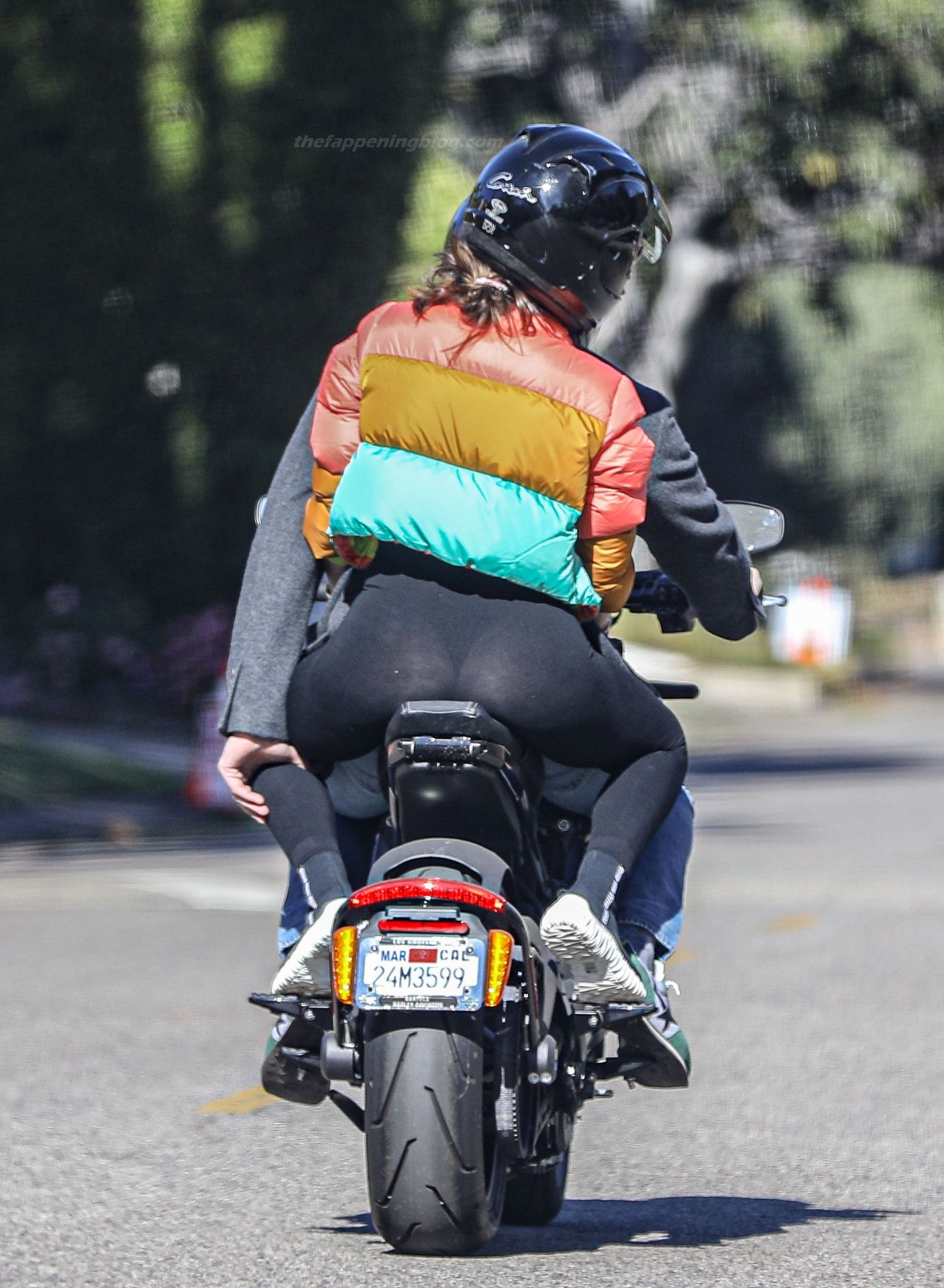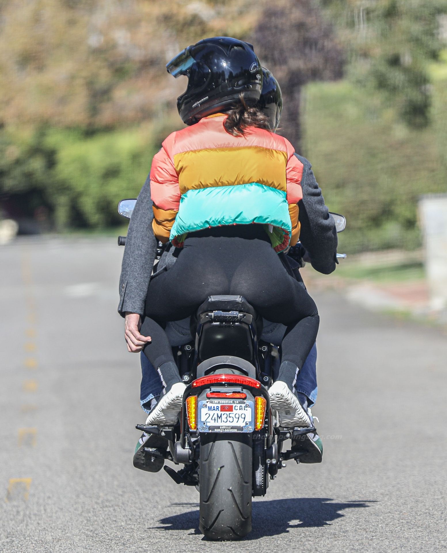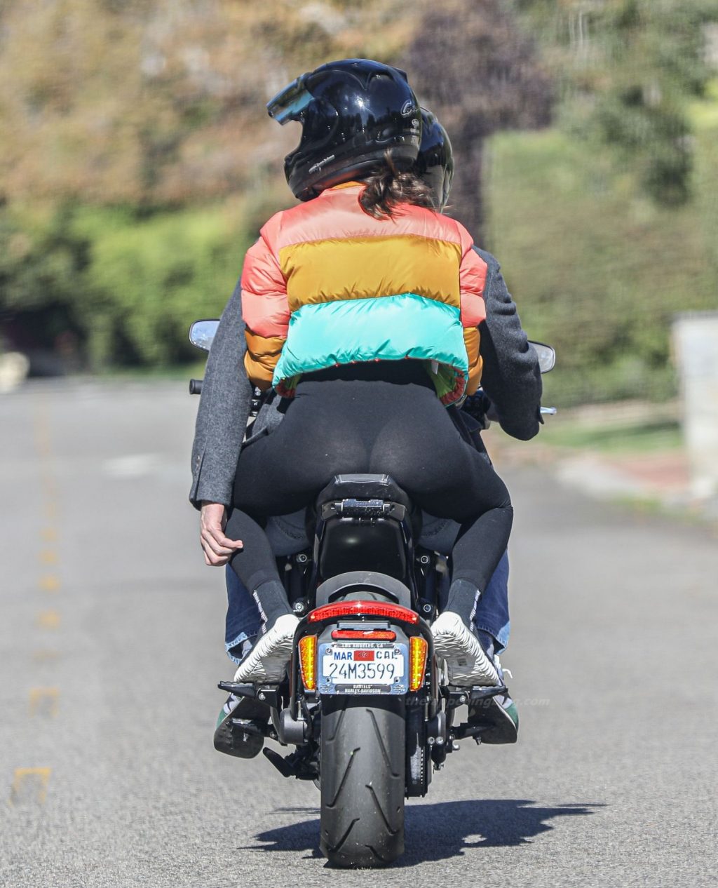 “Batman” estrella Ben Affleck es visto conduciendo una Harley Davidson LiveWire eléctrica con su novia, la actriz cubana Ana de Armas detrás de él y siguiendo a su hijo Samuel en una bicicleta en Brentwood, 27/11/2020.