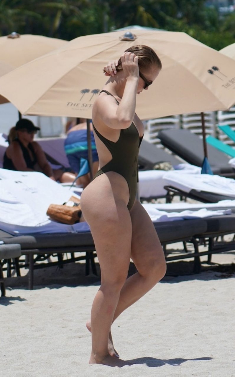 Bianca Elouise muestra sus curvas con un traje de baño escotado junto a amigos en la playa de Miami, 16/07/2019.